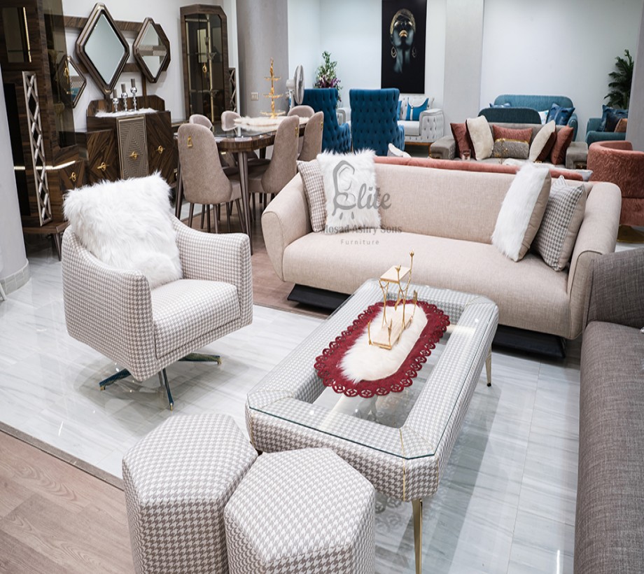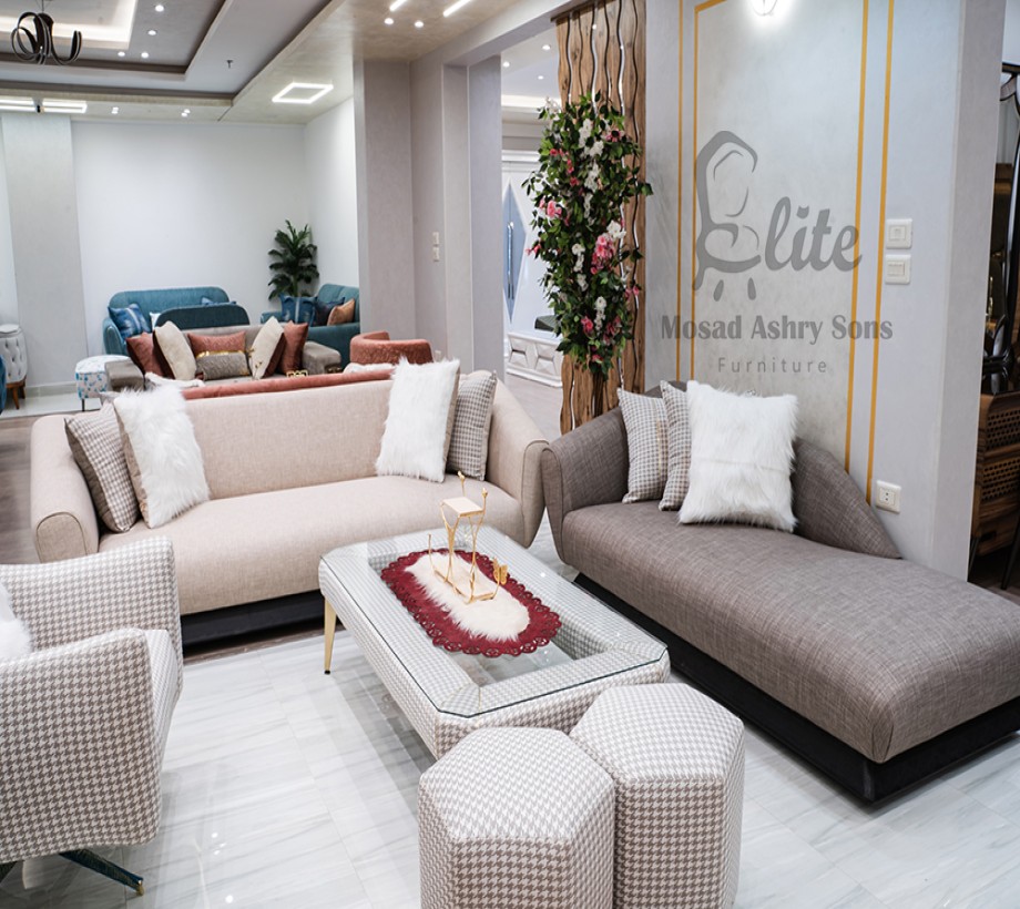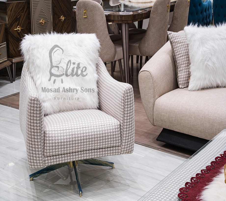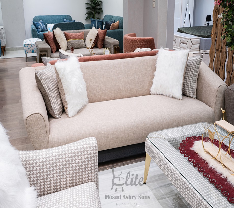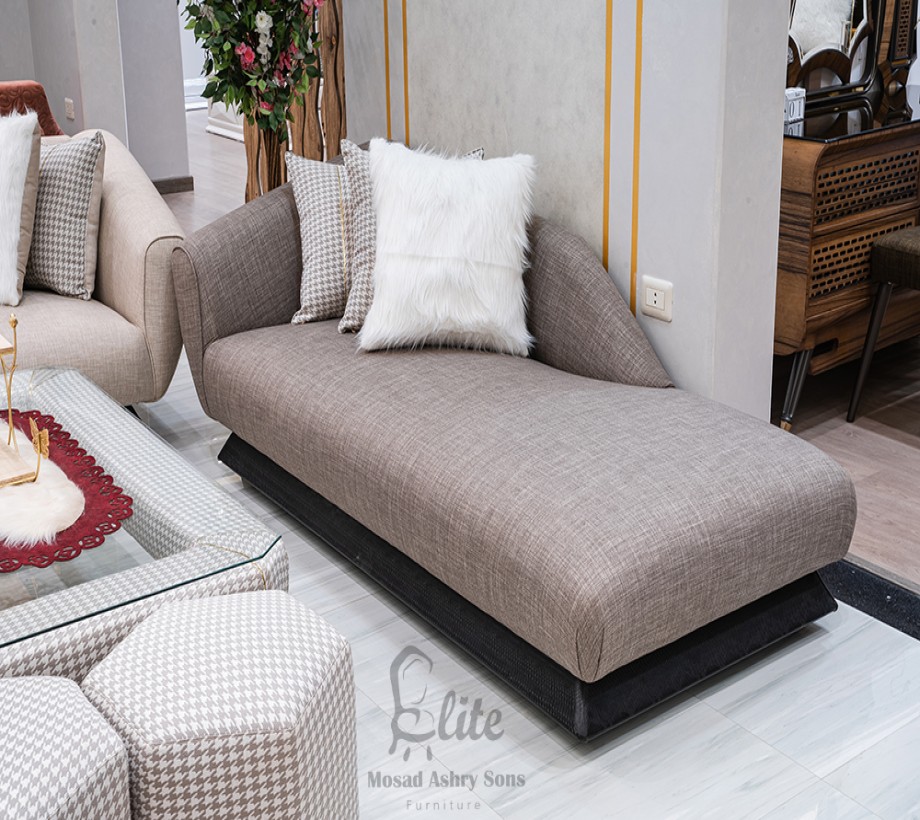 غرفة مكونة من كنبة كبيرة 3 مقعد مع شازلونج وفوتيه و2 بوف مع ترابيزة بطابع عصرى غرفة مصنعة من قماش الكتان والخشب الطبيعى