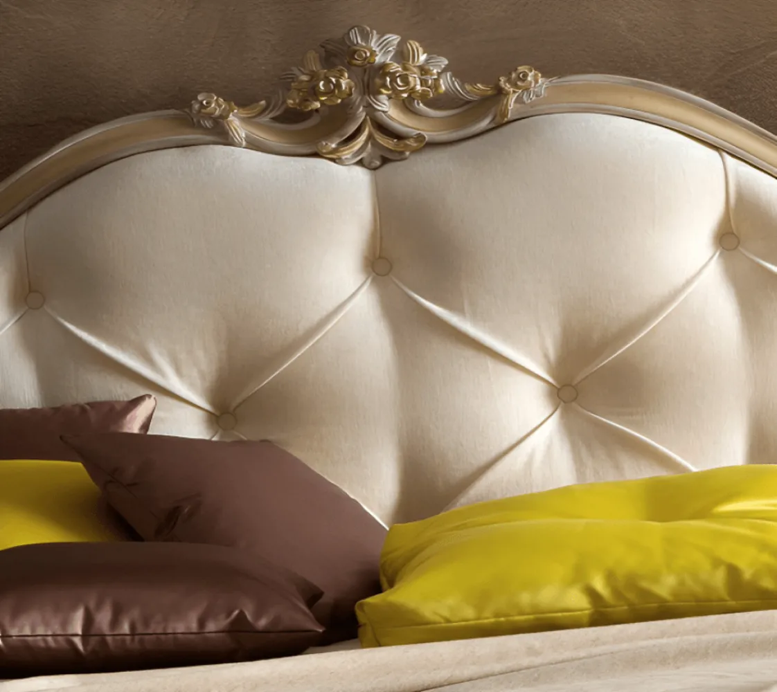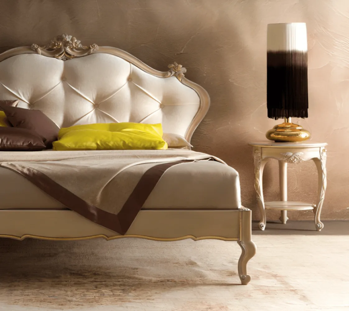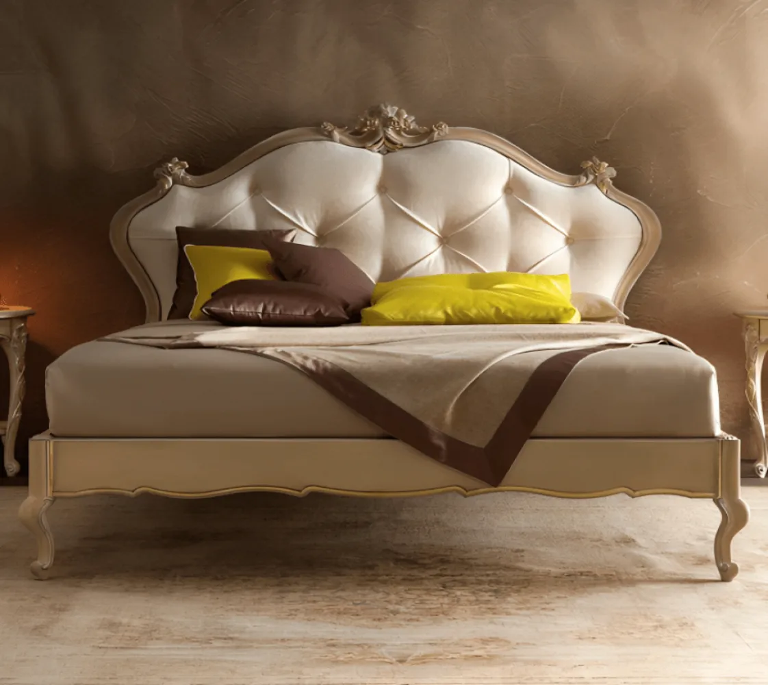 سرير كلاسيكى بتصميم إيطالي راقى . صنع السرير من خشب الزان و خامات عالية الجودة. السرير في لون بيج رائع ، يزيد من أناقة ورقي الغرفة.