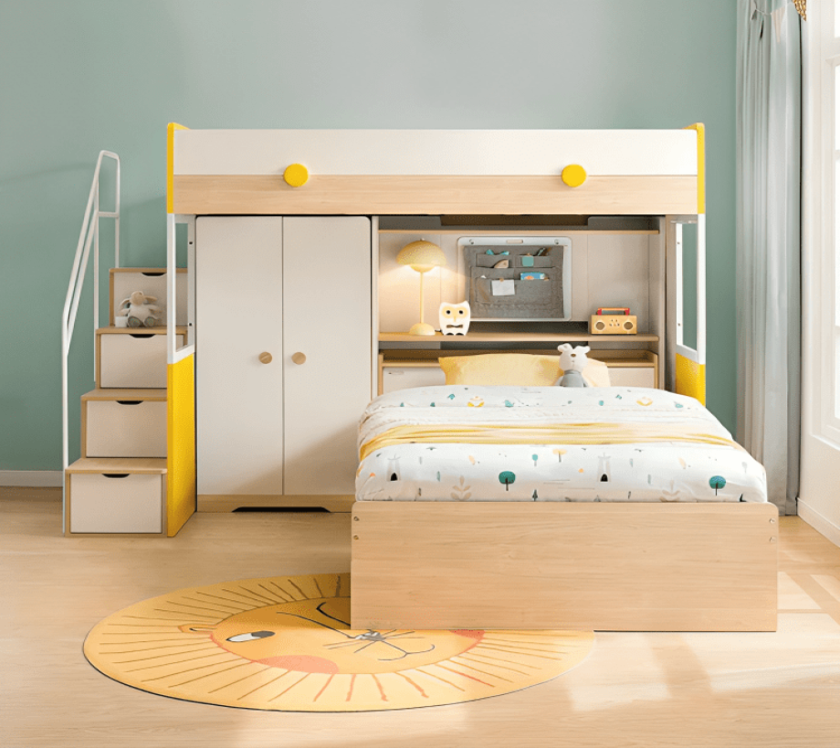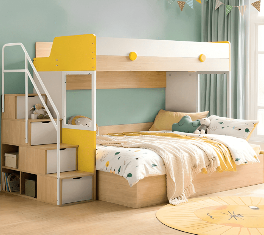 سرير مزدوج مع وحدة ادراج وحدات تخزين يتميز السرير بسلم مريح وآمن مدمج يسهل للأطفال الصعود والنزول من الطابق العلوي.