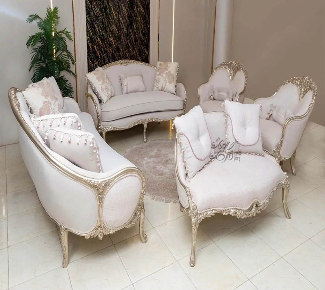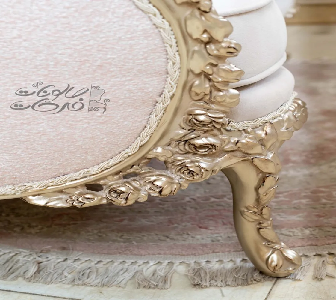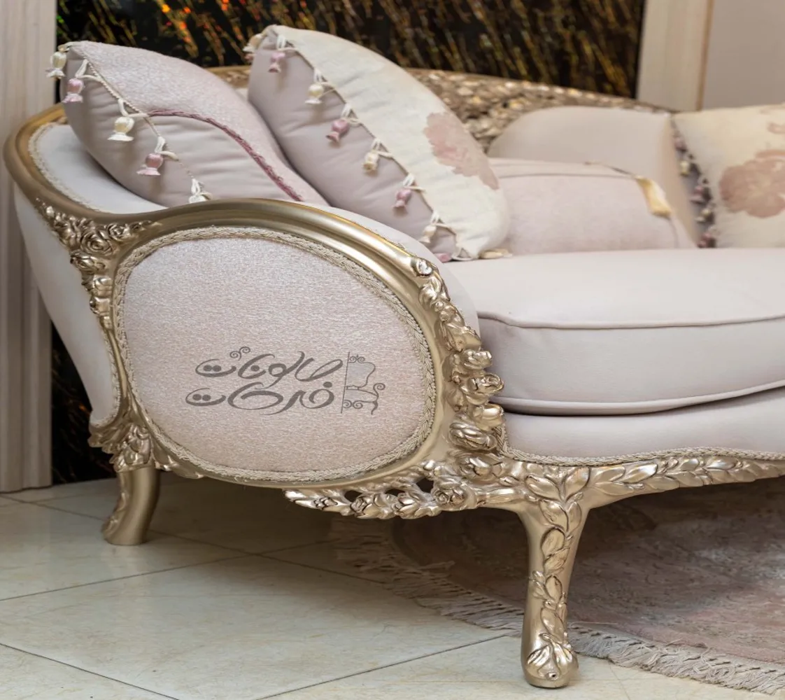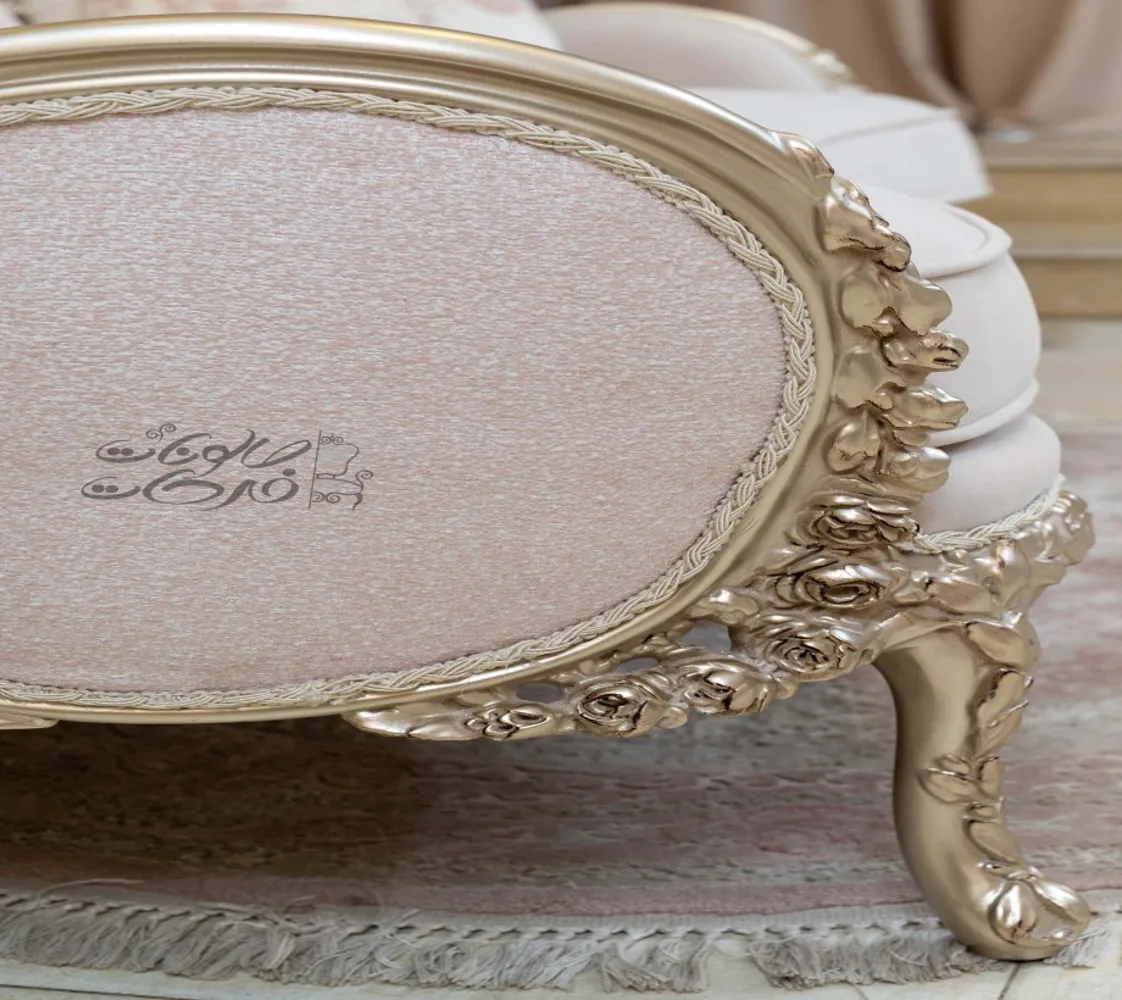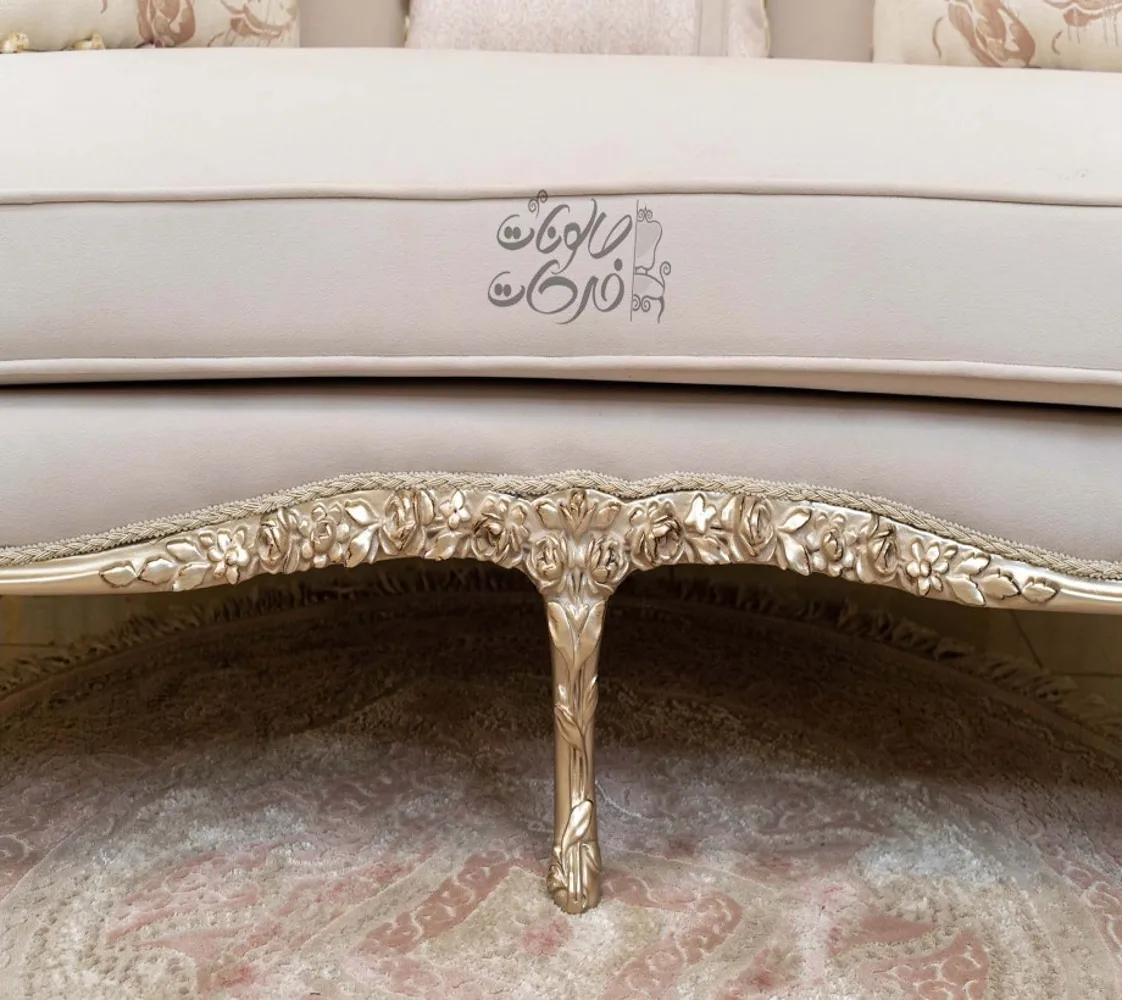 صالون نيو كلاسيك مكون من : كنبه كبيرة . كنبه ثنائى 2 مقعد . 2 فوتيه . بانكيت . ترابيزة رخام الصالون مصنع من خشب الزان الطبيعى بطابع كلاسيكى مميز