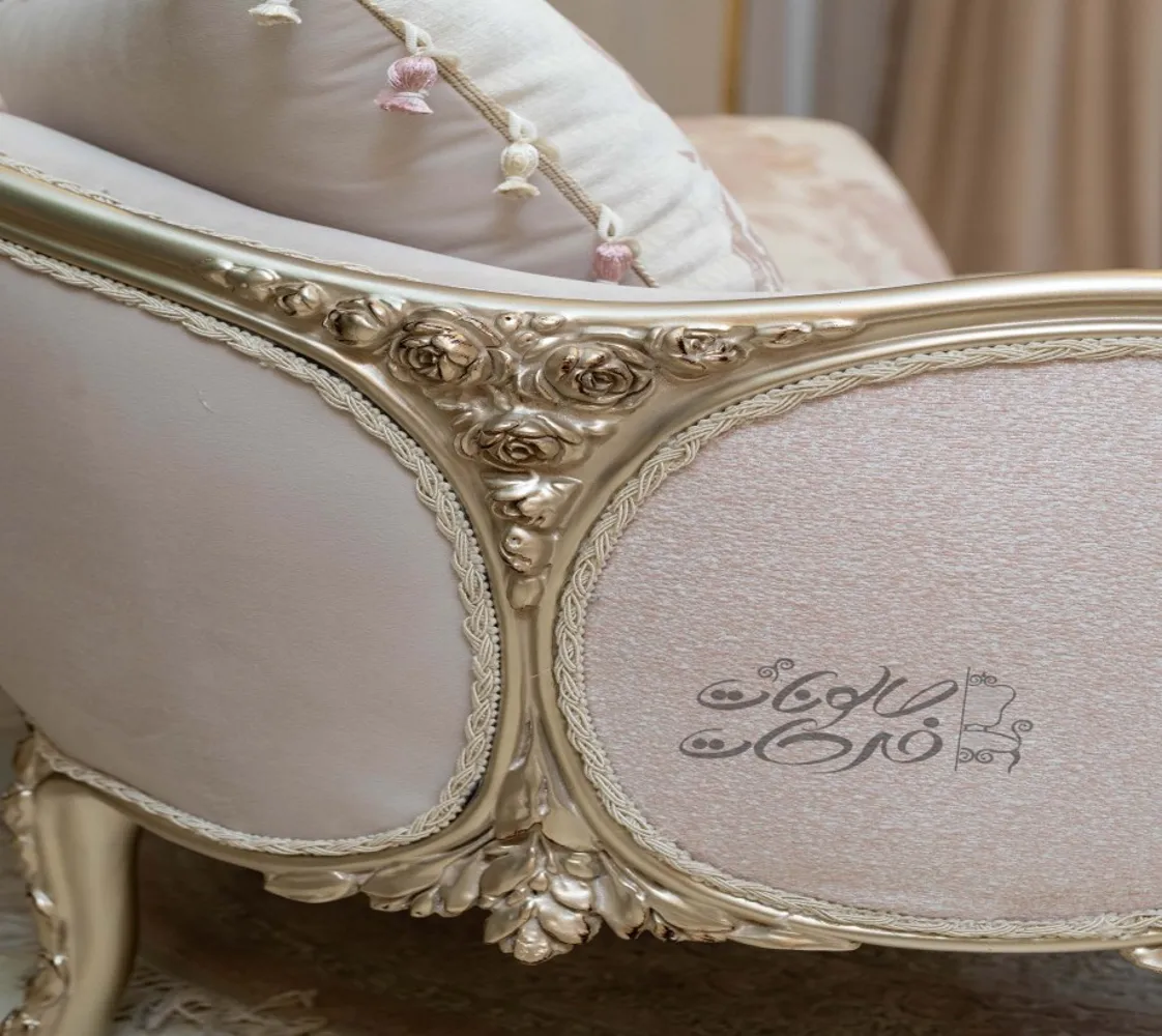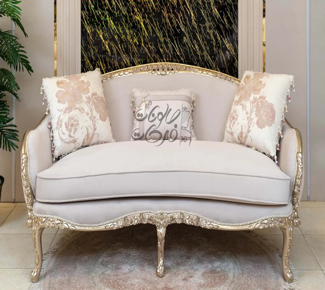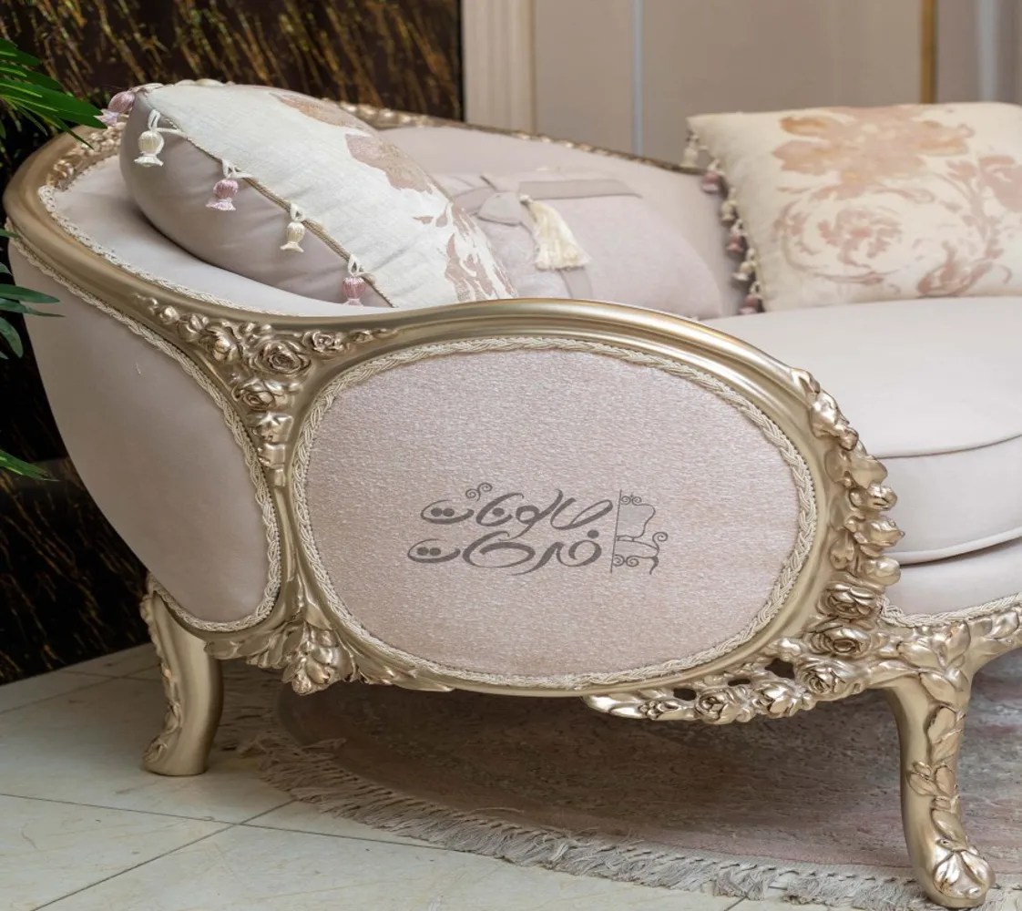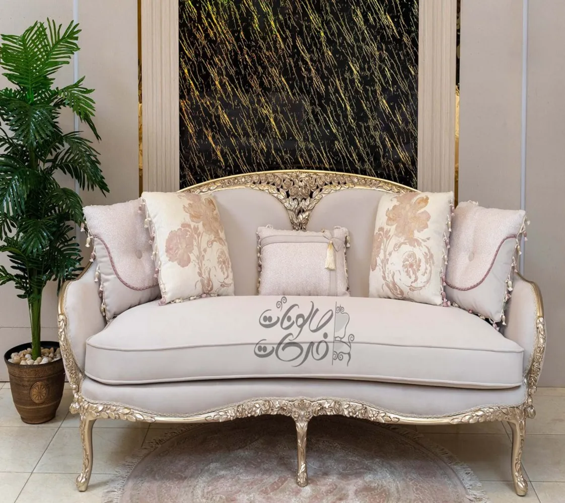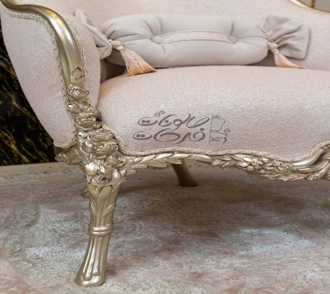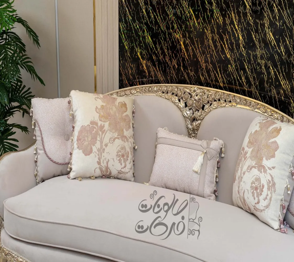 صالون نيو كلاسيك مكون من : كنبه كبيرة . كنبه ثنائى 2 مقعد . 2 فوتيه . بانكيت . ترابيزة رخام الصالون مصنع من خشب الزان الطبيعى بطابع كلاسيكى مميز