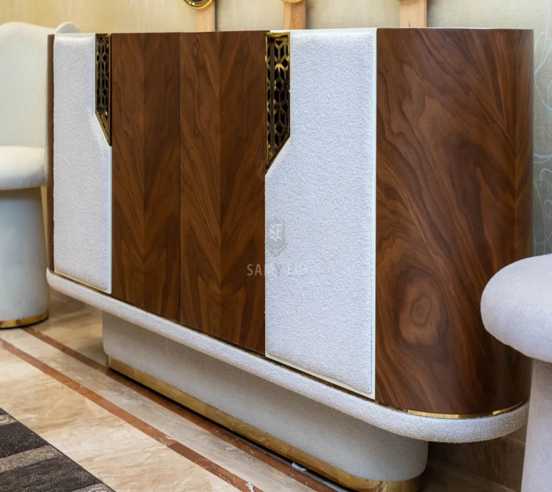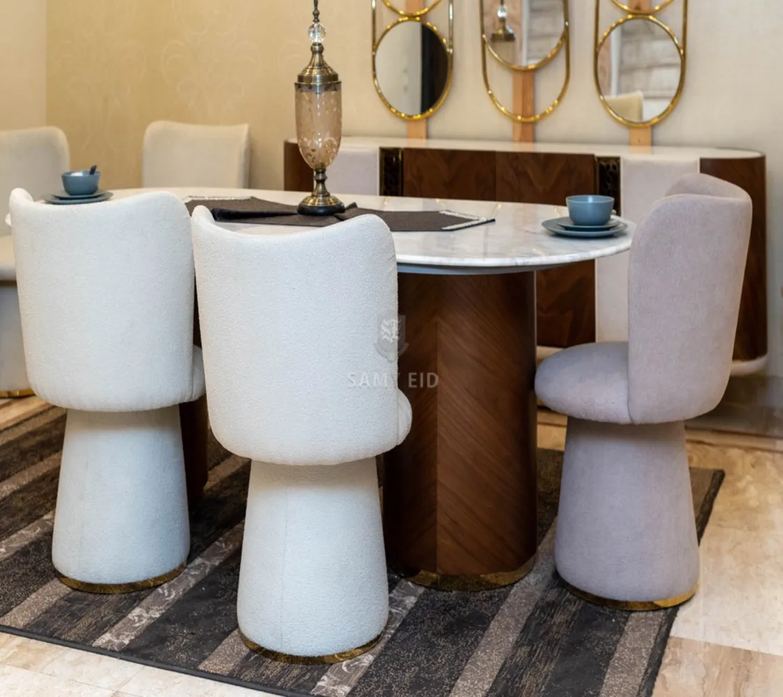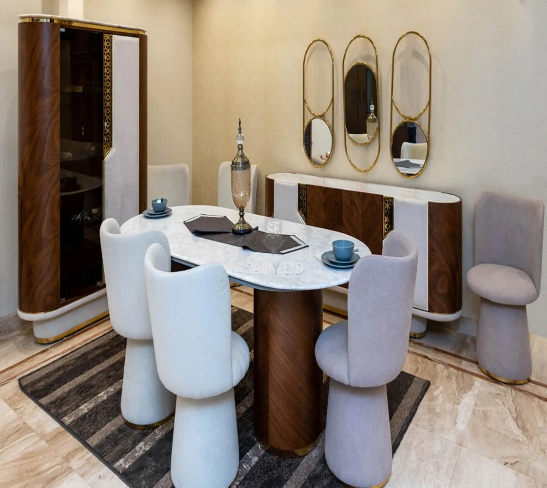 غرفة طعام مكونة من : ترابيزة . 6 كراسي . بوفيه . نيش . مرايا مودرن الغرفة مصنوعه من خشب الزان الطبيعى بطابع عصرى مميز يليق بمنزلك