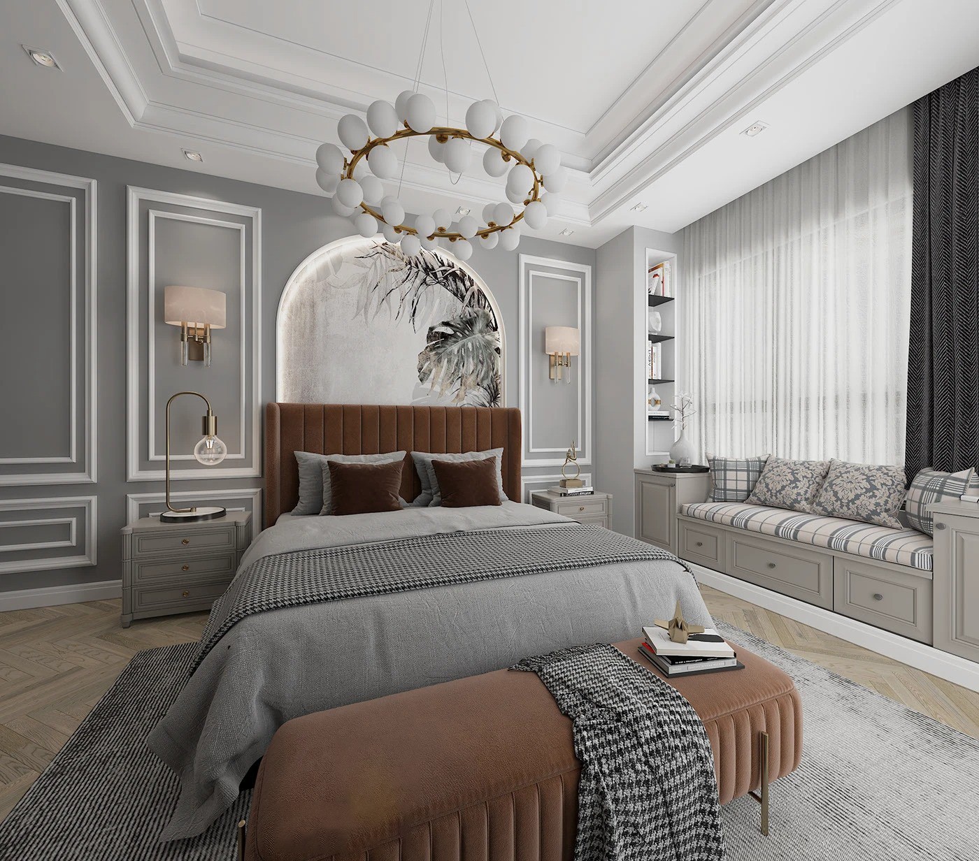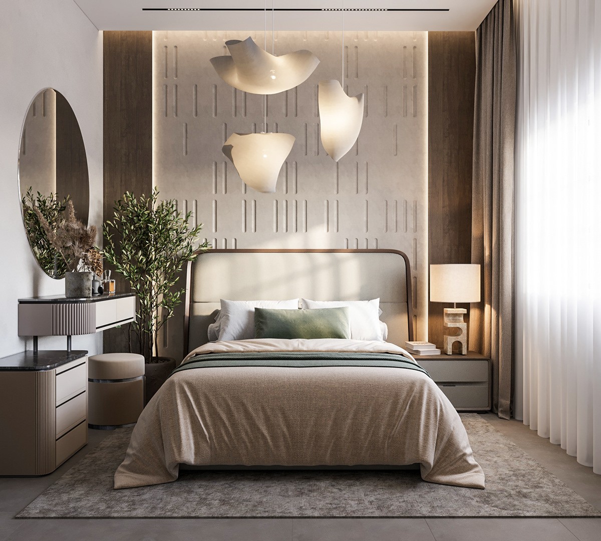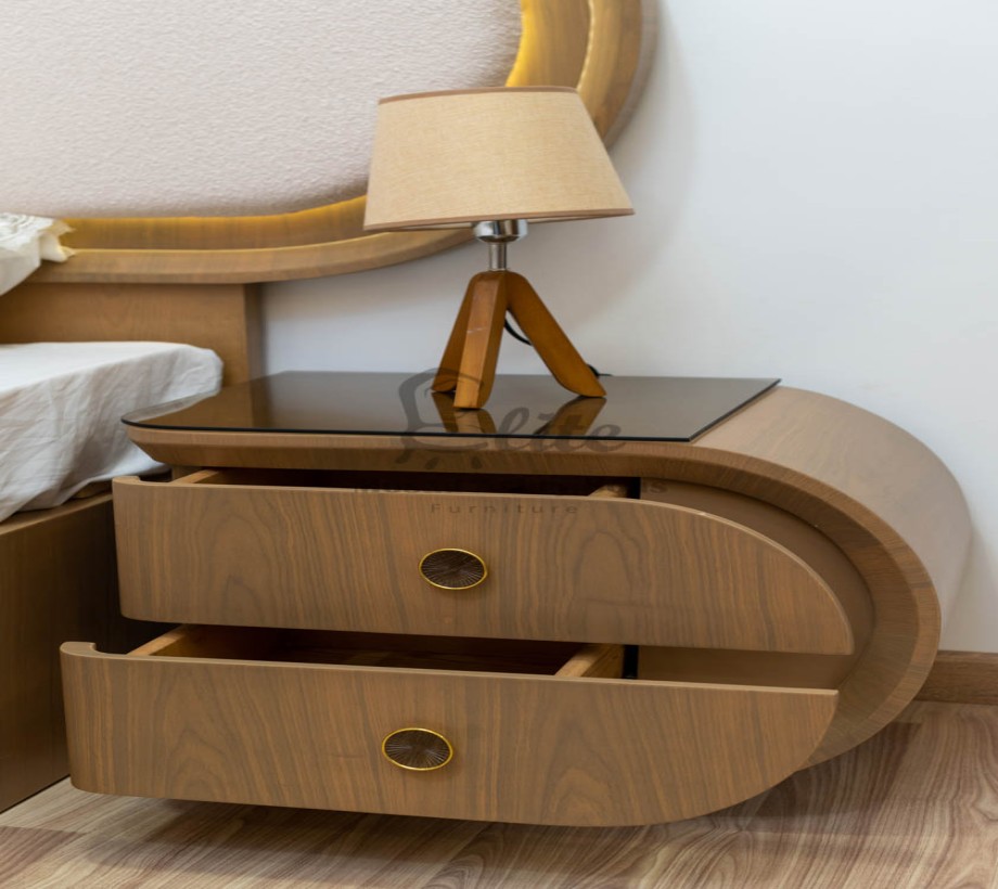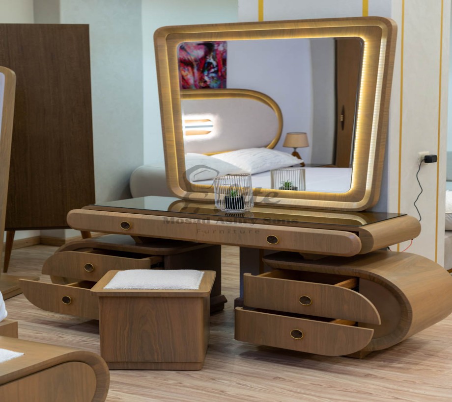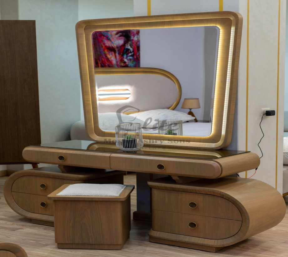 غرفة نوم مكونة من : سرير . دولاب تقسيم دريسينج . 2 كومود . تسريحه . بف تسريحة . بانكيت الغرفة مصنوعه من خشب الزان الطبيعى بطابع عصرى مميز يليق بمنزلك