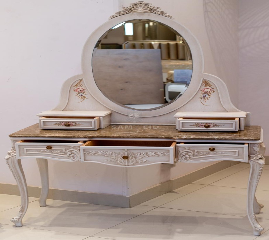 الغرفة مكونة من : 2 سرير . دولاب كلاسيك . 2 كومود . تسريحه . كرسى تسريحة كلاسيك الغرفة مصنوعه من خشب الزان الطبيعى بطابع كلاسيكى مميز