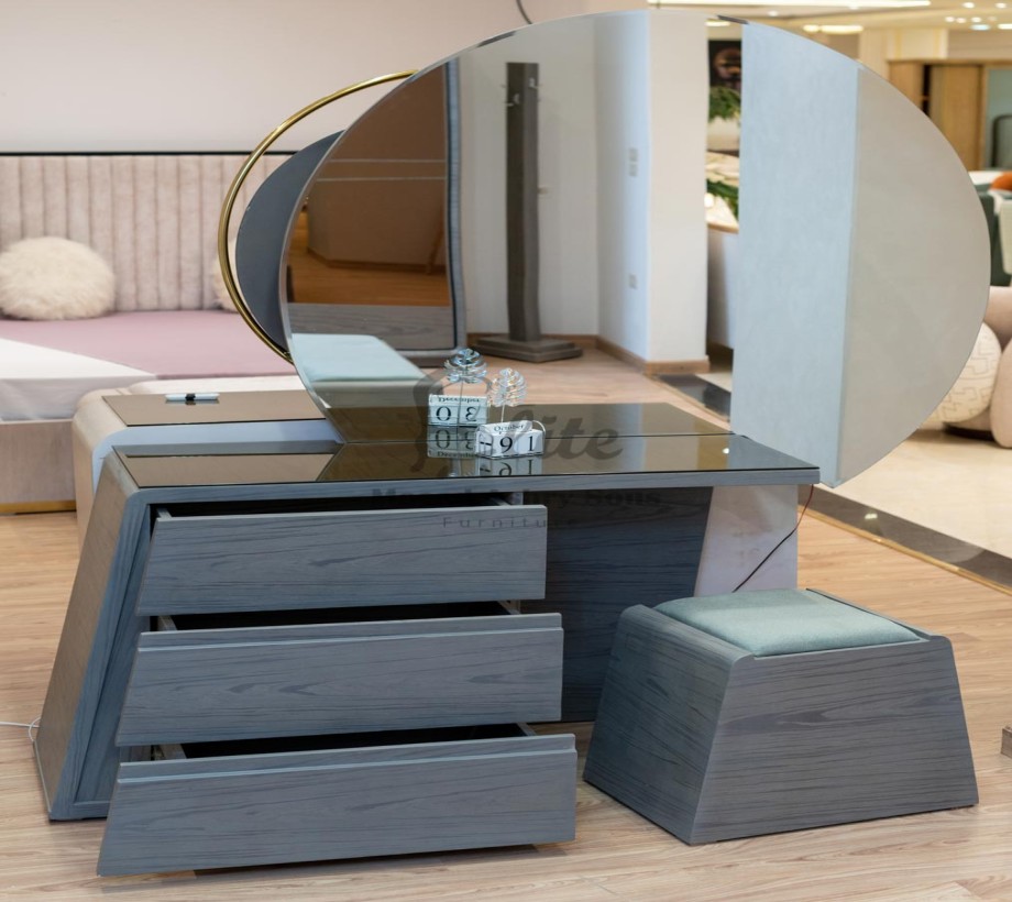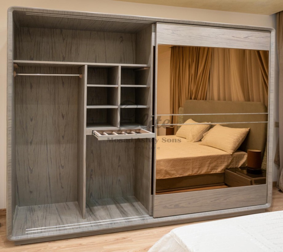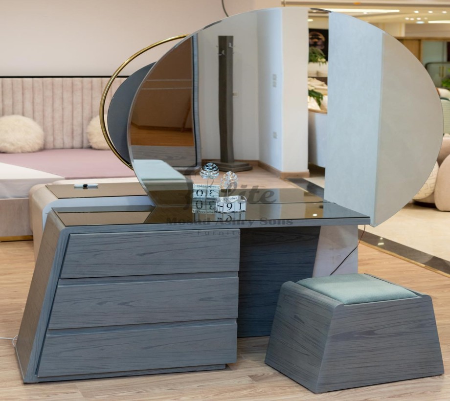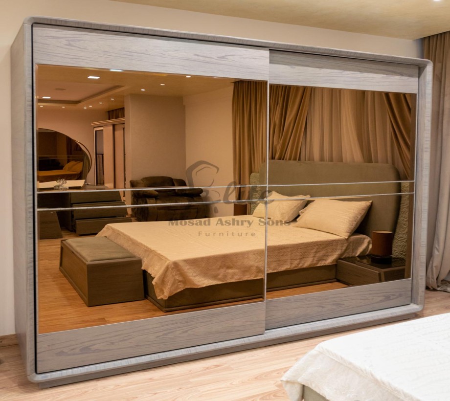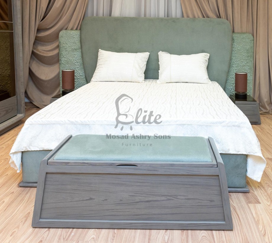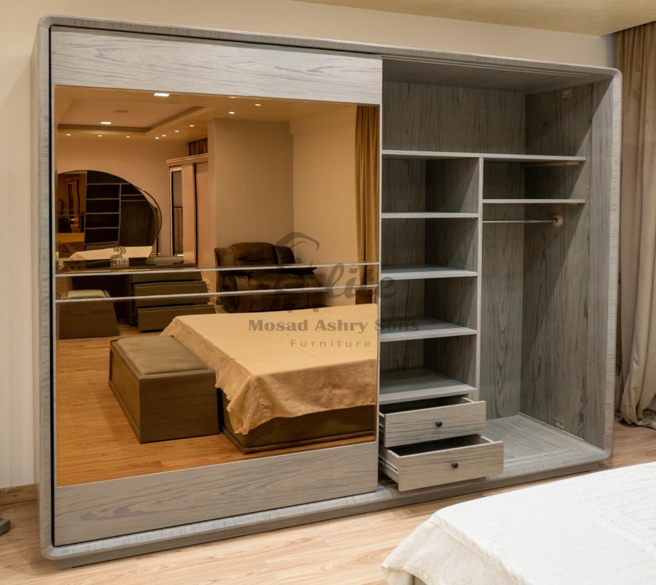 غرفة نوم مكونة من : سرير . دولاب تقسيم دريسينج . 2 كومود . تسريحه . بف تسريحة . بانكيت .شماعة ملابس الغرفة مصنوعه من خشب الزان الطبيعى بطابع عصرى مميز يليق بمنزلك