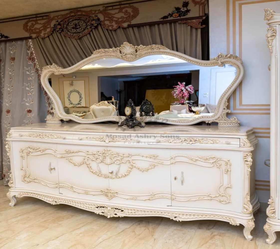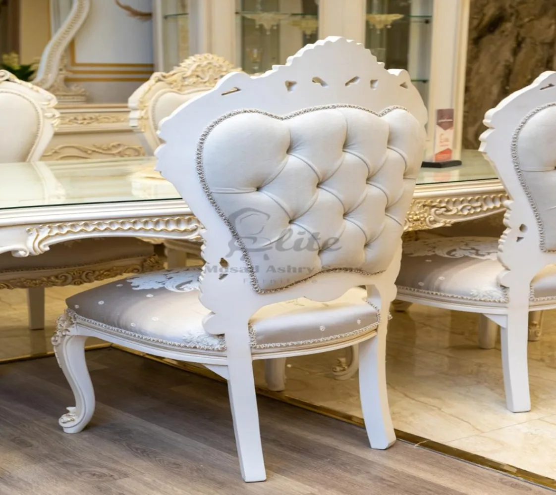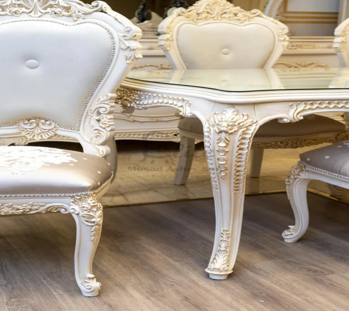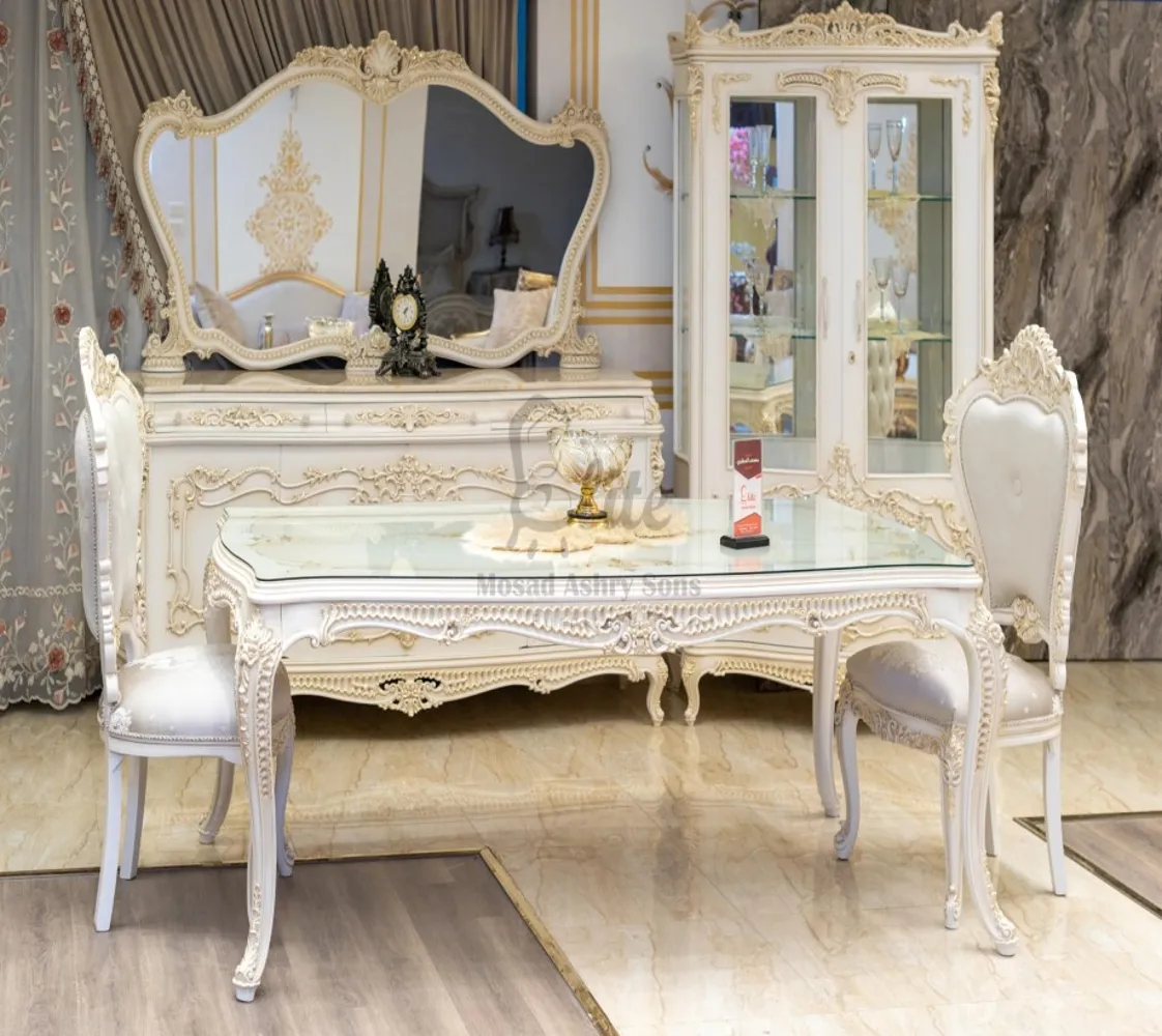 مكونة من : ترابيزة . 6كراسى . بوفيه . نيش . برواز مرايا كلاسيك غرفة طعام مصنعه من خشب الزان الطبيعى بطابع كلاسيكى مميز
