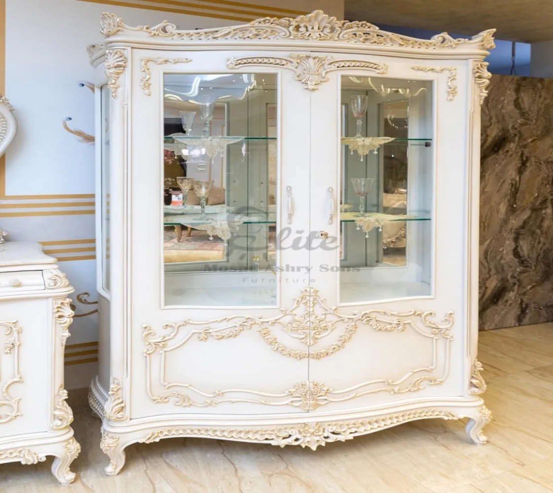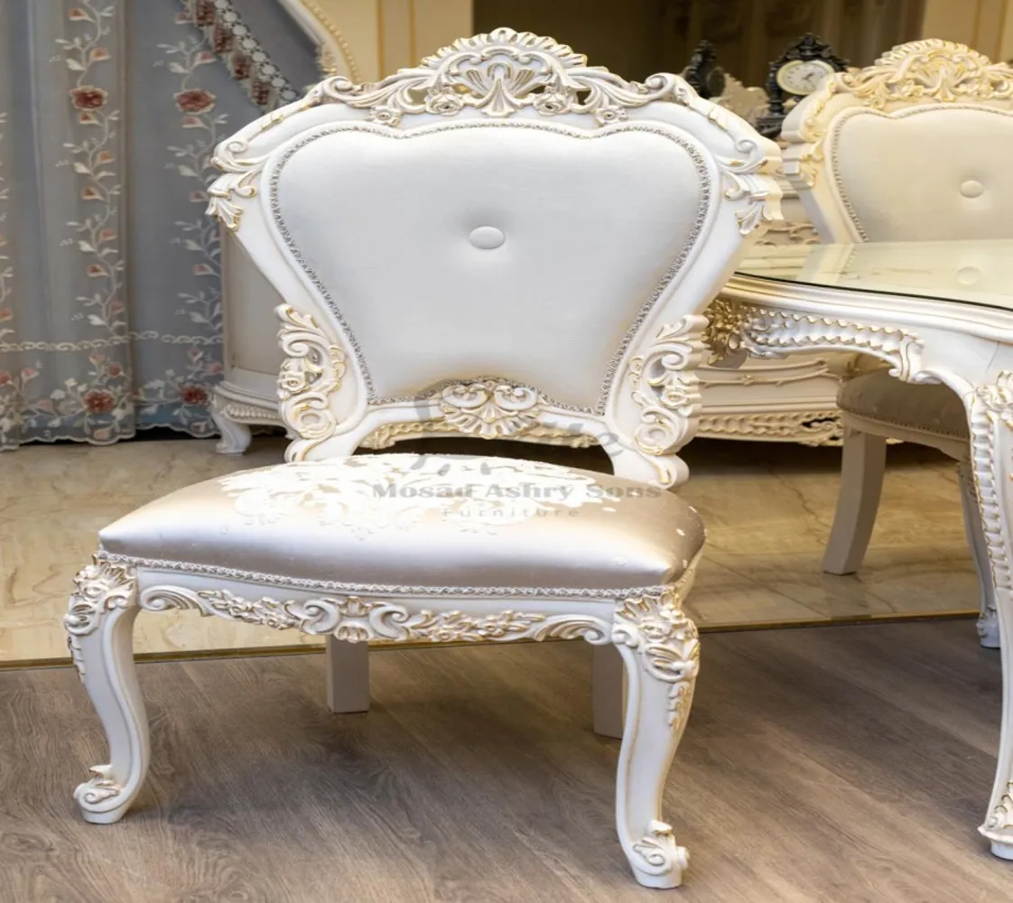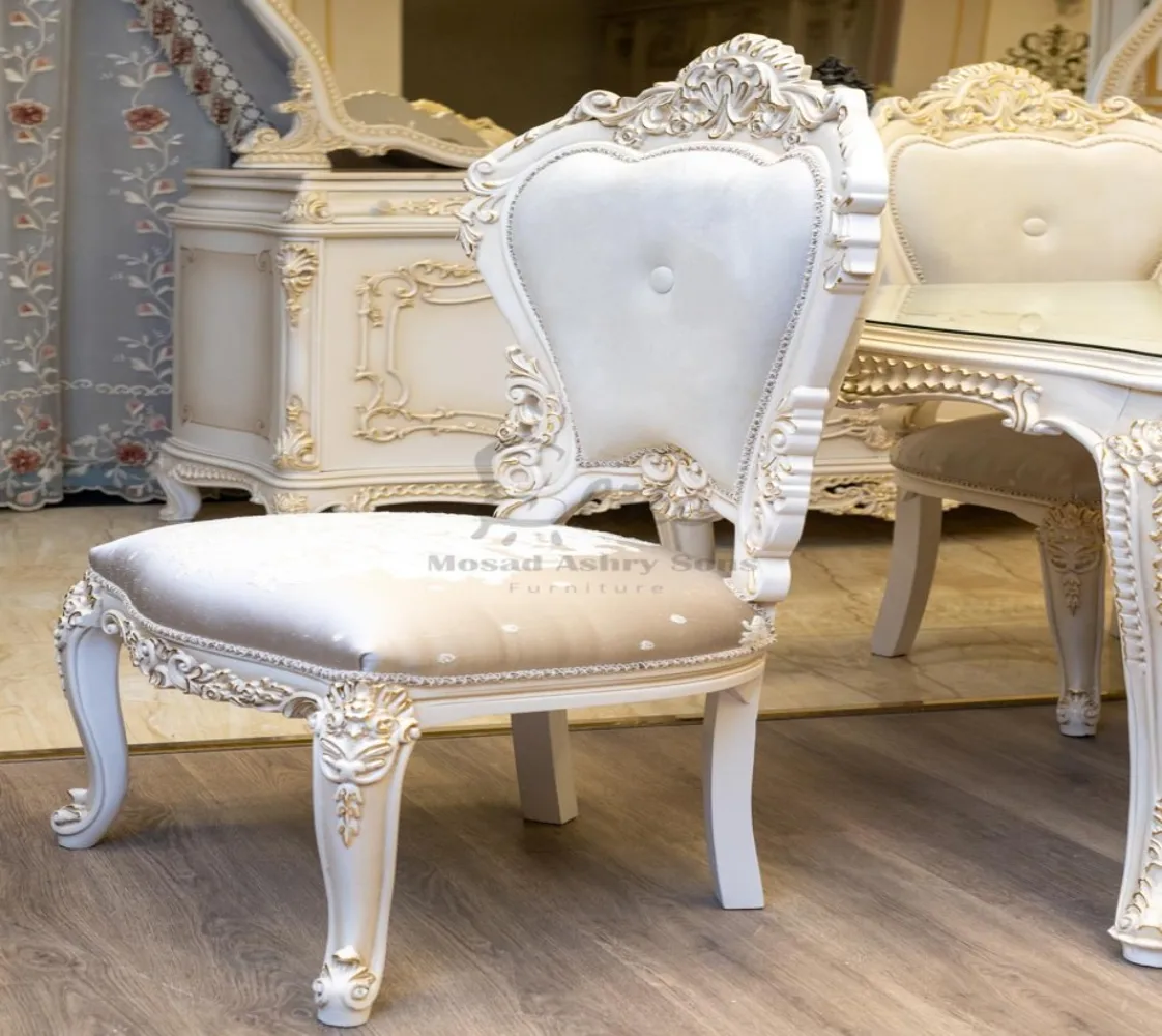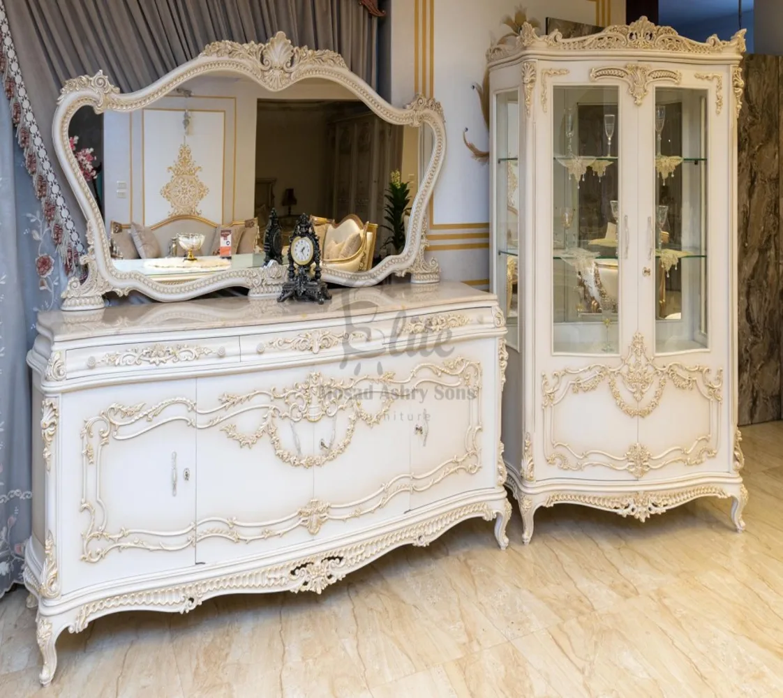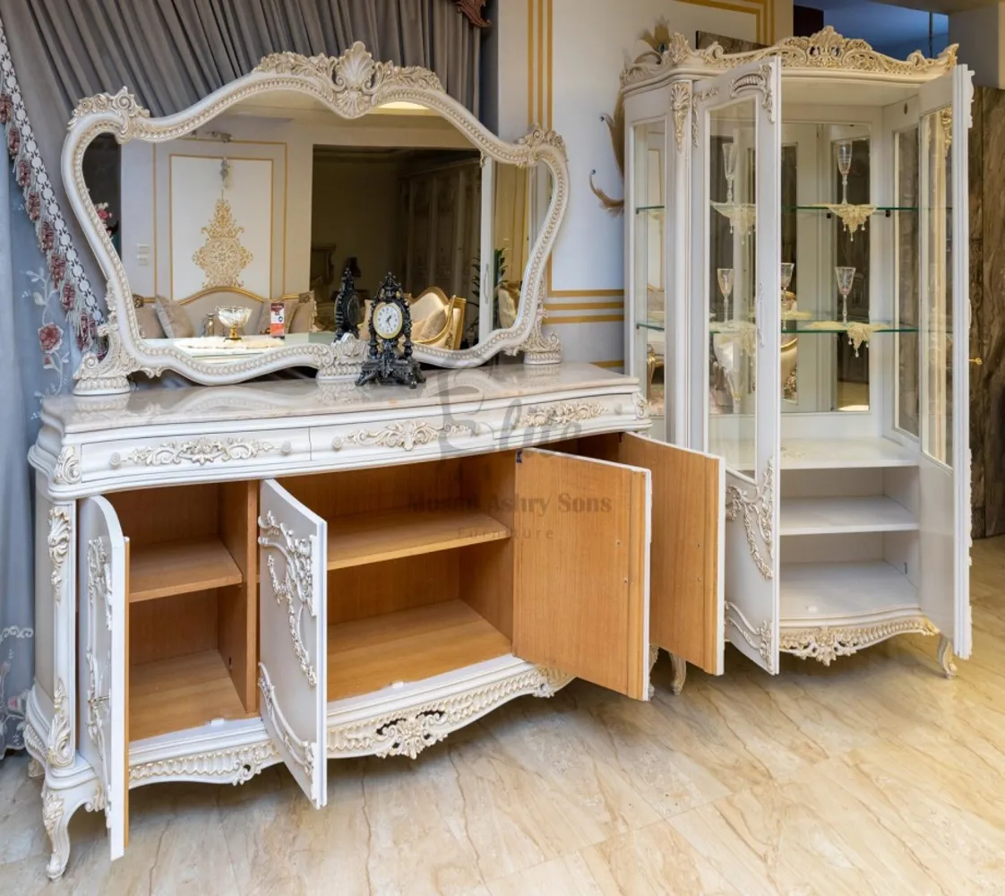 مكونة من : ترابيزة . 6كراسى . بوفيه . نيش . برواز مرايا كلاسيك غرفة طعام مصنعه من خشب الزان الطبيعى بطابع كلاسيكى مميز