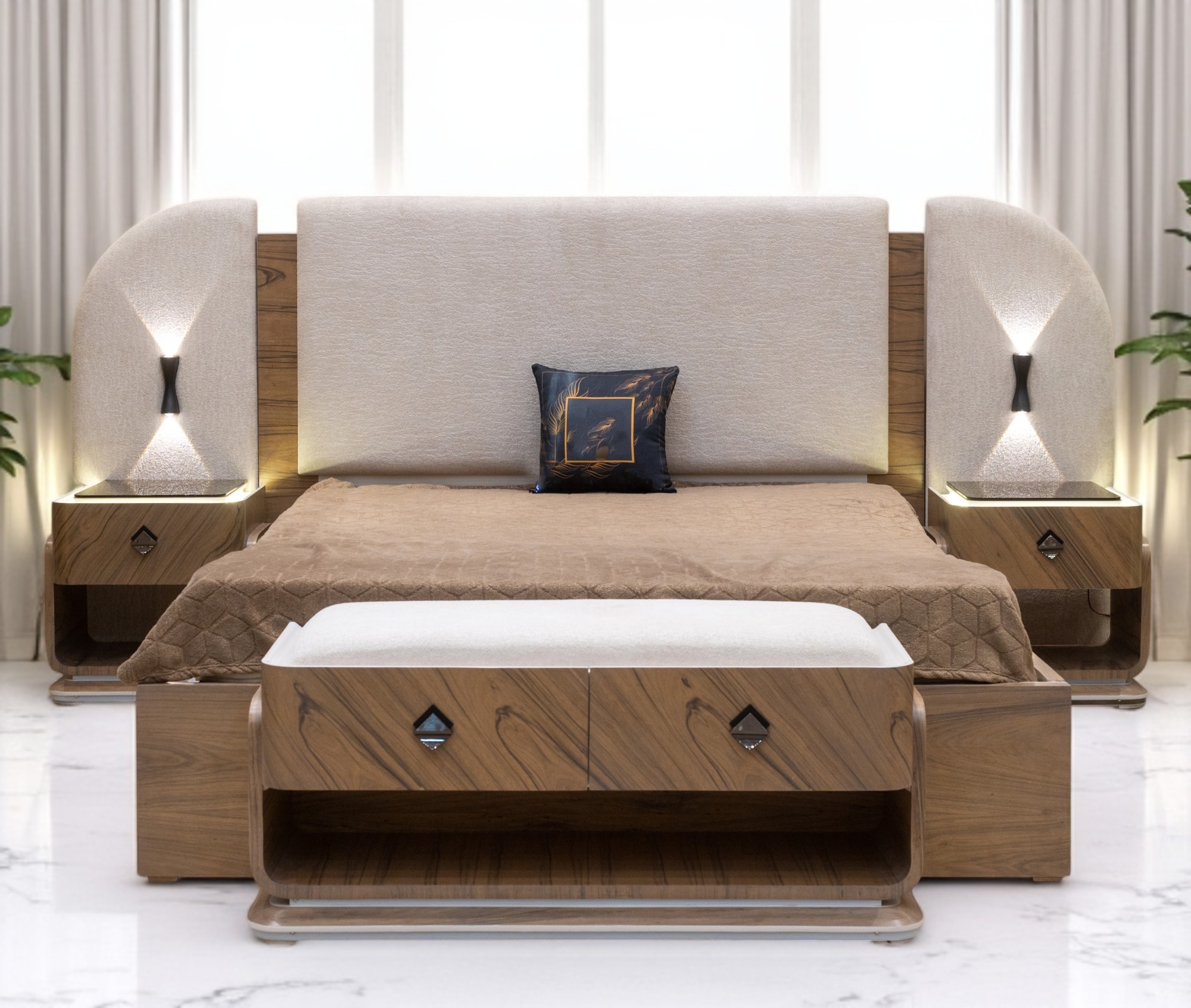 يتميز هذا السرير بتصميمه الراقي والفخم، وهو مصمم لإضفاء لمسة من الأناقة والرفاهية على غرفة النوم ومريحًا للاستخدام اليومي.