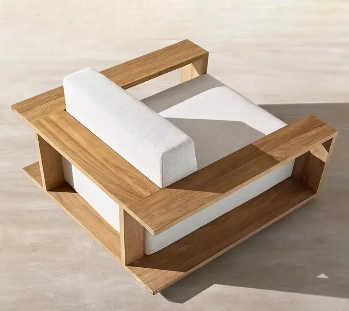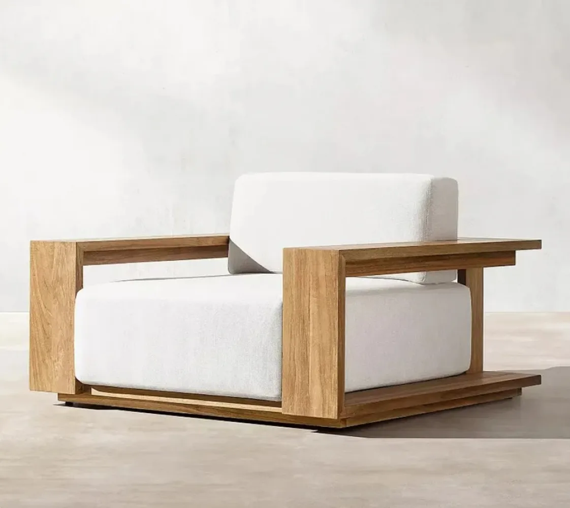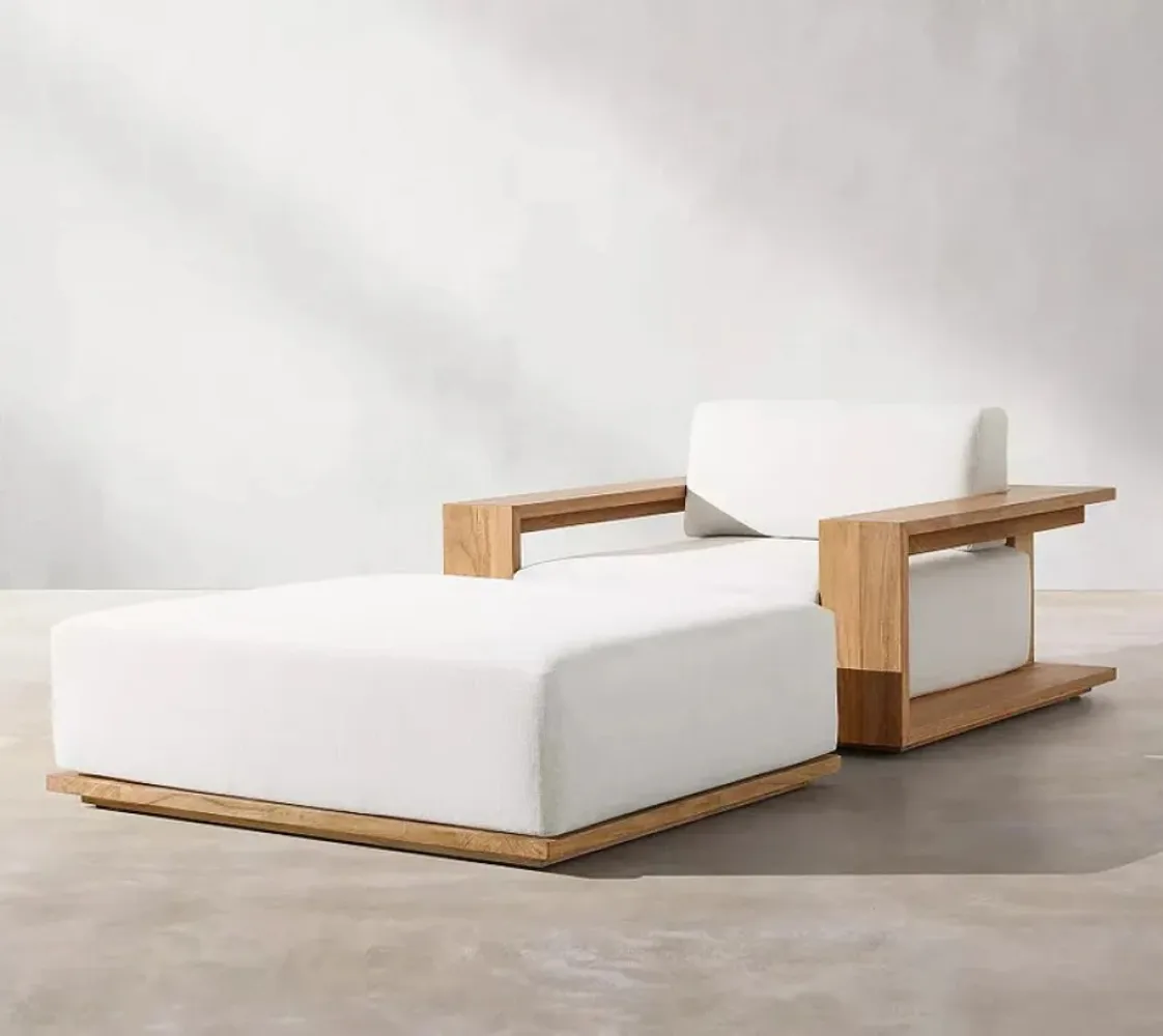 غرفة معيشة بتصميم مريح وعصري، يجمع بين خشب طبيعي فاتح وقماش كتان أبيض أو أسود. تشمل كراسي وأرائك متنوعة وشازلونج وطاولات