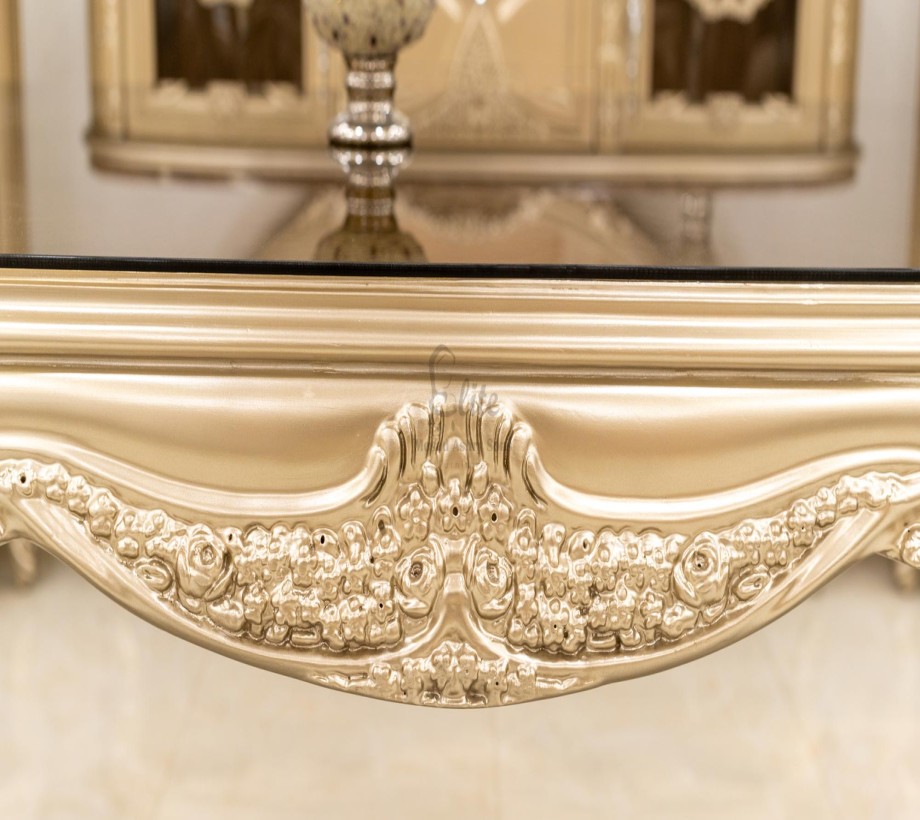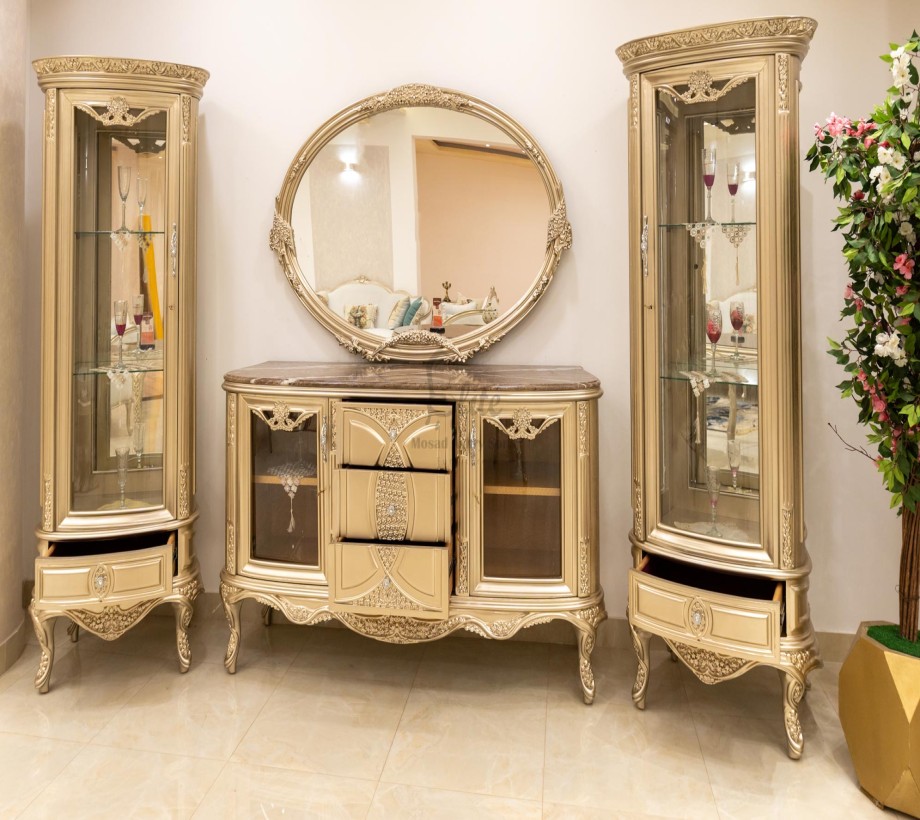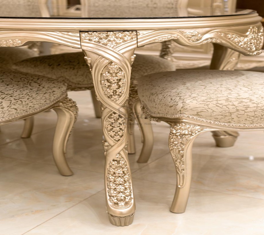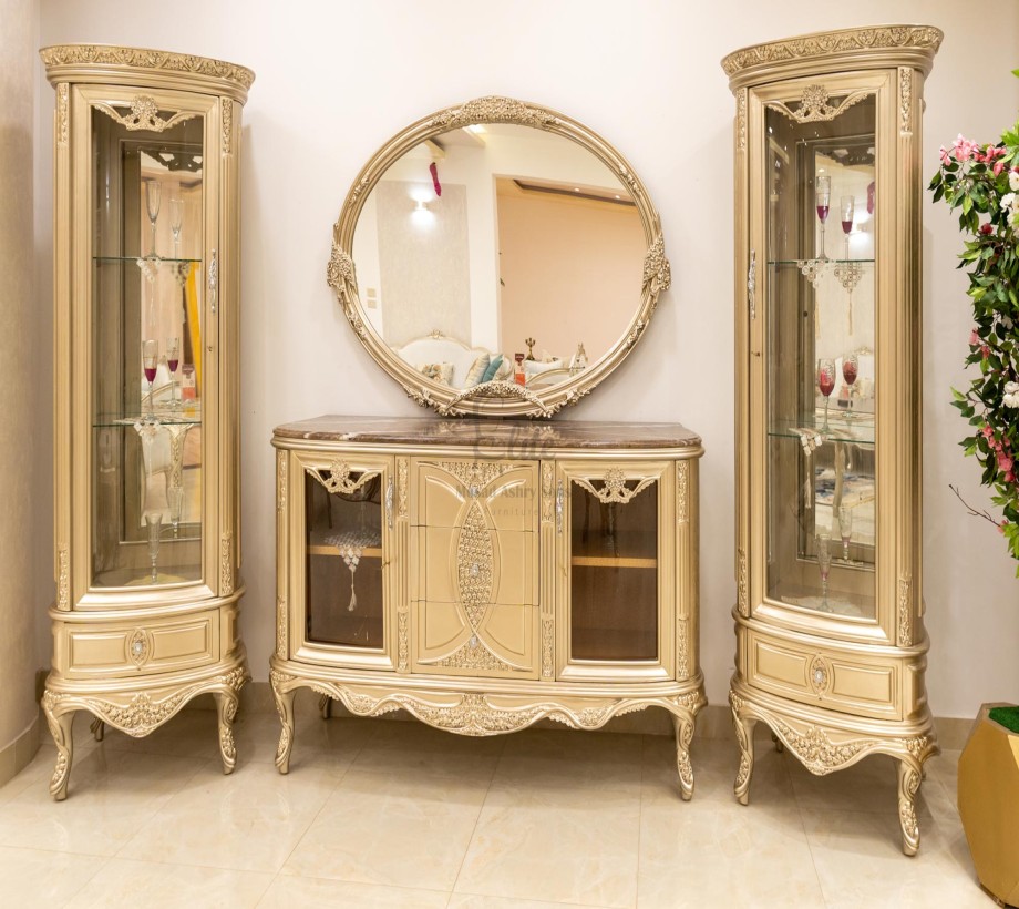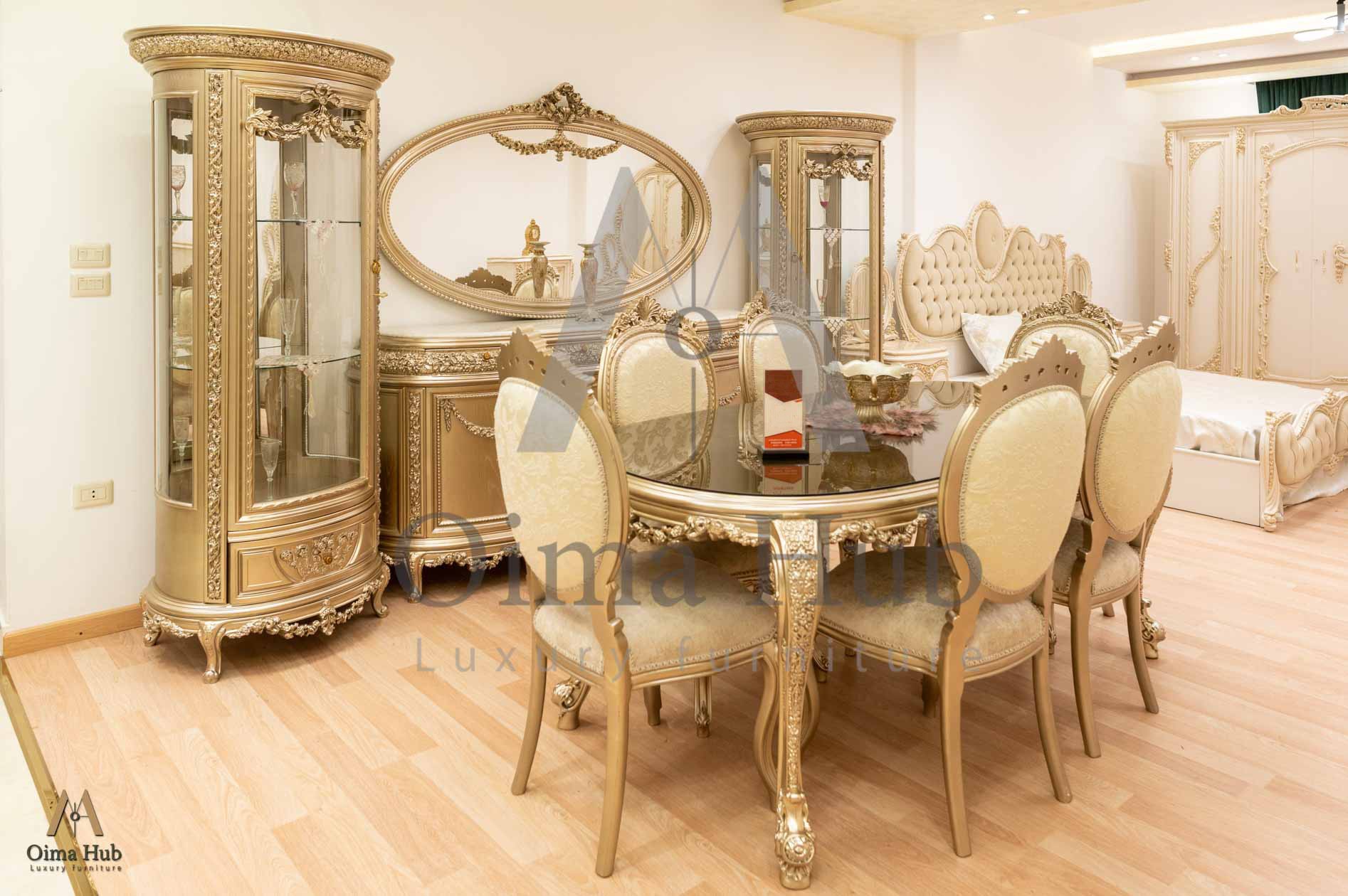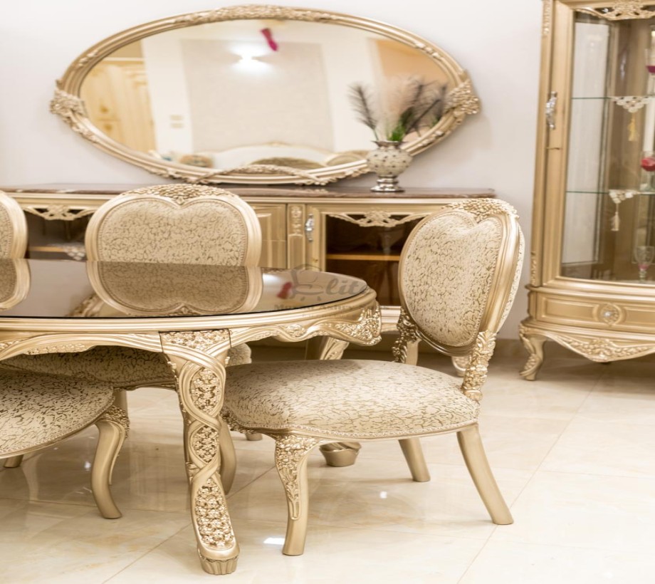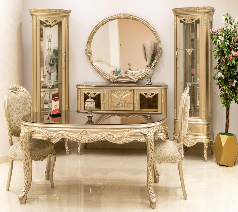 غرفة طعام كلاسيك مكونة من : ترابيزة . 6 كراسى . بوفيه .عدد 2 نيش . برواز مرايا كلاسيك غرفة طعام مصنعه من خشب الزان الطبيعى بطابع كلاسيكى مميز