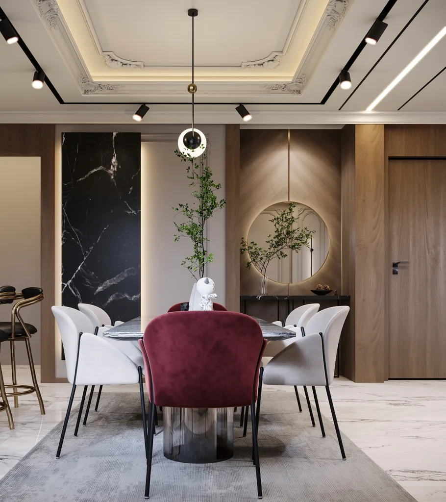 تصميم الطاولة معاصر ومودرن، حيث يتميز بالأناقة والبساطة والأشكال الهندسية النظيفة. يتم التركيز على الخطوط المستقيمة والألوان الهادئة، مما يخلق جوًا عصريًا ومتطورًا في غرفة الطعام.