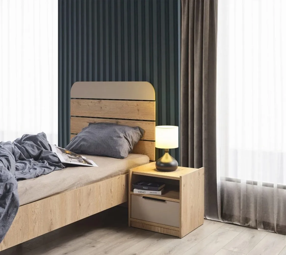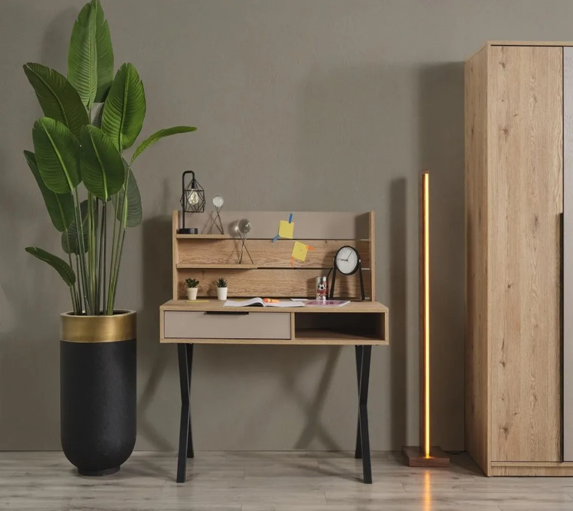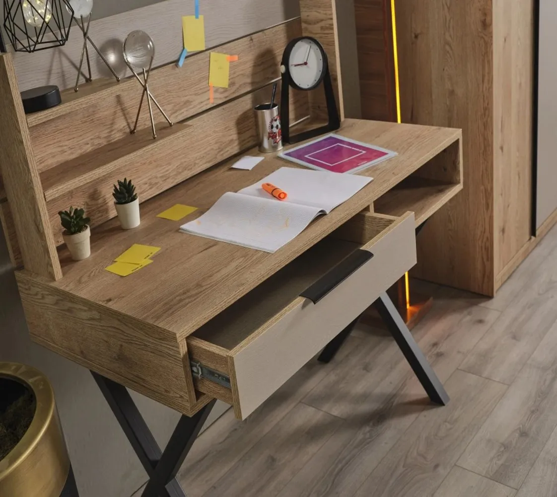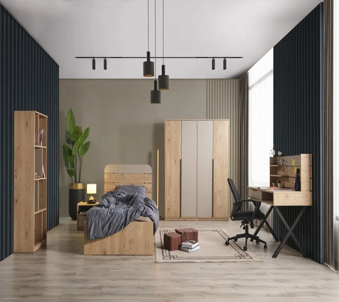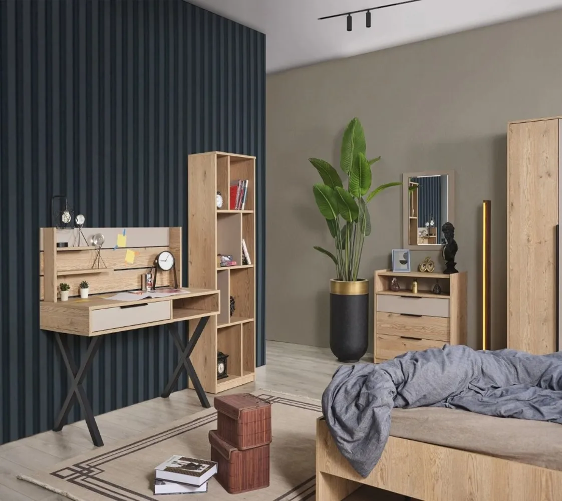 مكونة من سرير ودولاب ومكتب وكيمود ووحدة ادراج مصنوع من خامات ذات جودة عالية مثل الحشب الزان والخشب طبيعي