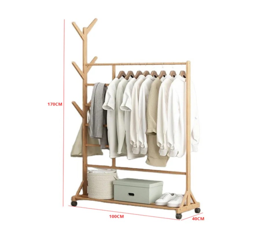 حامل ملابس خشبية برف تخزين مصنوعة من الخشب الزان، تأتي باللون الخشبي الجذاب وتتميز بتصميم عملي ومتين. يحتوى الحامل على سطح واسع يمكن استخدامه لتخزين الملابس بأنواعها المختلفة،