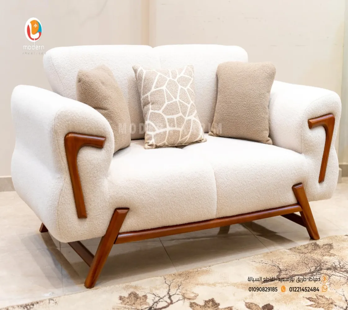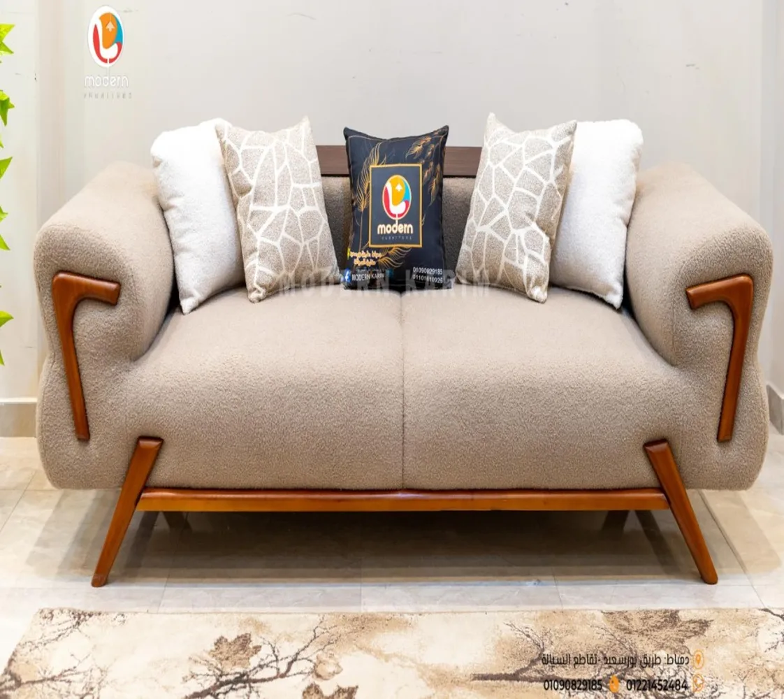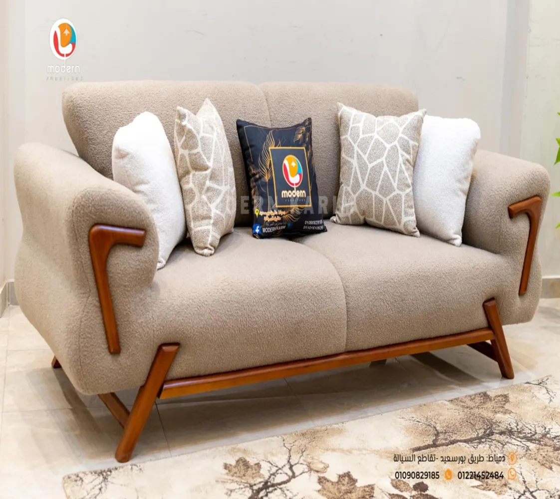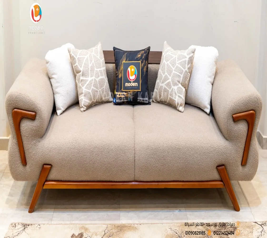 كنبه كبيرة . 2 فوتيه . كنبه ثنائى 2 مقعد . ترابيزة مودرن الغرفة مصنوعه من خشب الزان الطبيعى مع قماش بوكليه عالى الجودة بطابع عصرى مميز يليق بمنزلك