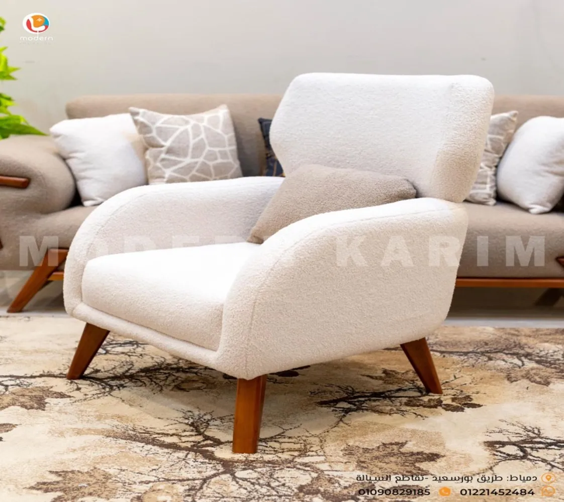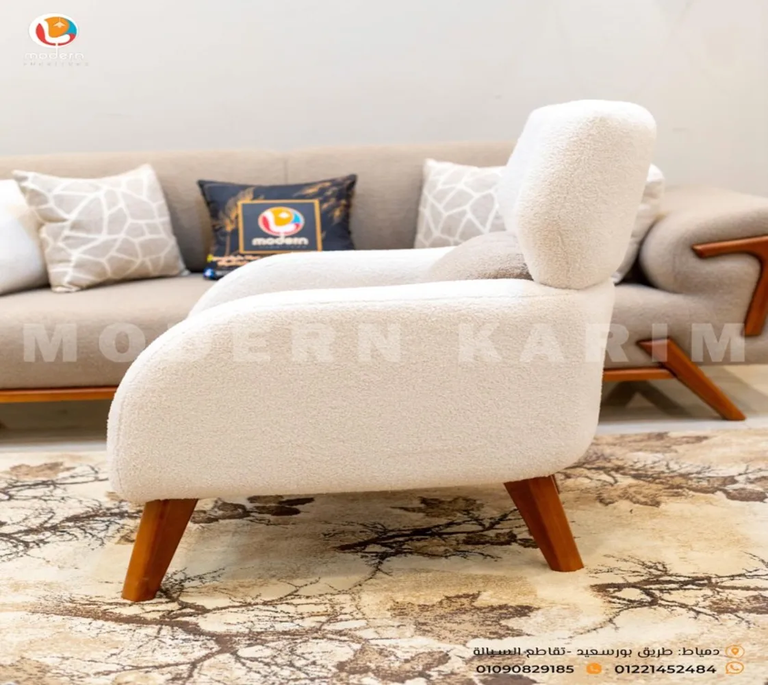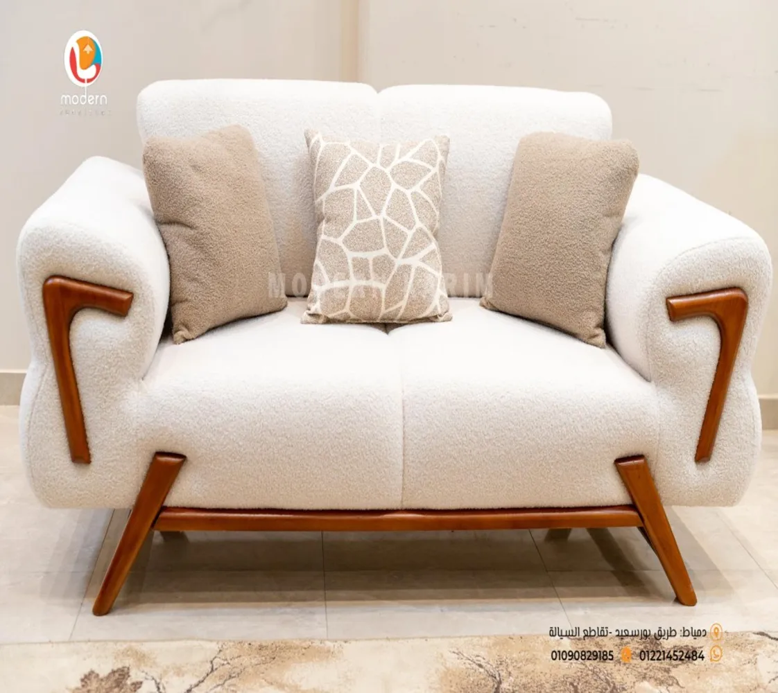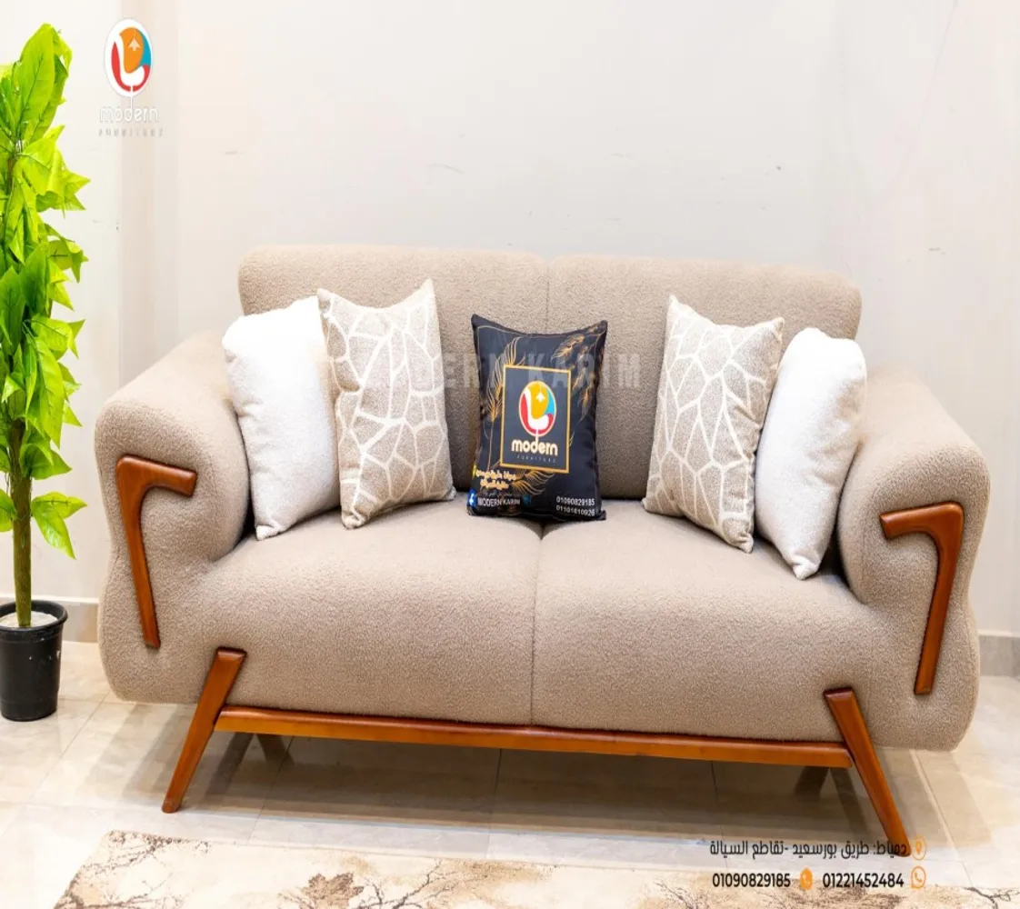 كنبه كبيرة . 2 فوتيه . كنبه ثنائى 2 مقعد . ترابيزة مودرن الغرفة مصنوعه من خشب الزان الطبيعى مع قماش بوكليه عالى الجودة بطابع عصرى مميز يليق بمنزلك