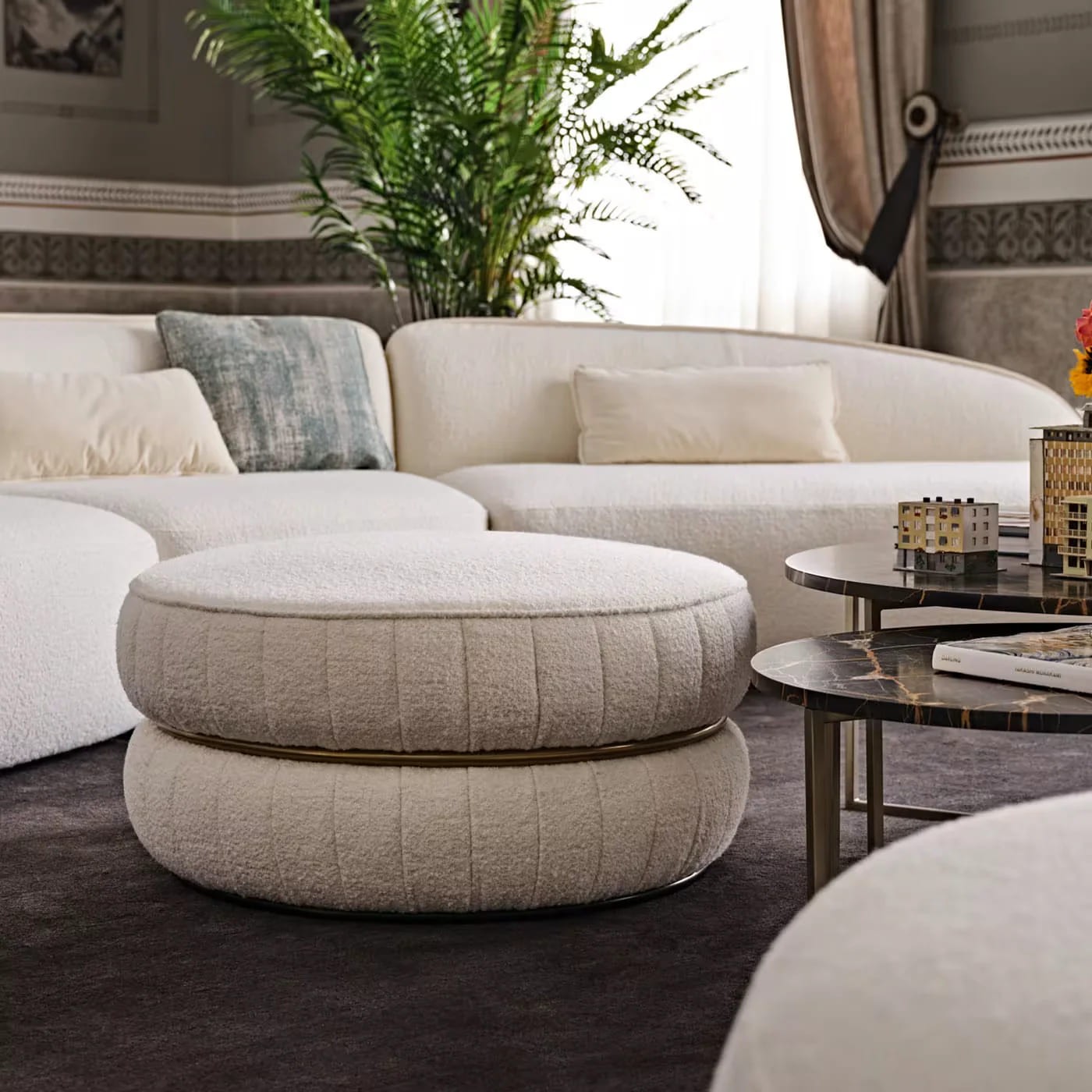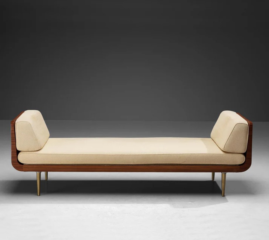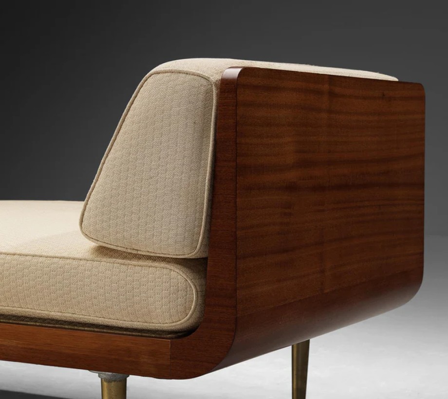 بانكيت بدون ظهر بتصميم مميز وأنيق، تجمع بين اللون الأبيض الداكن والبني والذهبي. مصنوعة من خشب طبيعي ومعدن وقماش كتان عالي الجودة، مما يضفي لمسة عصرية وفاخرة على أي مساحة داخلية.