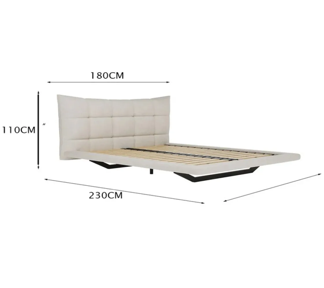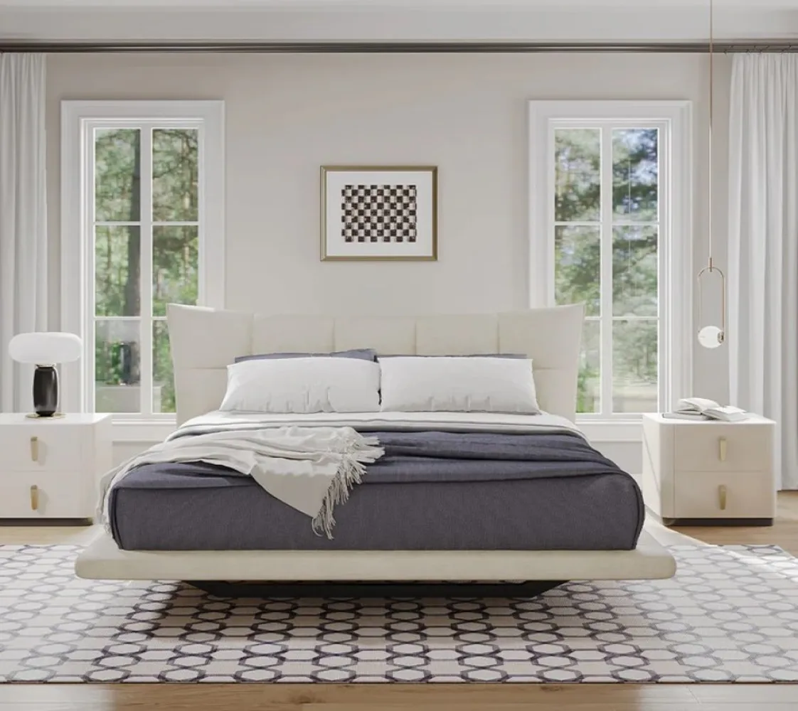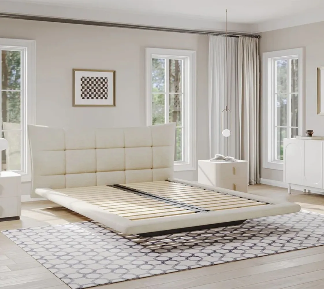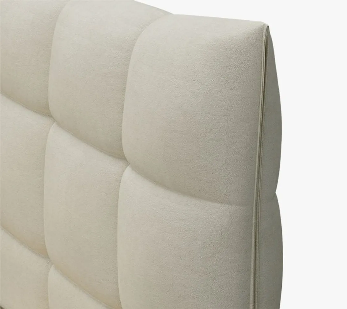 سرير بمسند ظهر من البوكليه بتصميم أنيق ولون أبيض، يجمع بين الفخامة والأناقة. مصنوع من خشب طبيعي ومغطى بجلد عالي الجودة. مثالي لتجميل غرفتك وضمان راحة لا مثيل لها.