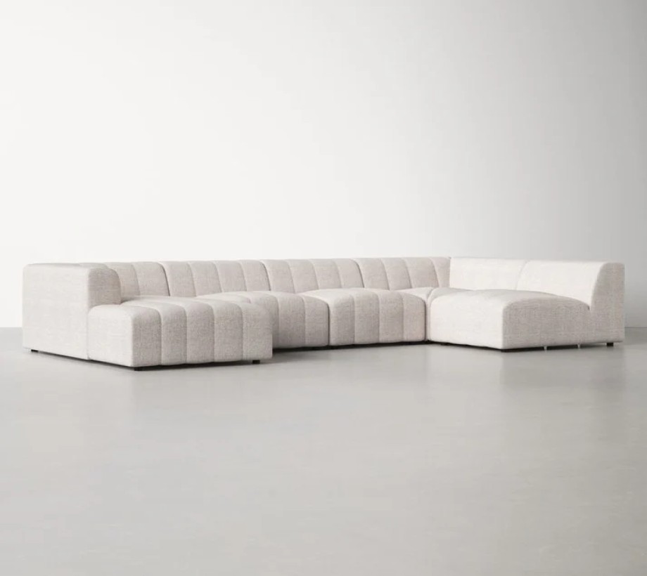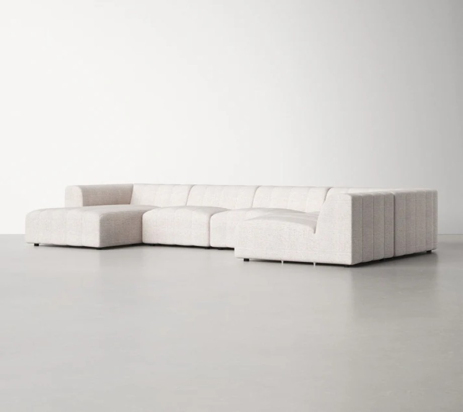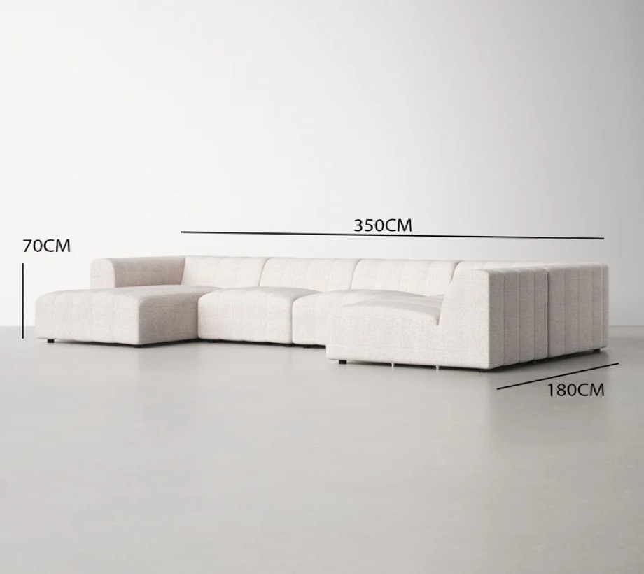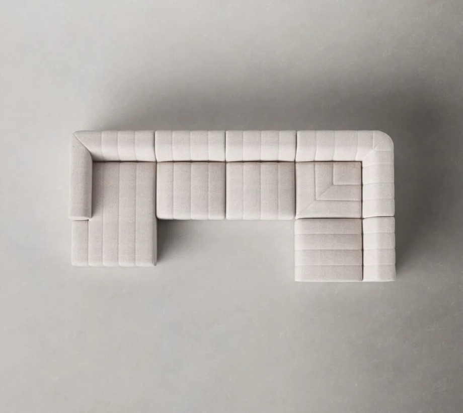 أريكة زاوية بتصميم عصري مريح، مصنوعة من خامات عالية الجودة مثل قماش الكتان وخشب الزان، بلون أبيض داكن يضفي لمسة أنيقة على المكان.