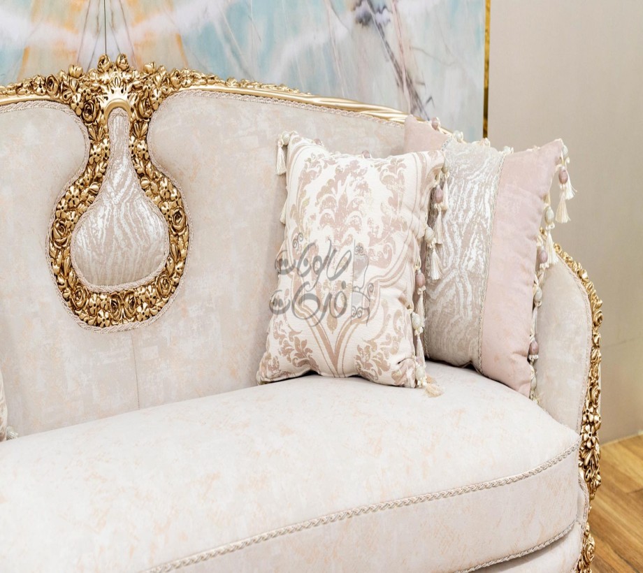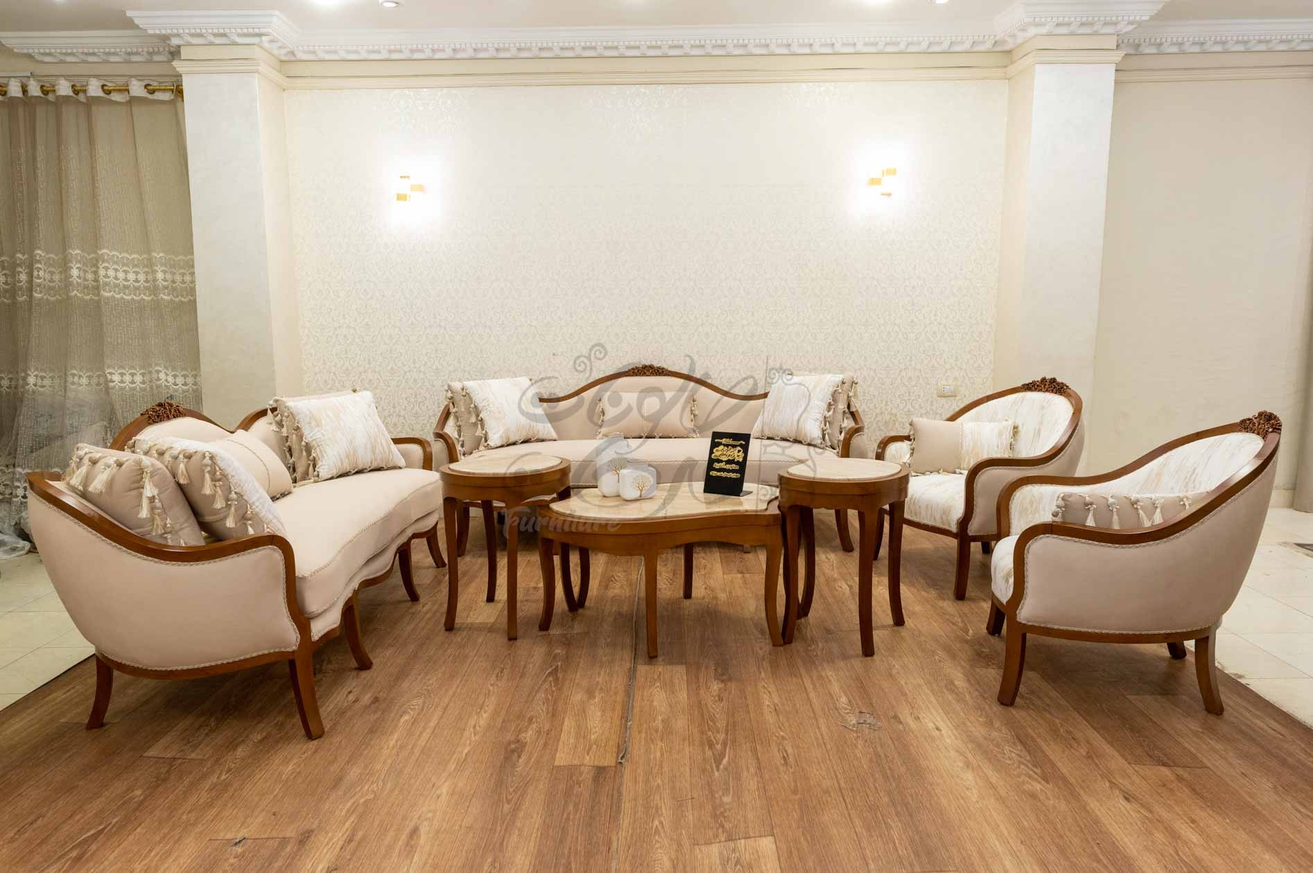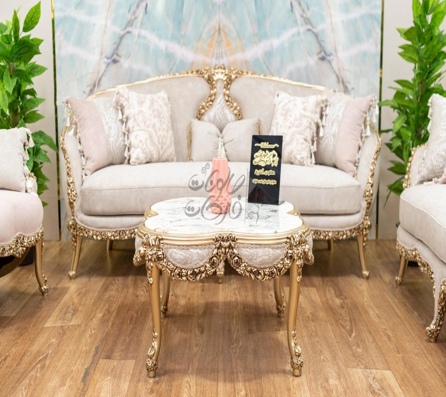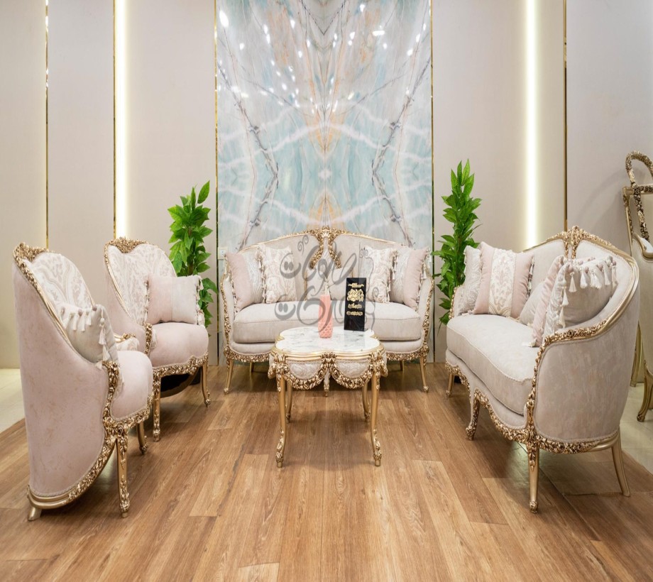 صالون يحتوى على : كنبه كبيرة . كنبة ثنائى . 2 فوتيه . ترابيزة رخام .بانكيت هزاز الصالون مصنوع من خشب الزان الطبيعى بطابع كلاسيكى مميز