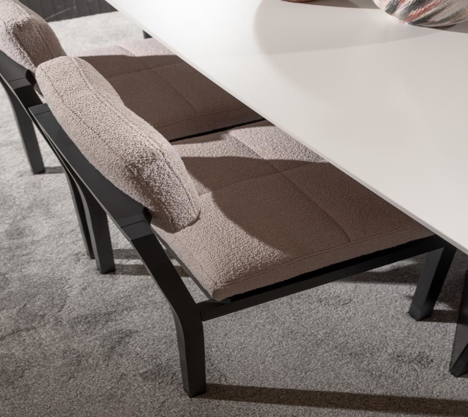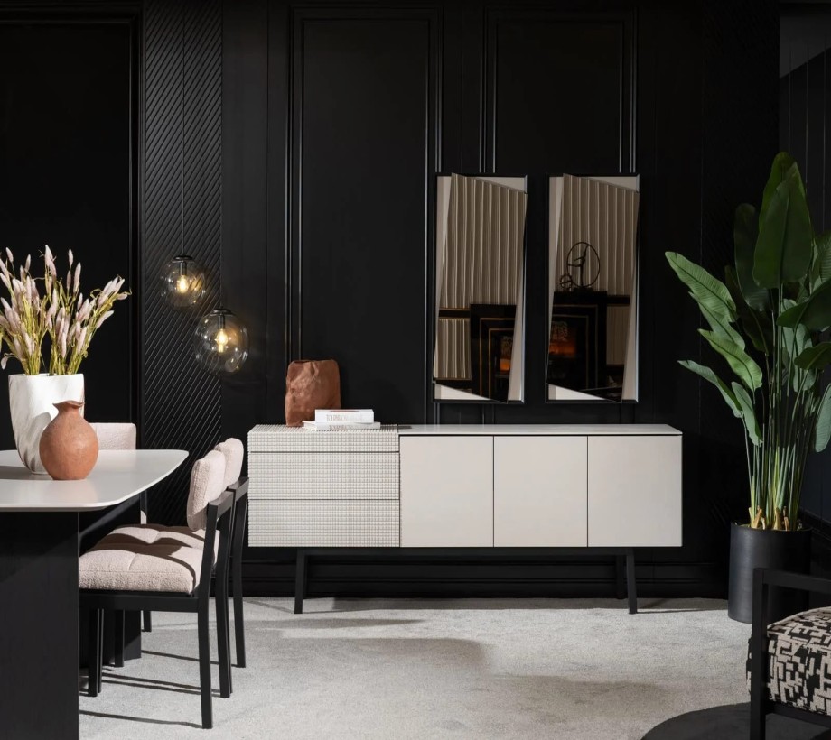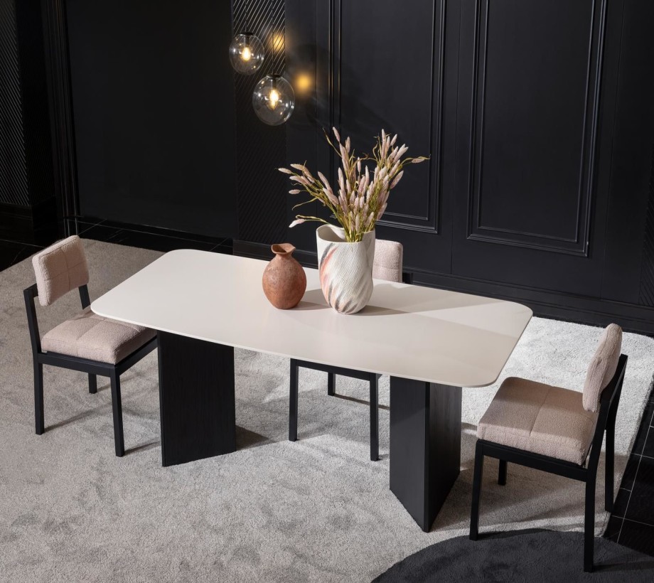 طاولة طعام بتصميم عصري، مع كرسي مريح بلون أوف وايت. مع بوفيه مودرن مصنوع من خامات ذات جودة عالية خشب طبيعى