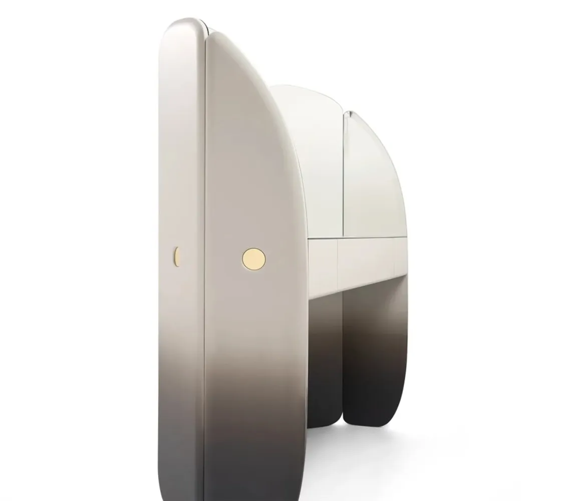 أنيقة ومتطورة، هي طاولة صغيرة فاخرة وخيالية. تتناقض جاذبية الهيكل مع خفة المرايا التي تقود إلى بُعد ساحر. يشمل مقعدًا.