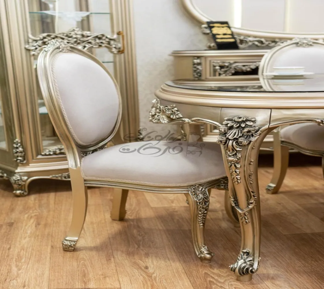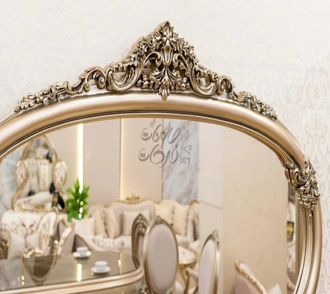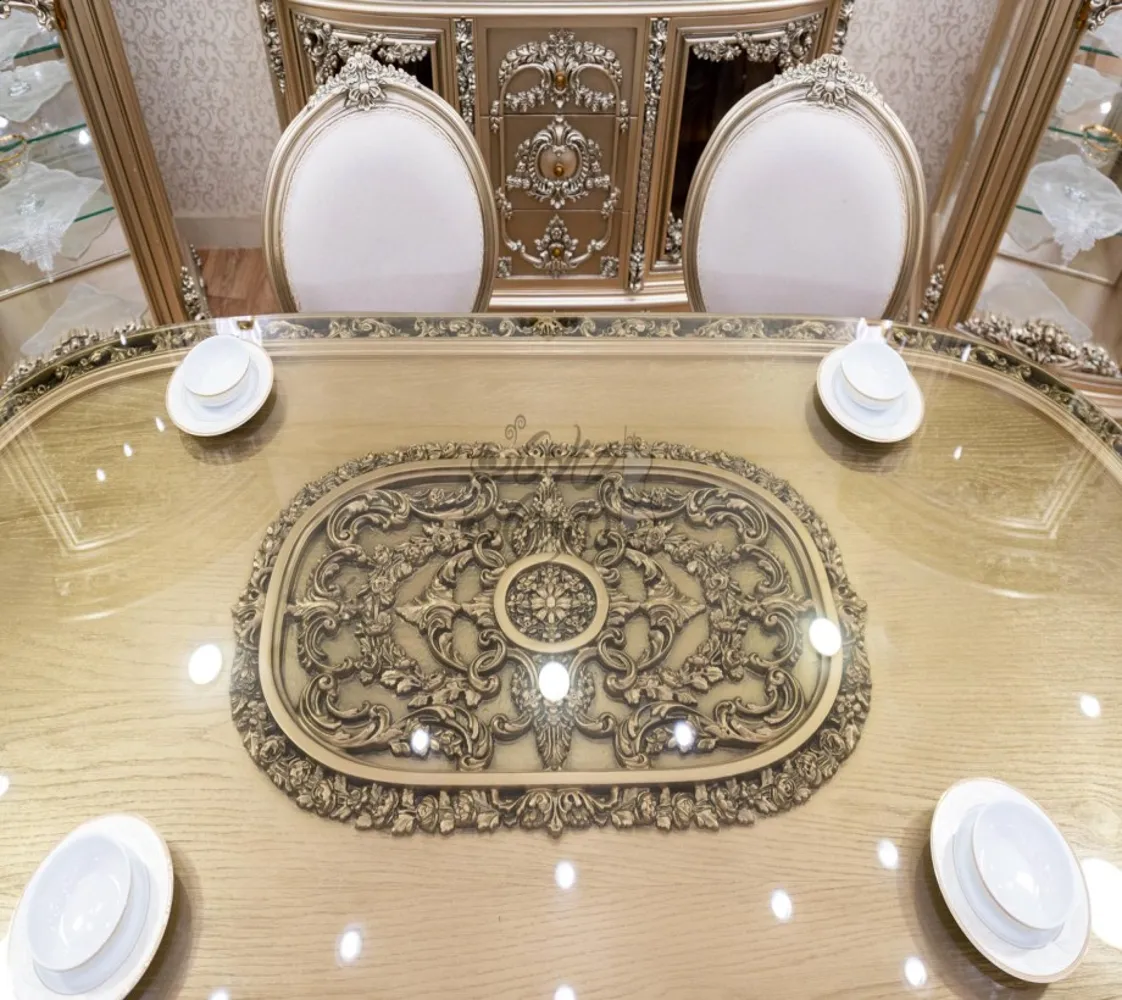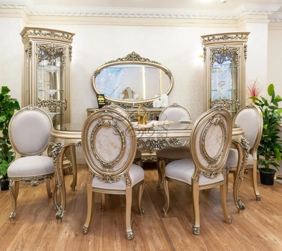 غرفة طعام كلاسيك مكونة من : ترابيزة . 6 كراسى . بوفيه .عدد 2 نيش . برواز مرايا كلاسيك غرفة طعام مصنعه من خشب الزان الطبيعى بطابع كلاسيكى مميز