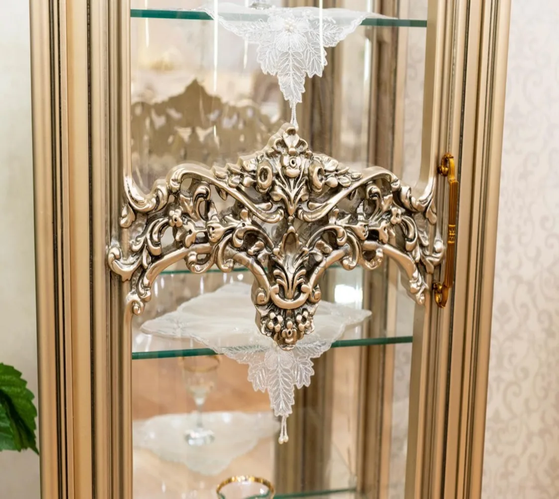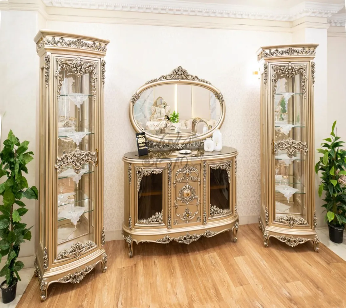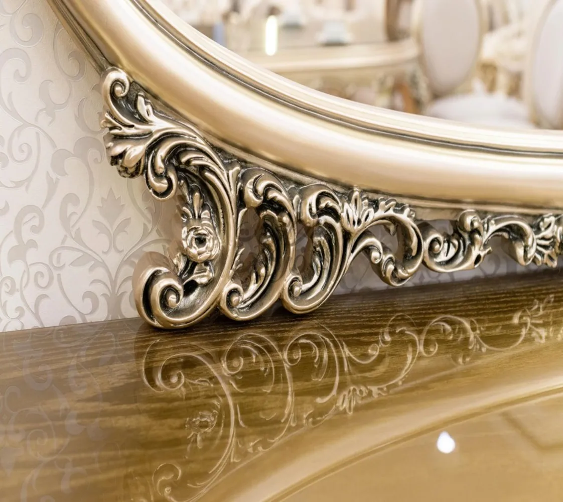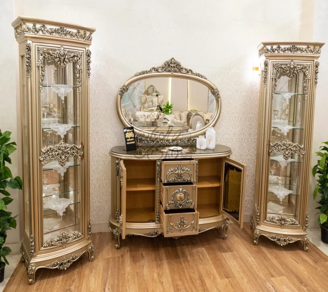 غرفة طعام كلاسيك مكونة من : ترابيزة . 6 كراسى . بوفيه .عدد 2 نيش . برواز مرايا كلاسيك غرفة طعام مصنعه من خشب الزان الطبيعى بطابع كلاسيكى مميز