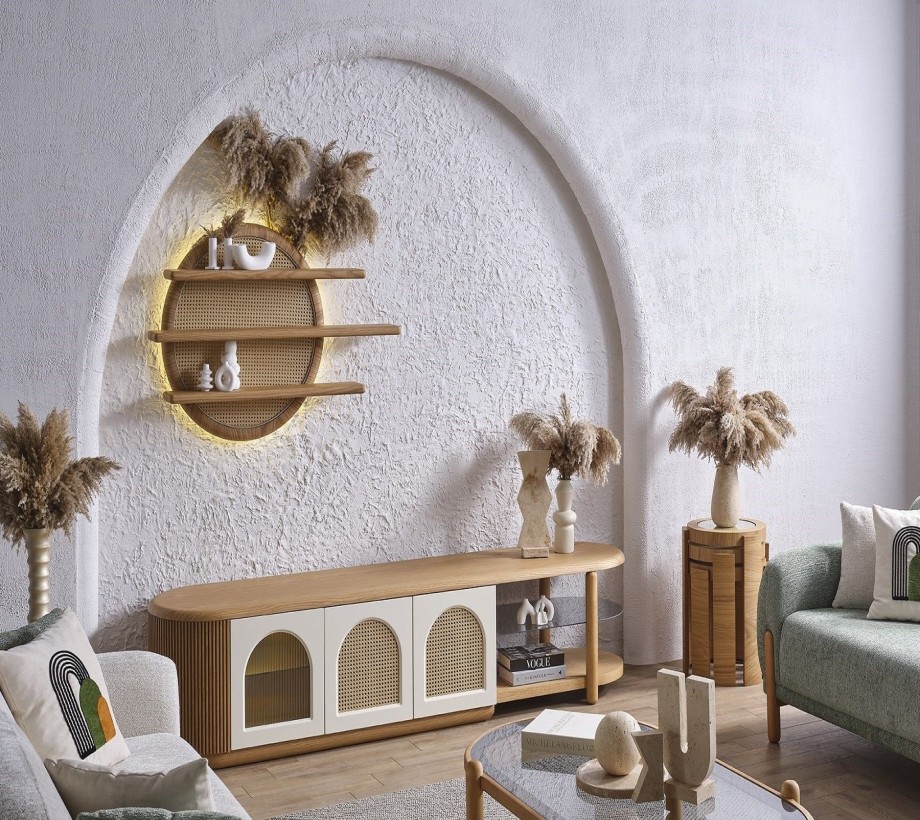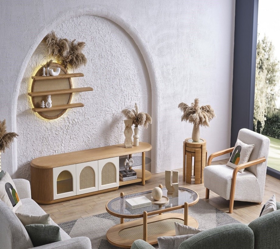 طاولة تلفاز عصريه أنيقة بلون خشبى ومصنوعة من خشب الزان الطبيعي مع خشب الروطان، تضيف لمسة راقية لديكور منزلك. تصميمها الأنيق والعصرىيجمع بين الجمال والأناقة.