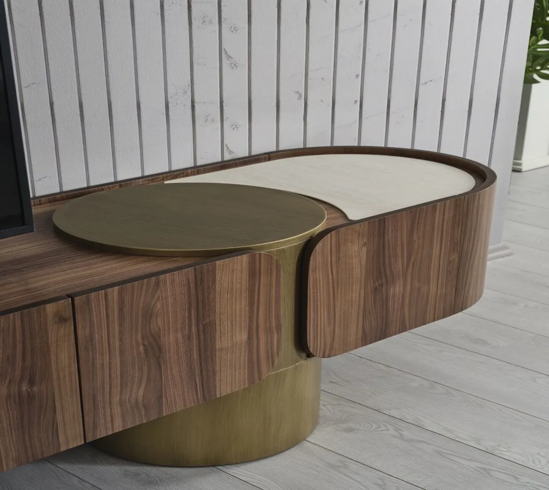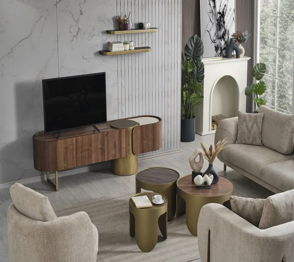 طاولة تلفاز عصريه أنيقة بلون خشبى غامق مع معدن دهبى مصنوعة من خشب الزان الطبيعي مع خشب الكونتر وستيل عالى الجودة ، تضيف لمسة راقية لديكور منزلك. تصميمها الأنيق والعصرىيجمع بين الجمال والأناقة.
