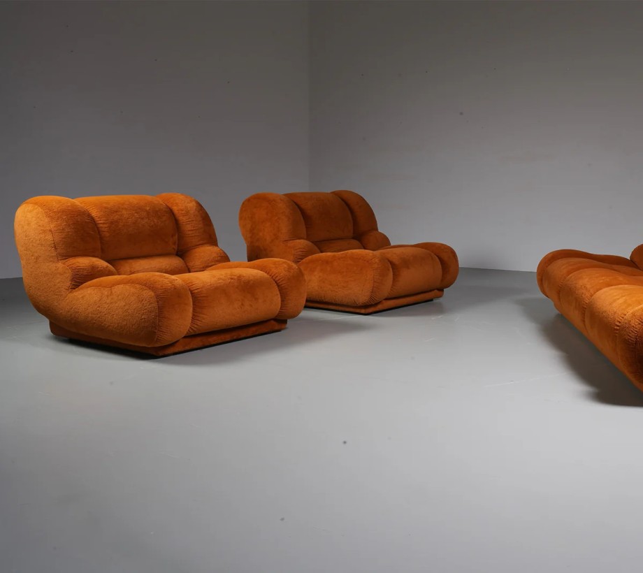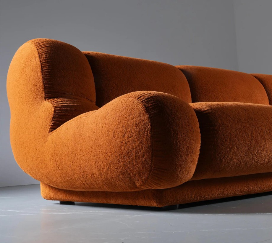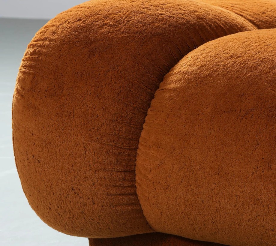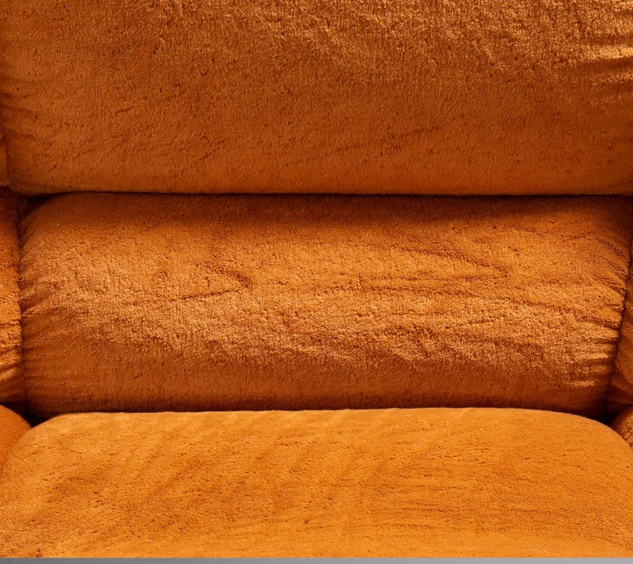 أريكة مذهلة بتنجيد مخملي باللون البرتقالي الميزة البارزة هي المخمل السميك الفخم، مما يُظهر الحرفية عالية الجودة التي تشتهر بها الشركات المصنعة المصرية. تعزز مادة المخمل الفاخرة المستخدمة من جاذبية الأريكة الفاخرة،