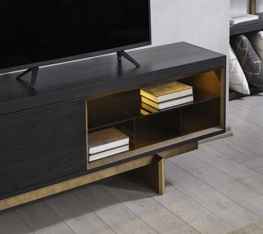 ترابيزة تلفاز خشبية بتصميم مودرن، مزودة بمساحة تخزين مميزة. مصنوعة من خشب طبيعي مع تفاصيل سوداء، تتميز بأناقة وعملية تلبي احتياجات ترتيب وتنظيم الأشياء بمنزلك بشكل ممتاز