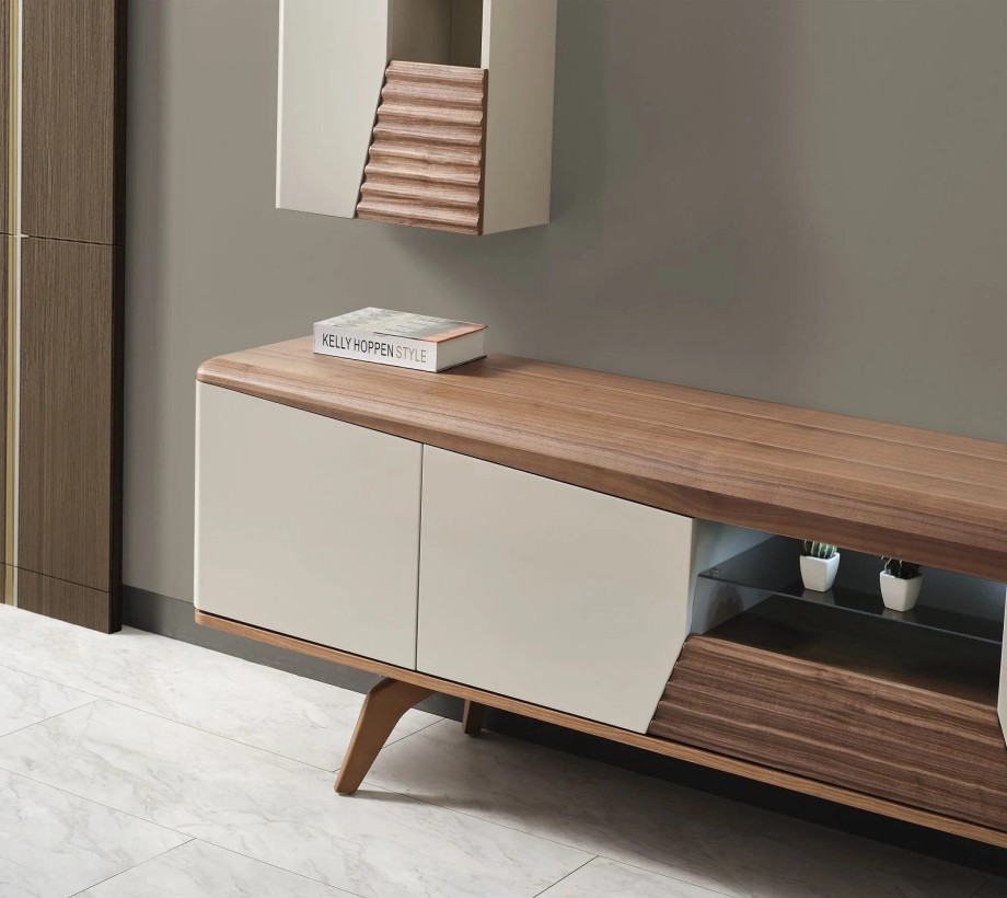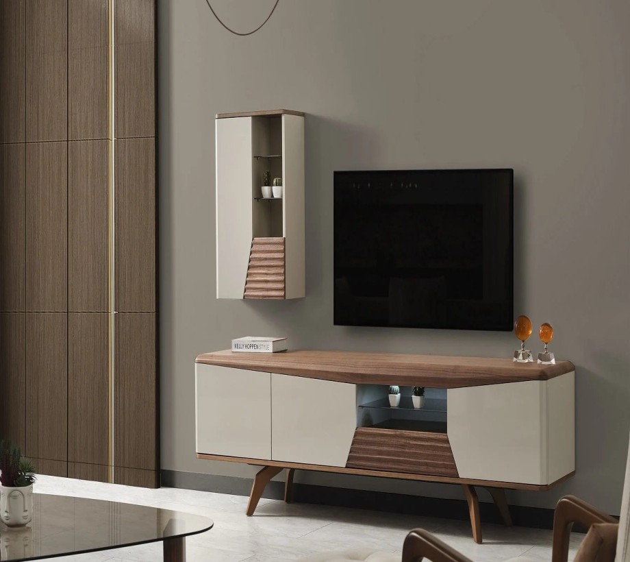 ترابيزة تلفاز من الخشب الطبيعى والكونتر اللون : أبيض + خشبى أبعاد المنتج : 135 سم عرض × 39 سم عمق × 41 سم ارتفاع