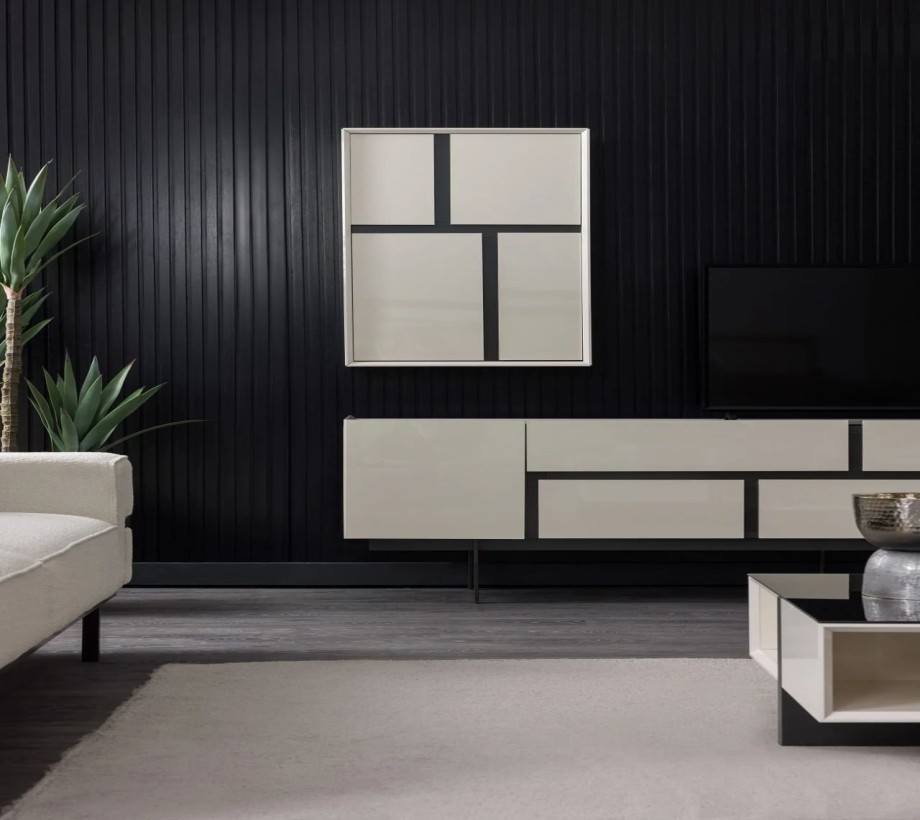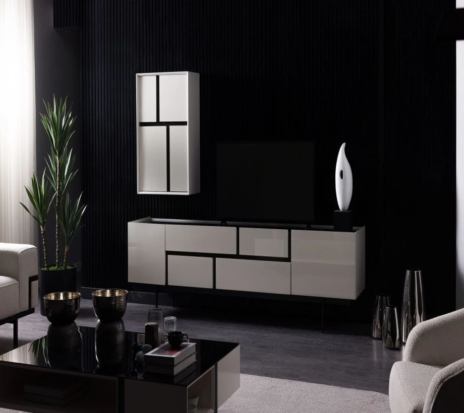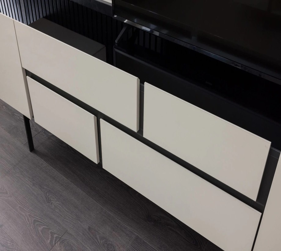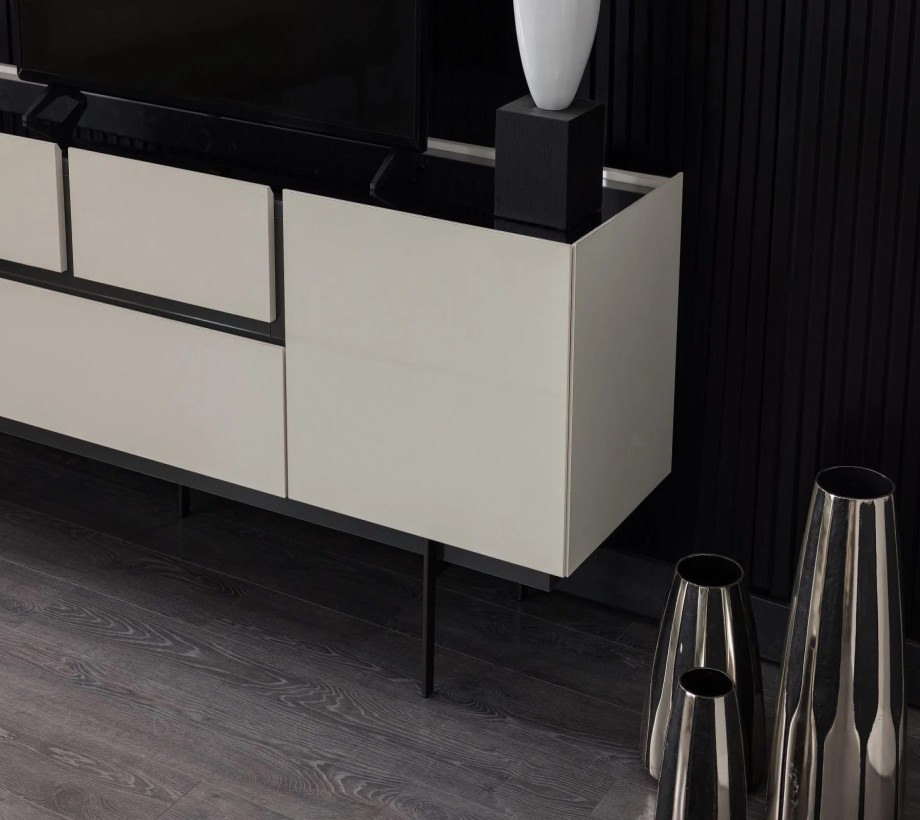 طاولة تلفاز خشبية بتصميم عصري، مزودة بمساحة تخزين مميزة، مصنوعة من الخشب الطبيعي ومعدن بلون الخشب مع تفاصيل باللون الأسود، أنيقة وعملية وتلبي احتياجاتك في ترتيب وتنظيم منزلك بشكل مثالي