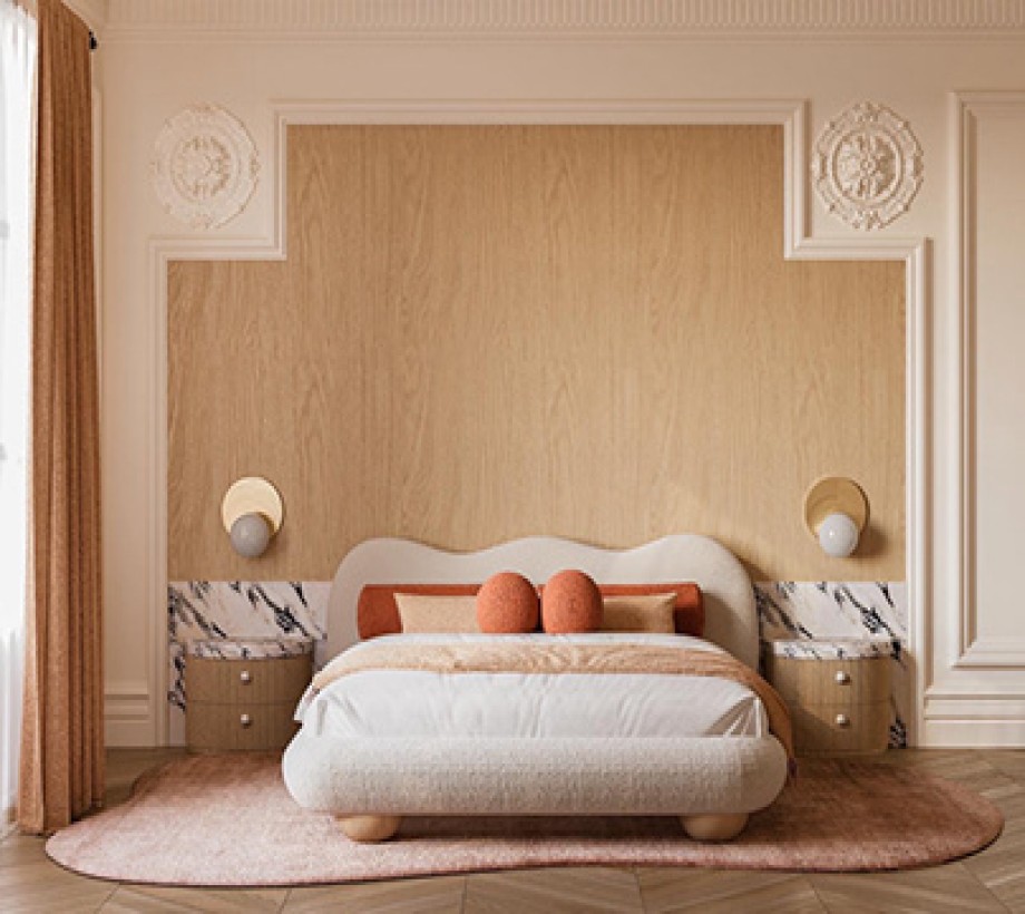 سرير بتصميم مودرن، مصنوع من خشب زان، قماش بوكليه . يجمع بين الفخامة والراحة لتجربة نوم مثالية