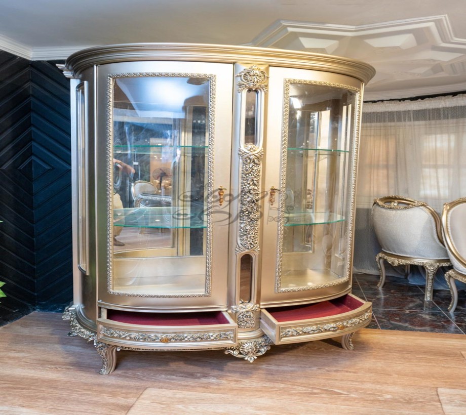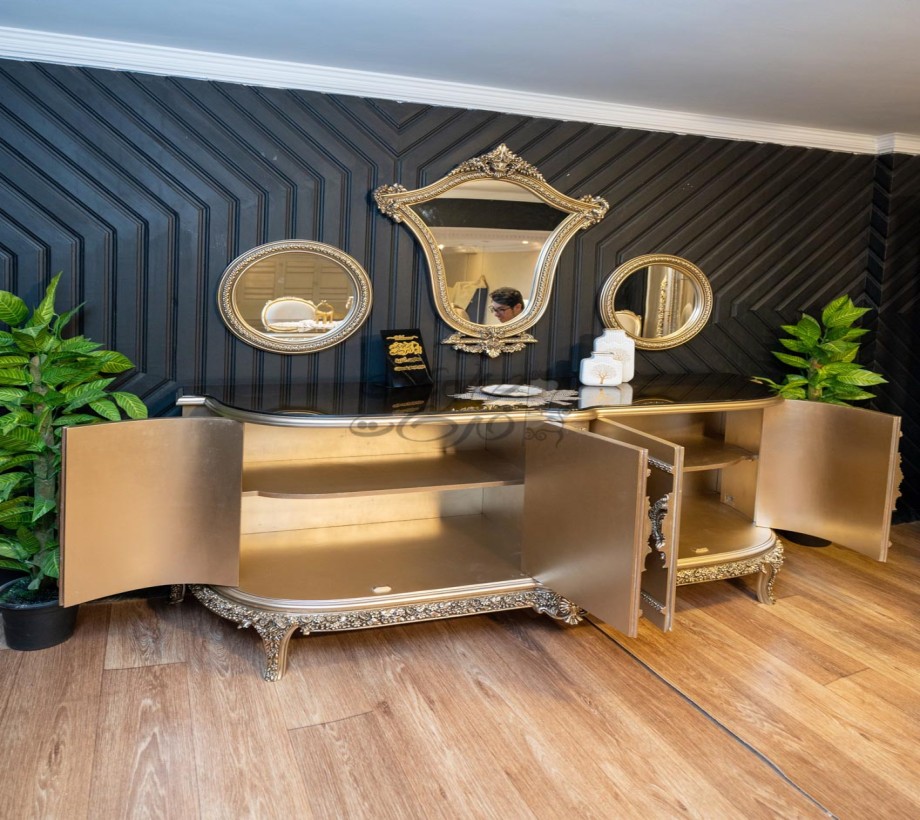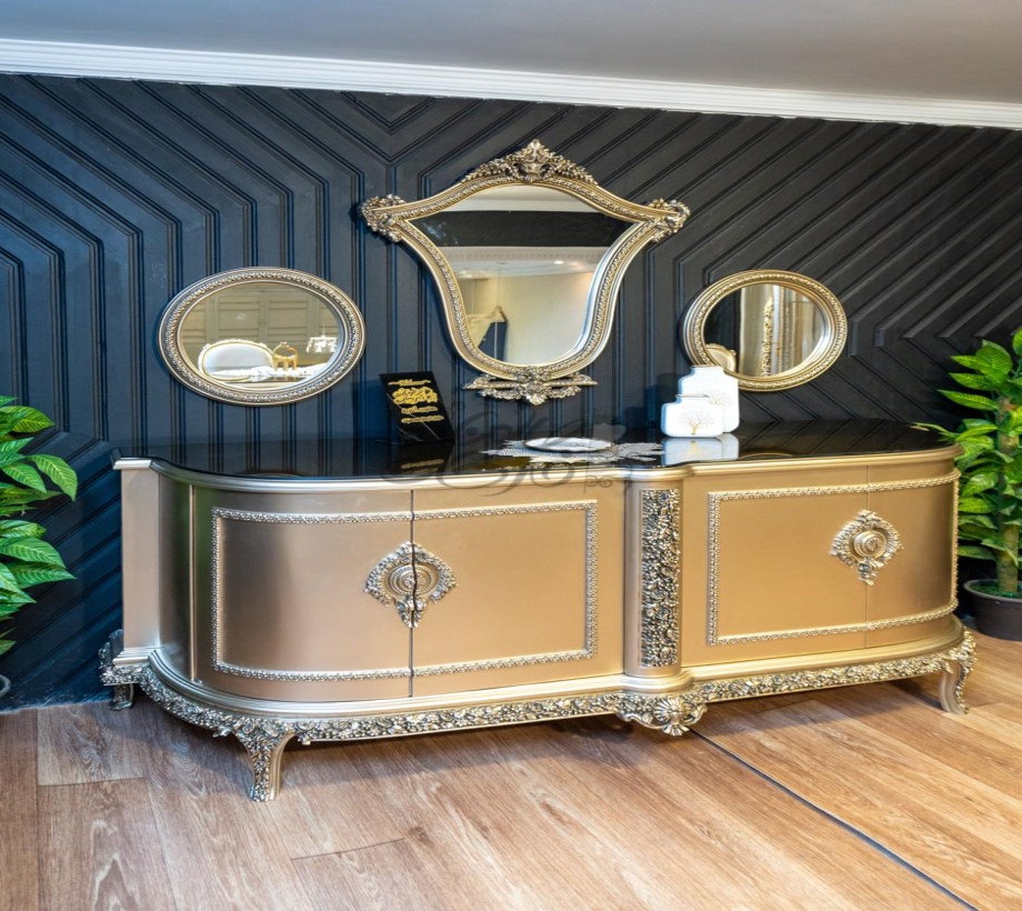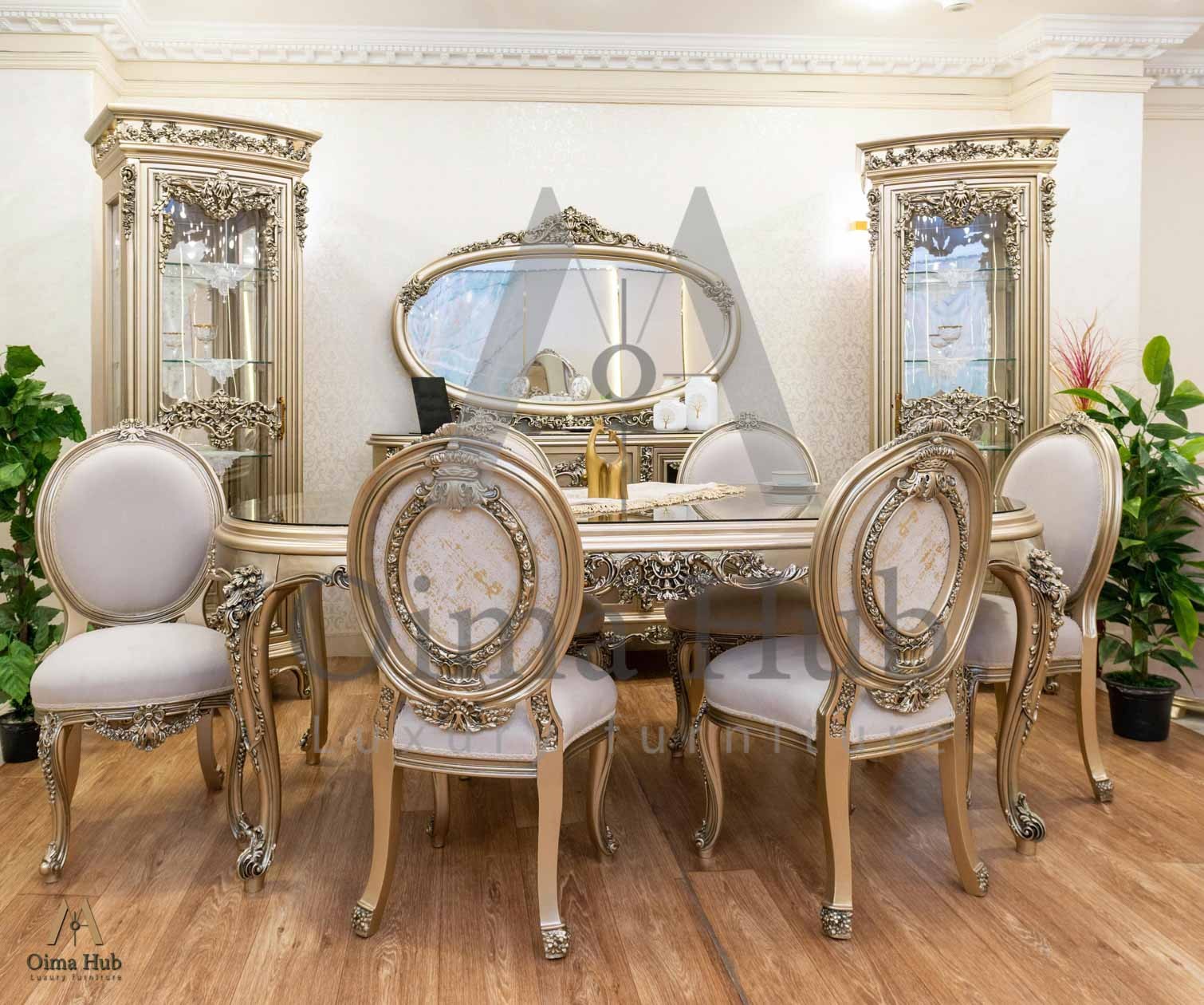 غرفة طعام كلاسيك مكونة من : ترابيزة .8 كراسى . بوفيه .عدد 2 نيش . برواز مرايا كلاسيك غرفة طعام مصنعه من خشب الزان الطبيعى بطابع كلاسيكى مميز