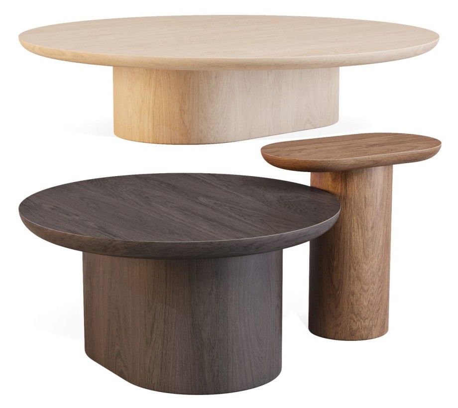 طقم طاولة قهوة عصري مكون من ثلاث قطع بتصميم أنيق، لون الخشب الداكن مع قاعدة بيضاء، مصنوع من خشب طبيعي عالي الجودة. يأتي بثلاثة أحجام مختلفة لتلبية احتياجاتك، مما يعزز ديكور منزلك بأناقة ووظائف