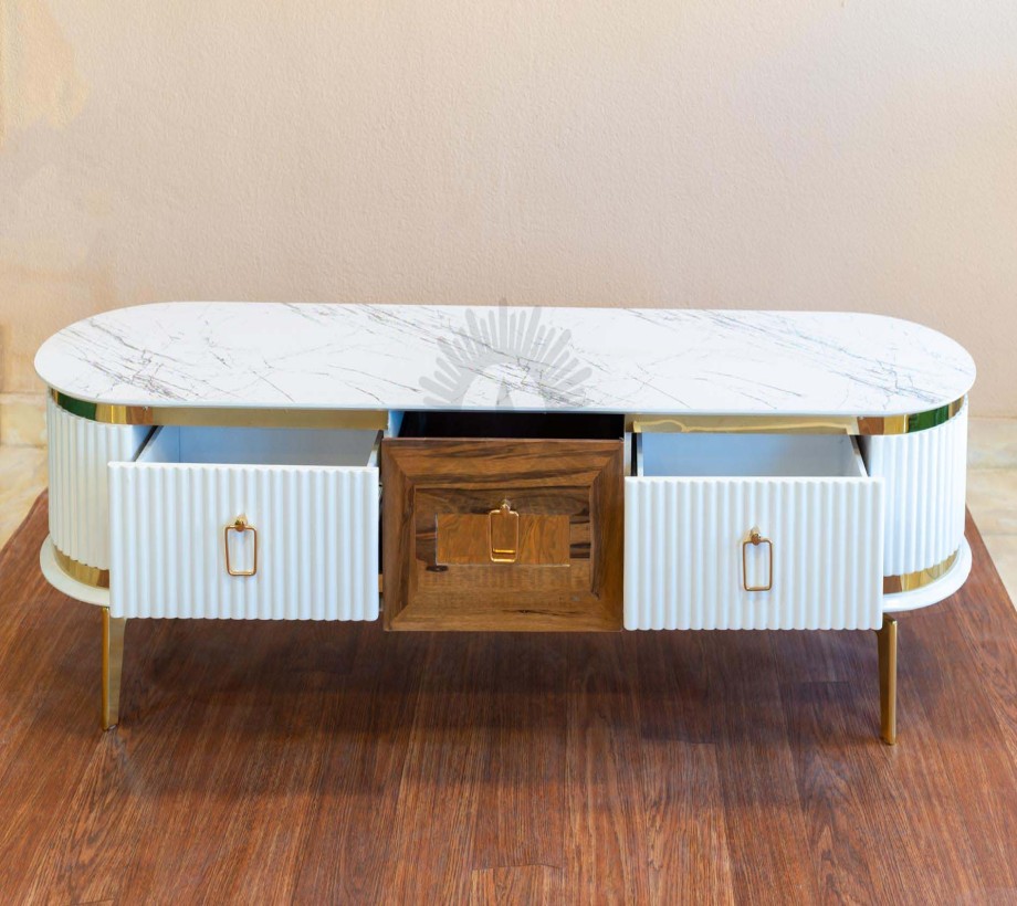 ترابيزة تلفاز خشبية بتصميم مودرن، مزودة بمساحة تخزين مميزة. مصنوعة من خشب طبيعي تصميمها الأنيق والعصرى يجمع بين الجمال والأناقة.