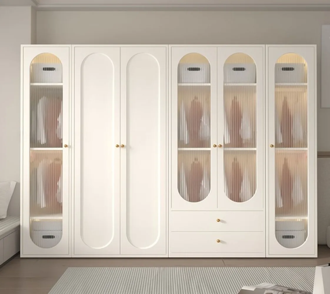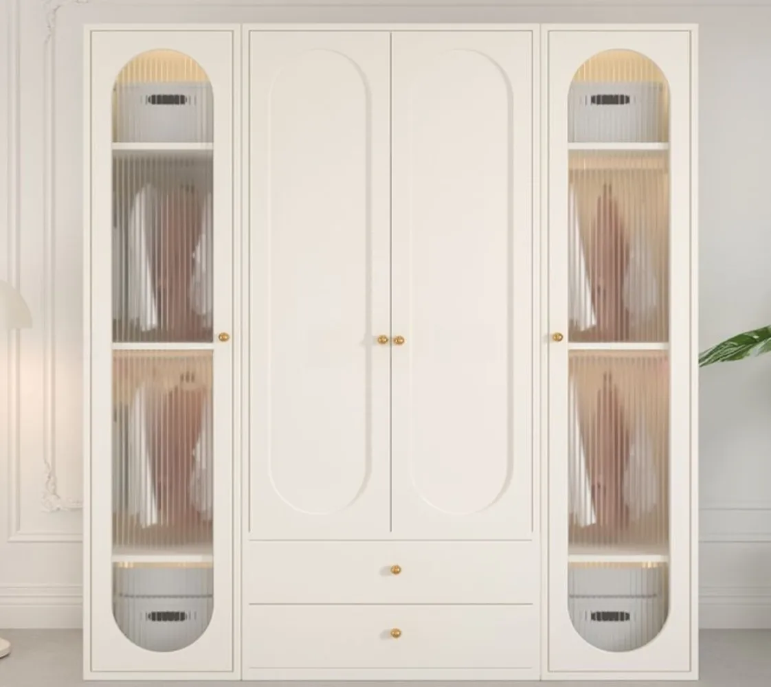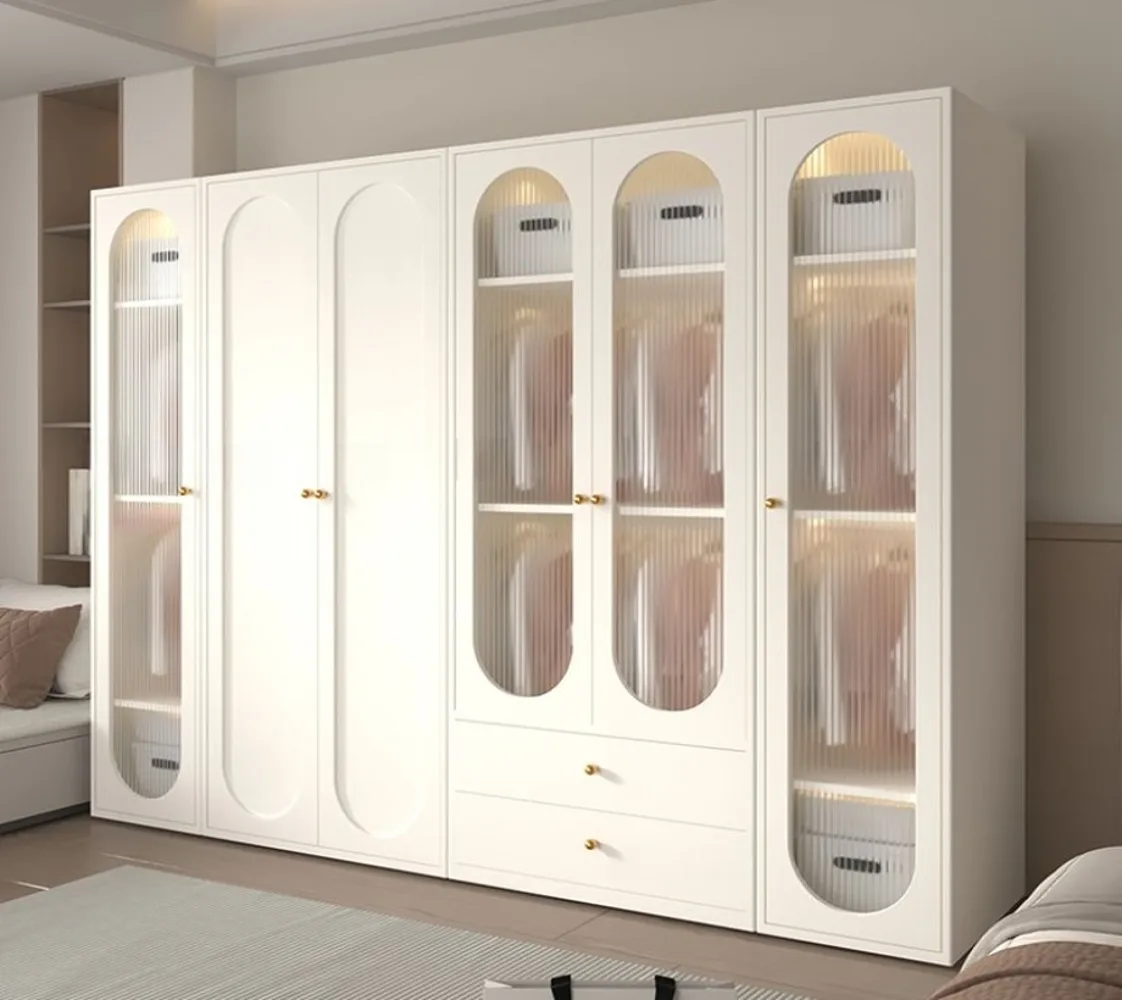 دولاب ملابس مودرن بتصميم مميز وأنيق، صُنعت من خشب طبيعي باللون الأبيض الجذاب. تتميز بمقاسات كبيرة تتسع لتخزين الملابس والأغراض بكل سهولة ويسر .