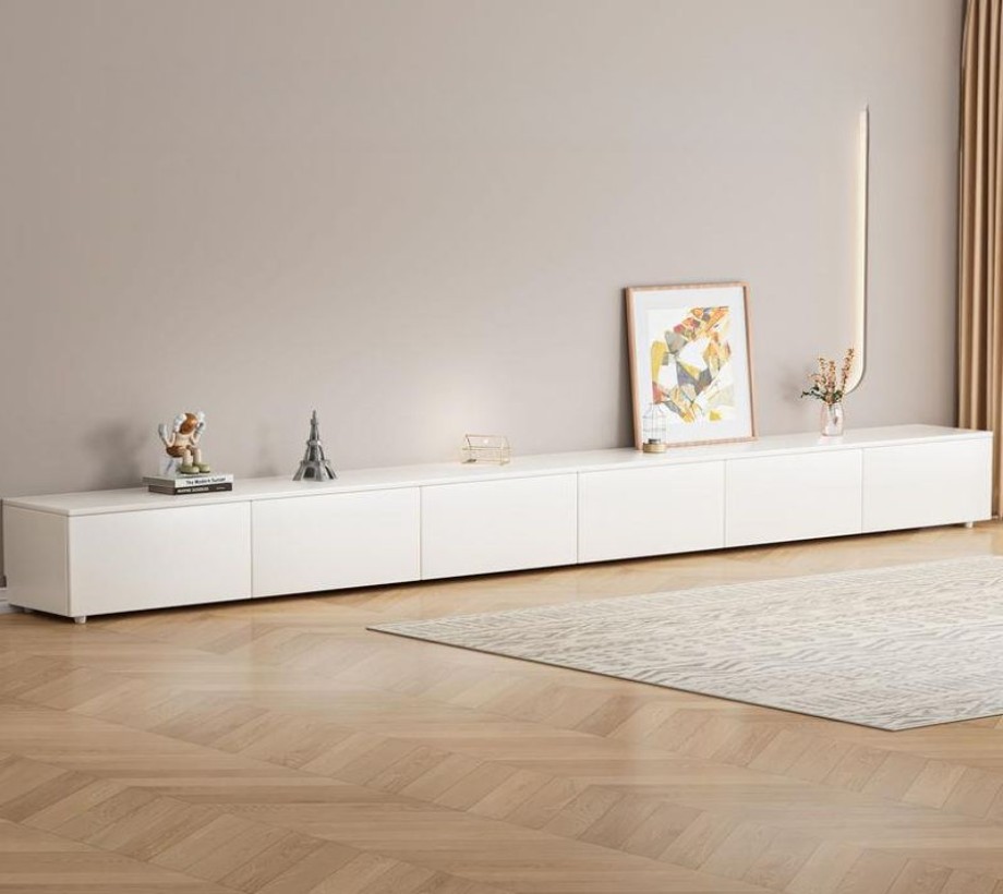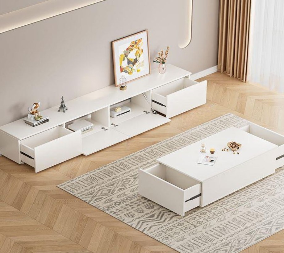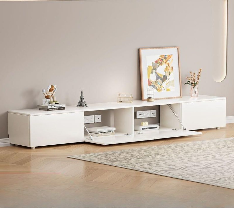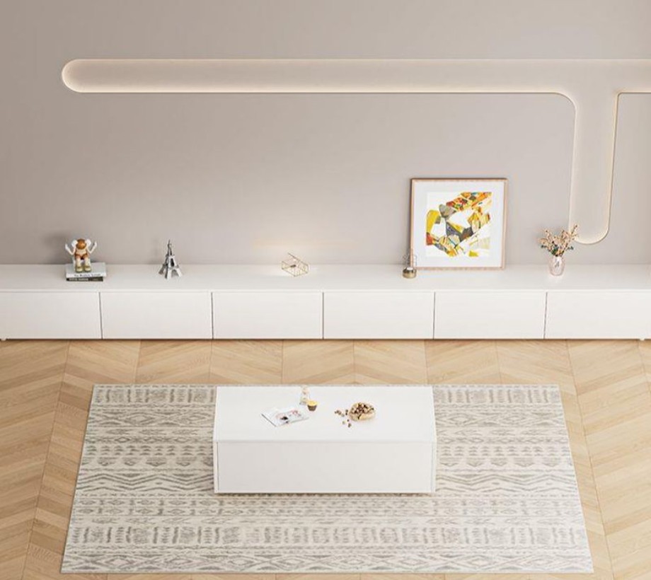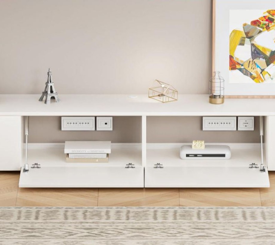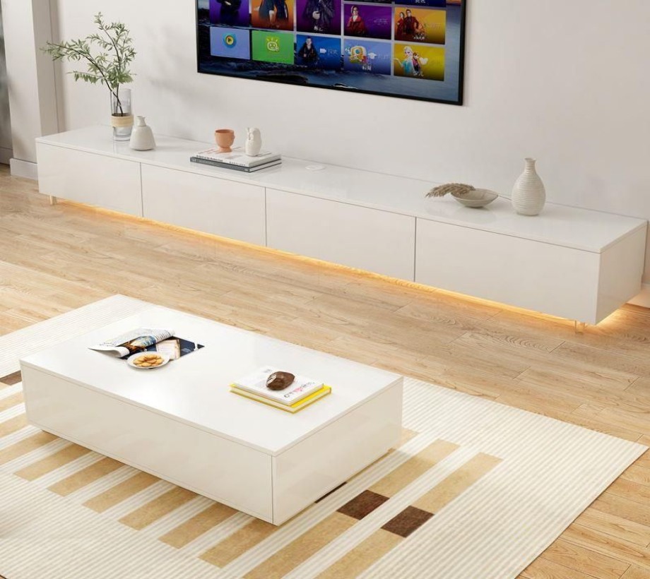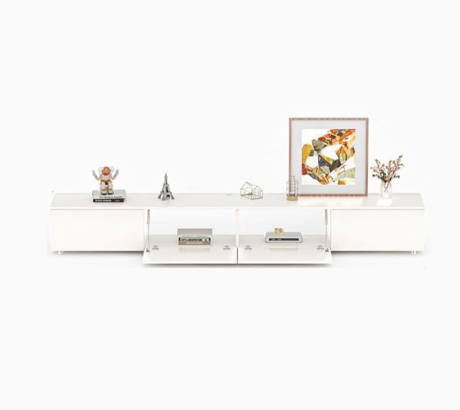 طاولة تلفزيون خشبية بتصميم عصري، مزودة بمساحة تخزين مميزة، مصنوعة من الخشب الطبيعي واللون الابيض، أنيقة وعملية، وتلبي احتياجاتك في ترتيب وتنظيم منزلك بشكل مثالي