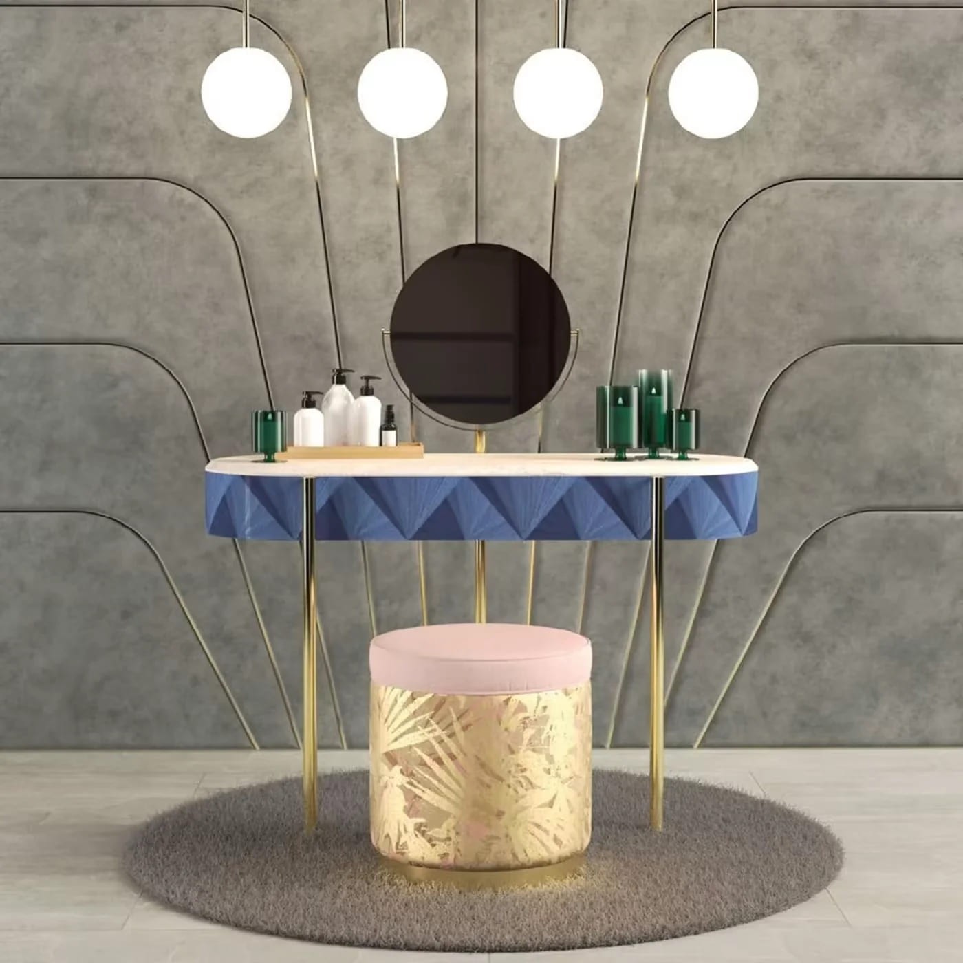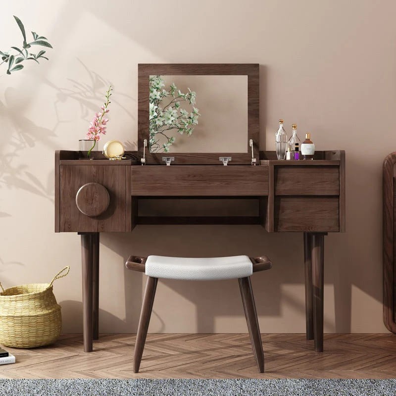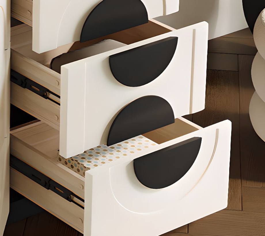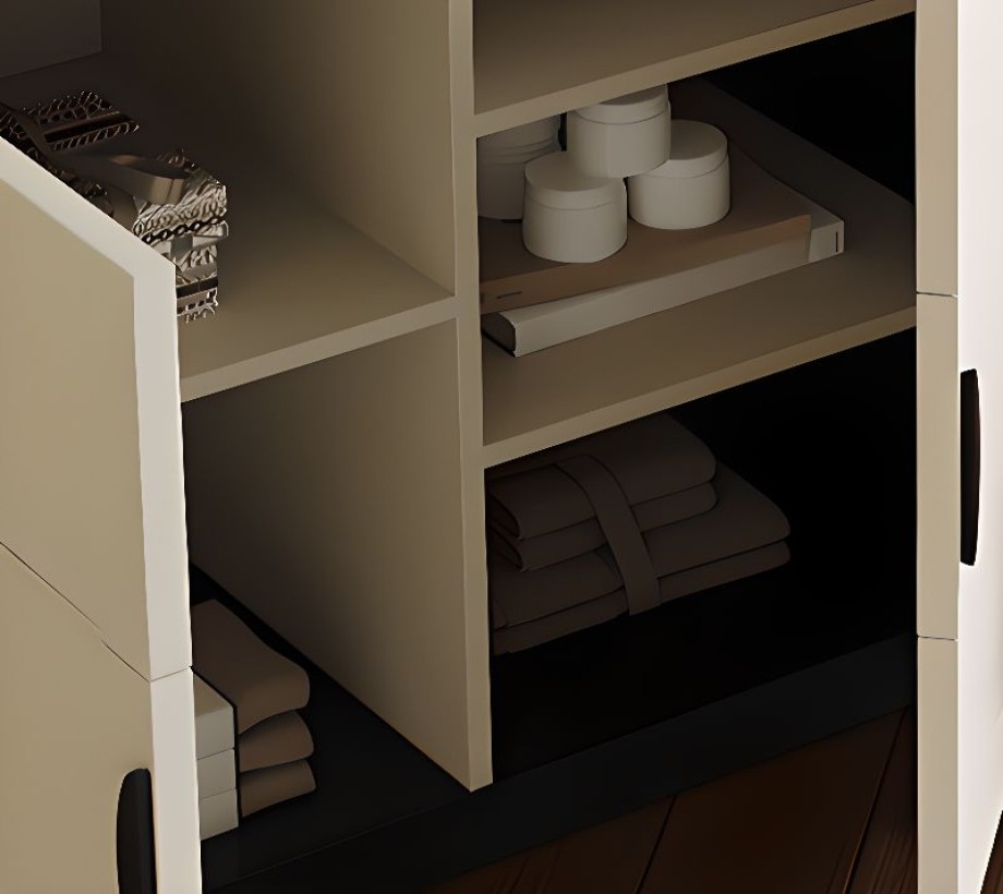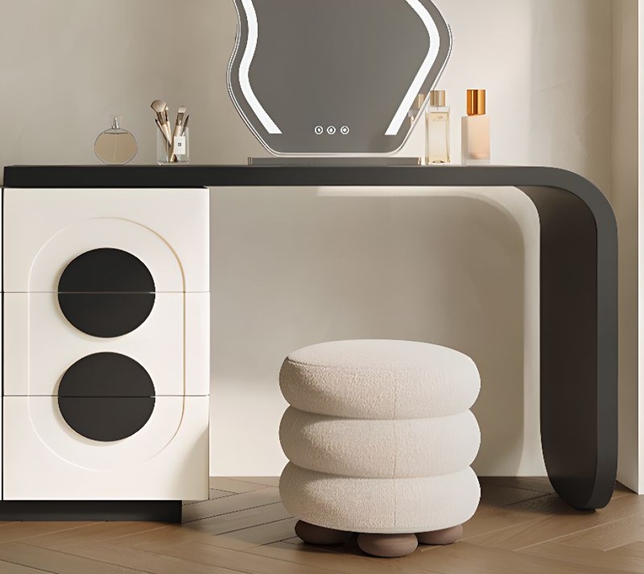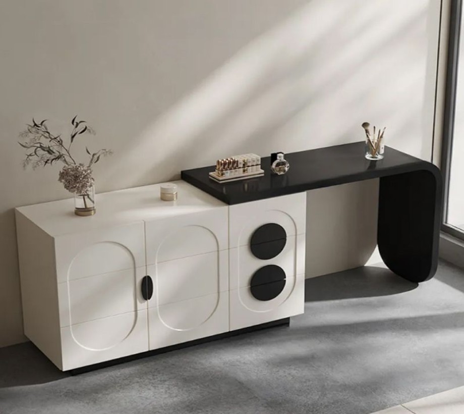تسريحة بتصميم عصري مميز باللون الأبيض الداكن مع الاسود ، مصنوعة من خشب طبيعي، وزجاج. تضفي لمسة من الأناقة والفخامة على غرفة النوم، مع مساحة تخزين عملية. مثالية لتنظيم مستلزماتك اليومية بأسلوب عصري وأنيق.