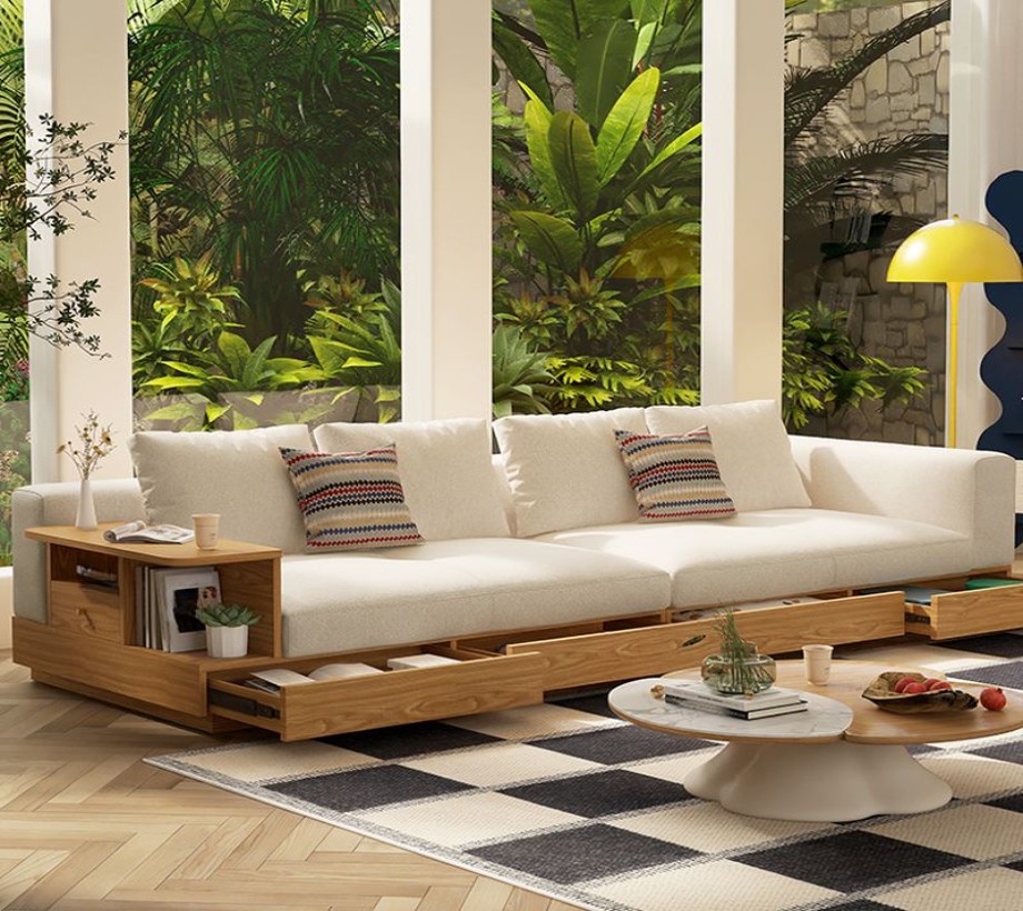 أريكة أنيقة من خشب الزان باللون الأبيض العاجي مع مساحة تخزين مخفية ووسادة قابلة للإزالة + 3 أدراج اسفل اللأريكة