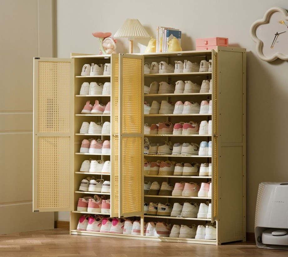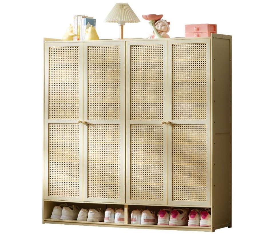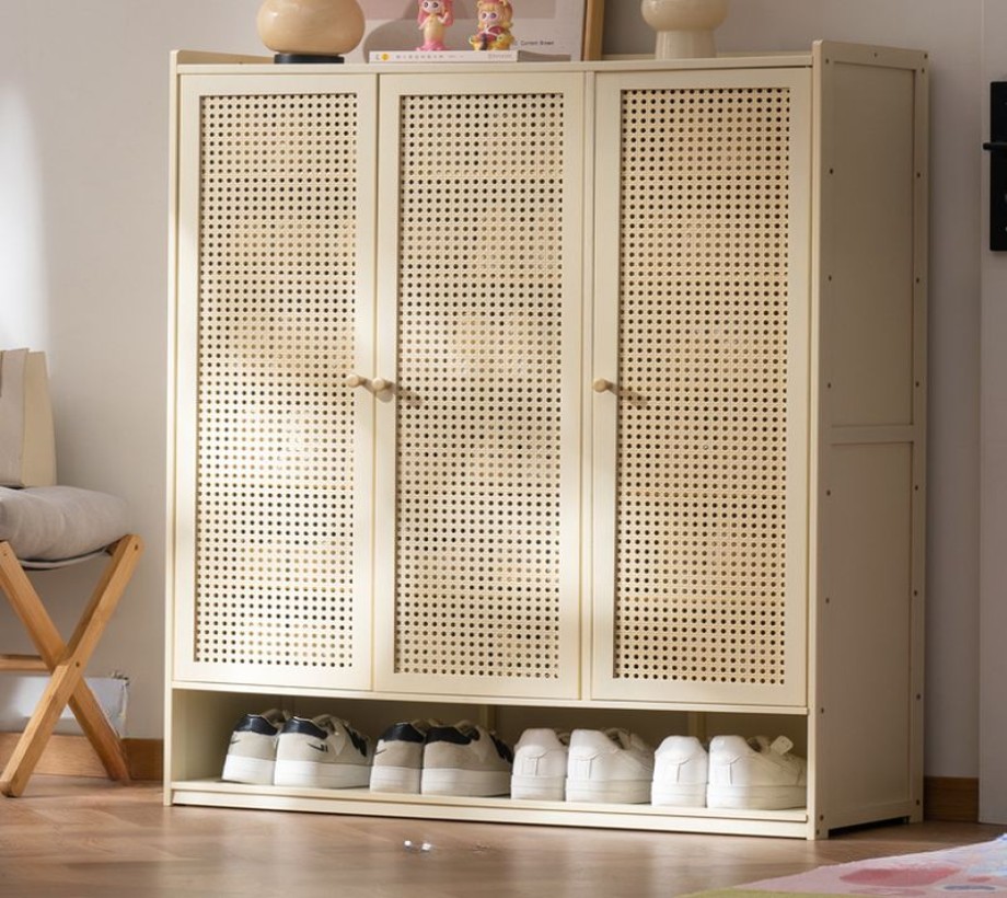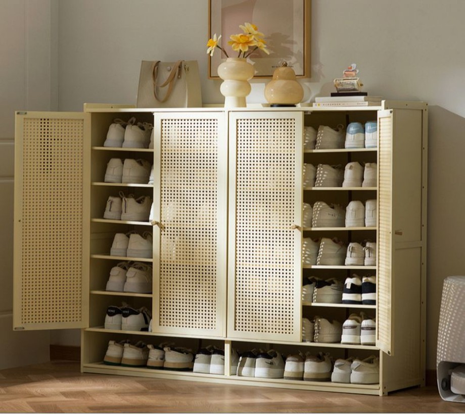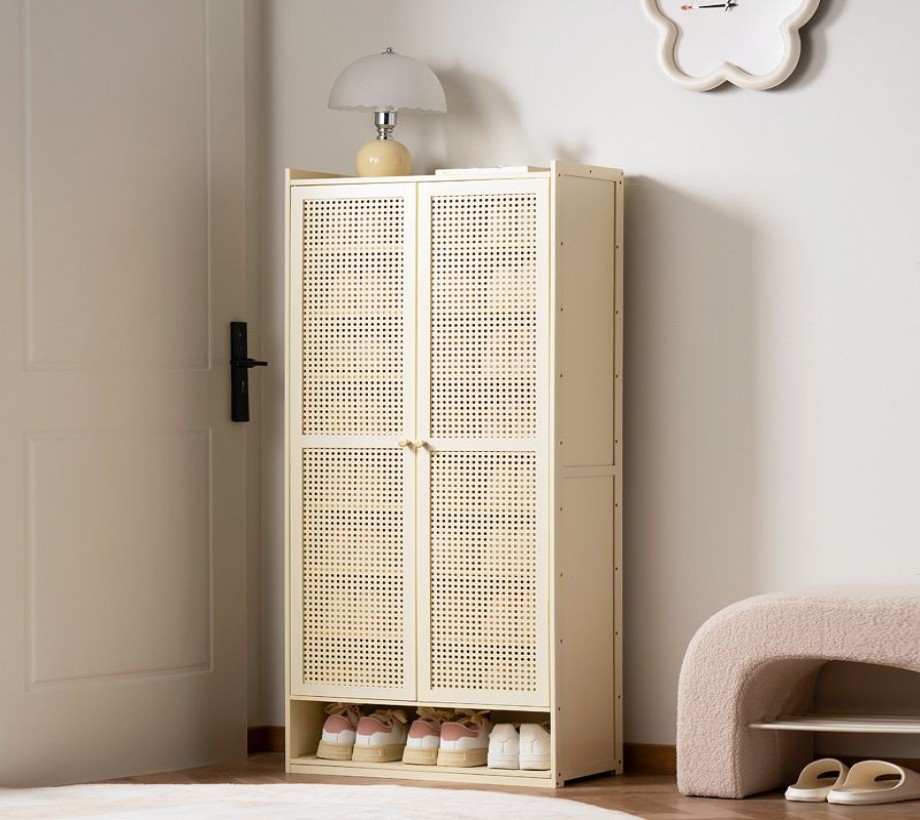 خزانة أحذية حديثة باللون البيج من خشب الروطان مع رف متغير ومساحة تخزين مكشوفة وبوابة وظهر مغلق