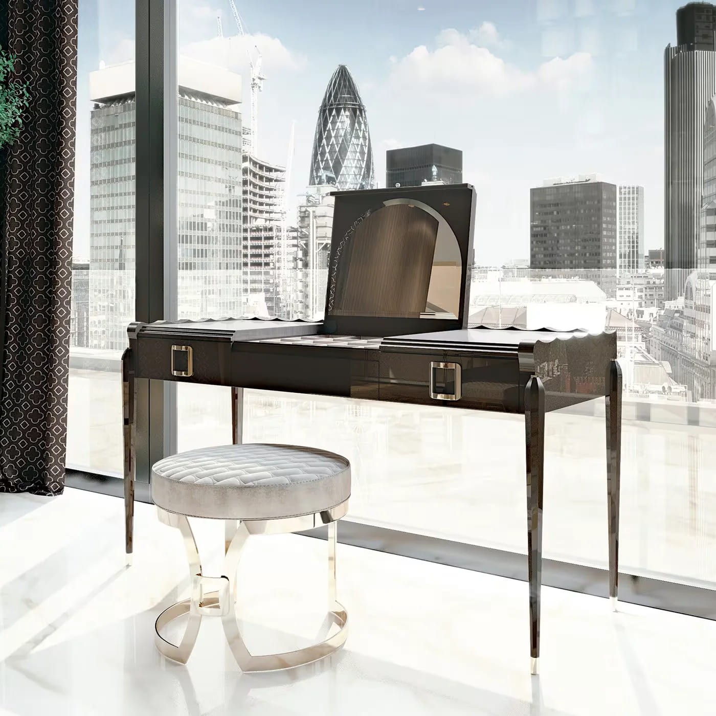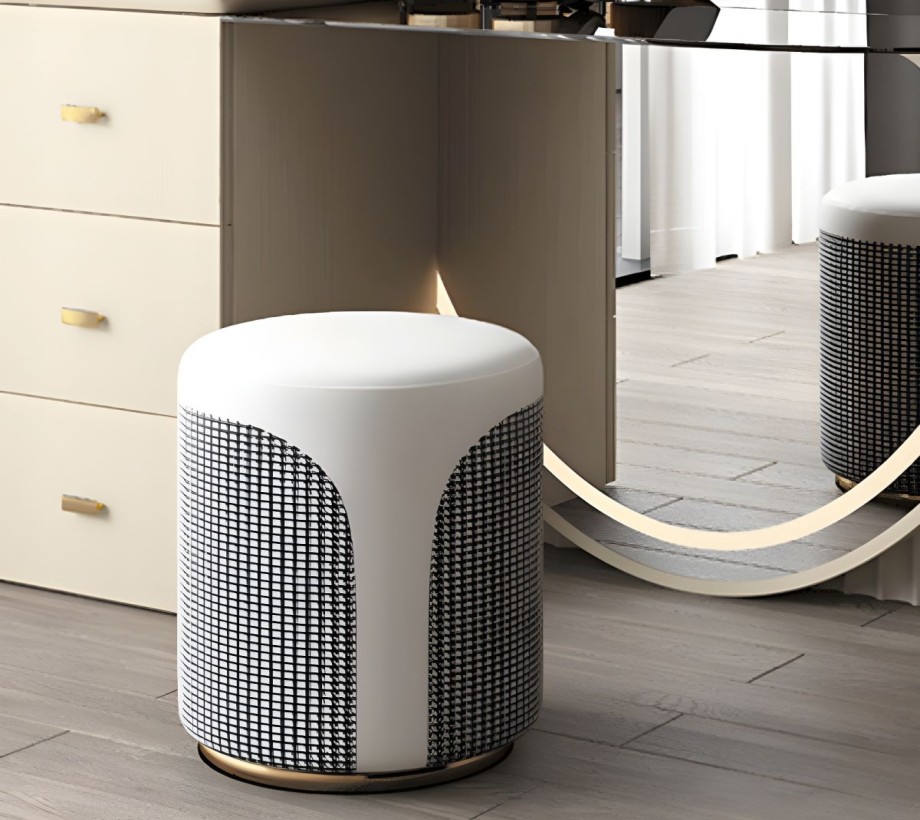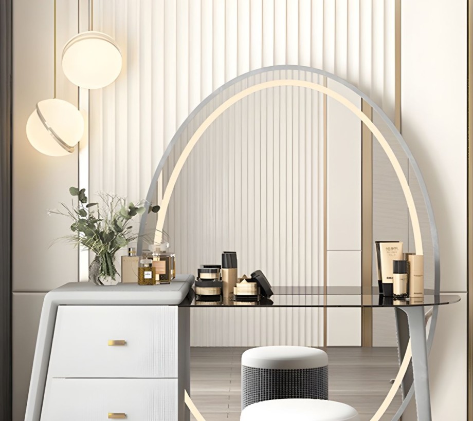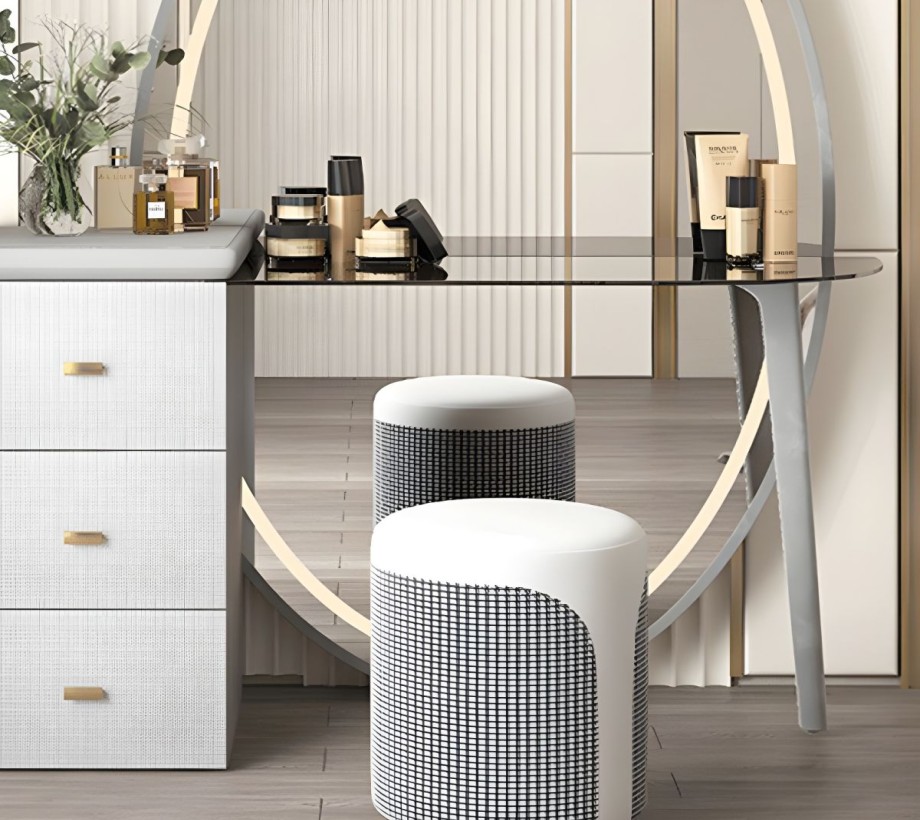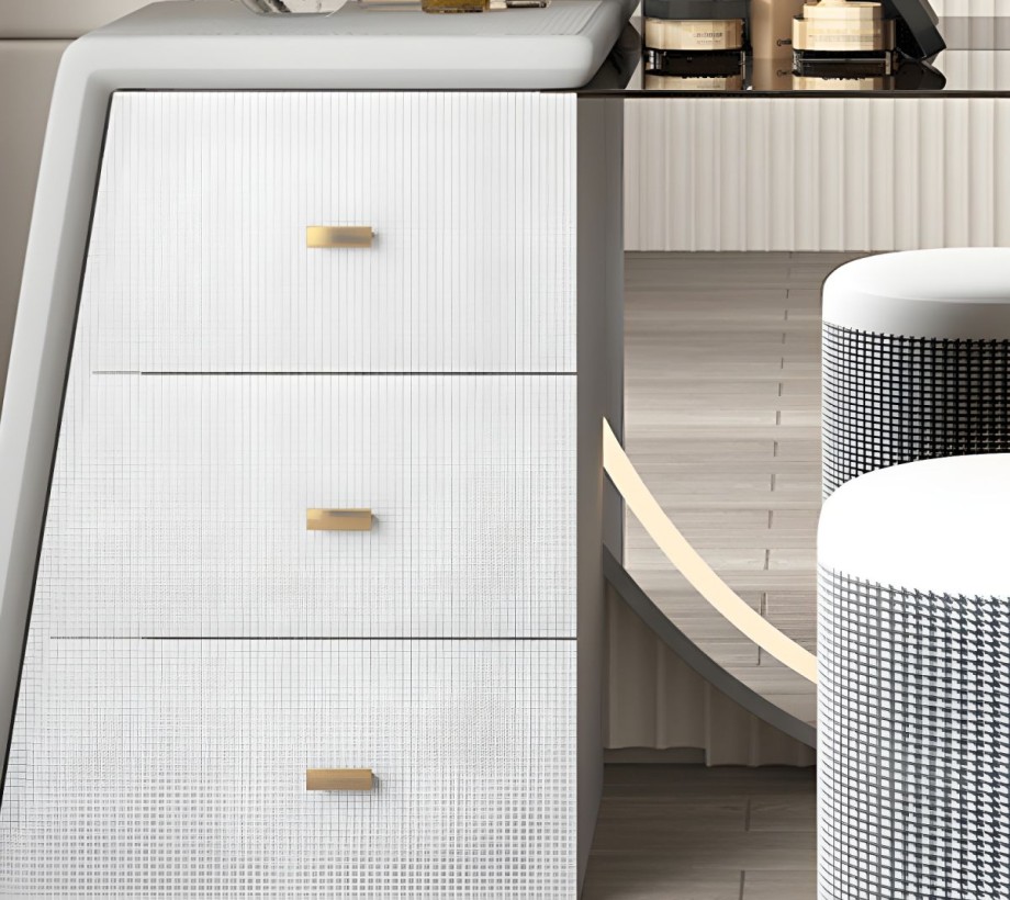 طاولة مكياج خشبية حديثة مع سطح زجاجي و3 أدراج وتجميع سهل - طاولة مكياج باللون الأبيض ومرآة قائمة تسريحة بتصميم عصري مميز مع بف باللون الابيض ، مصنوعة من خشب طبيعي، تضفي لمسة من الأناقة والفخامة على غرفة النوم، .