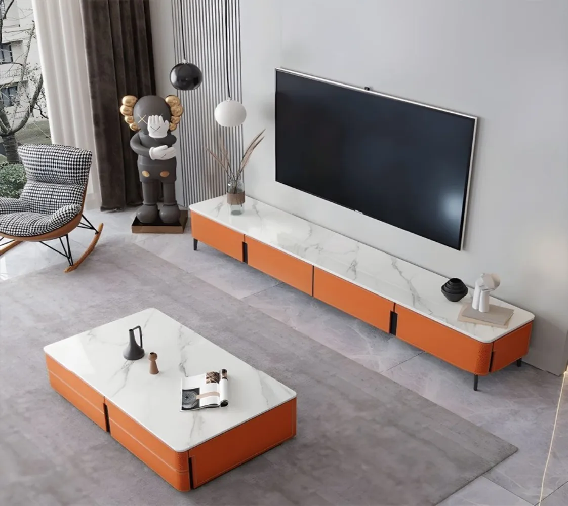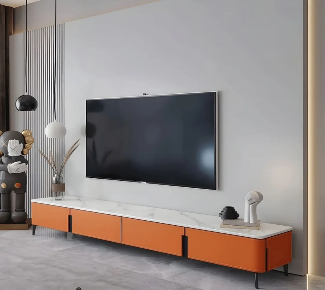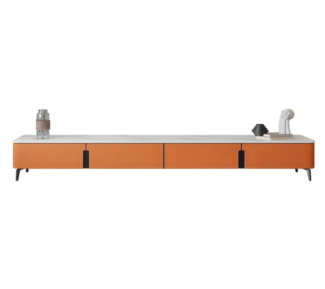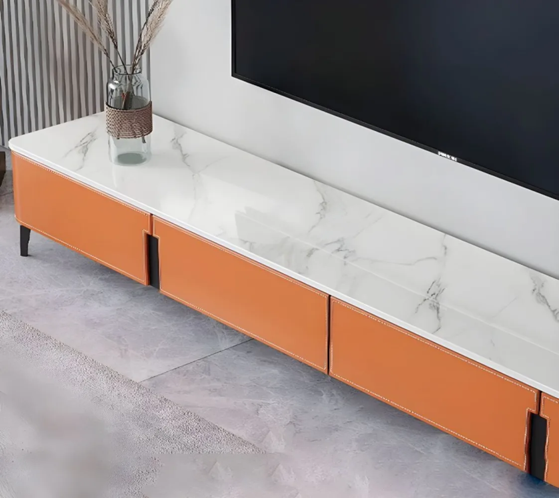 حامل تلفاز من الجلد باللون البرتقالي اللامع مع 4 وحدات تخزين، حامل تلفاز من اخشاب طبيعية