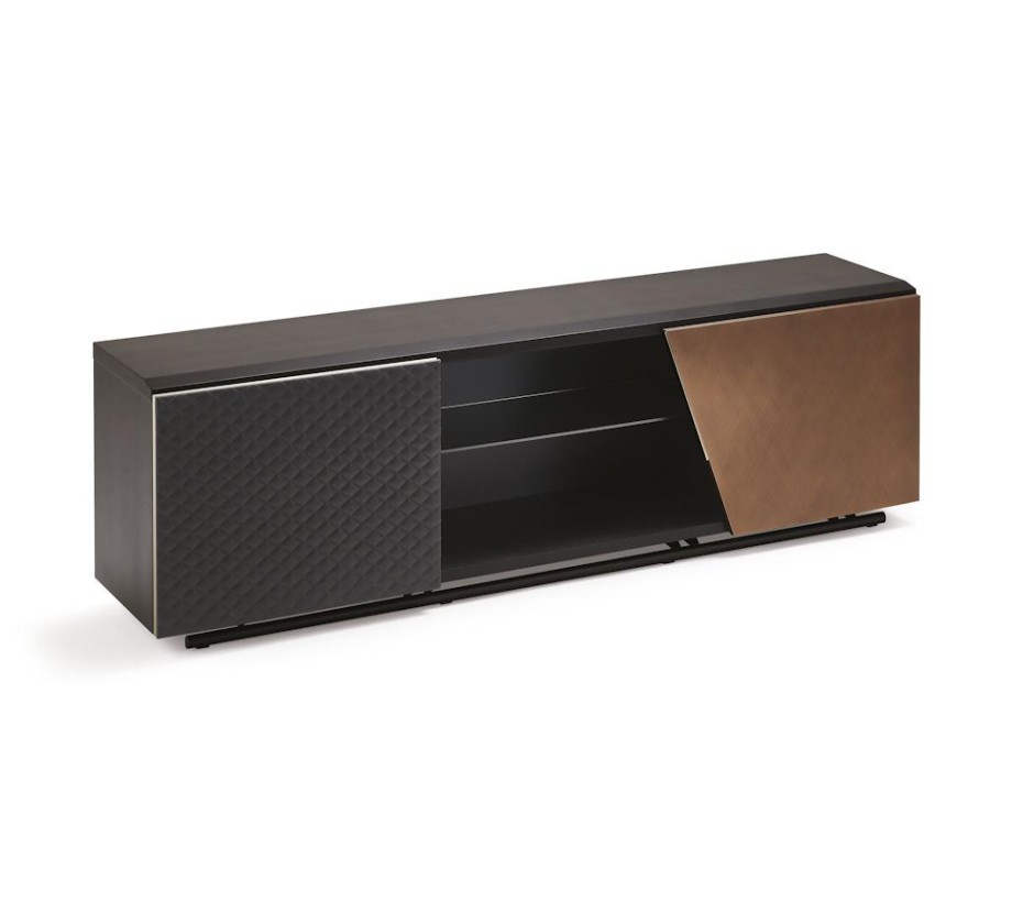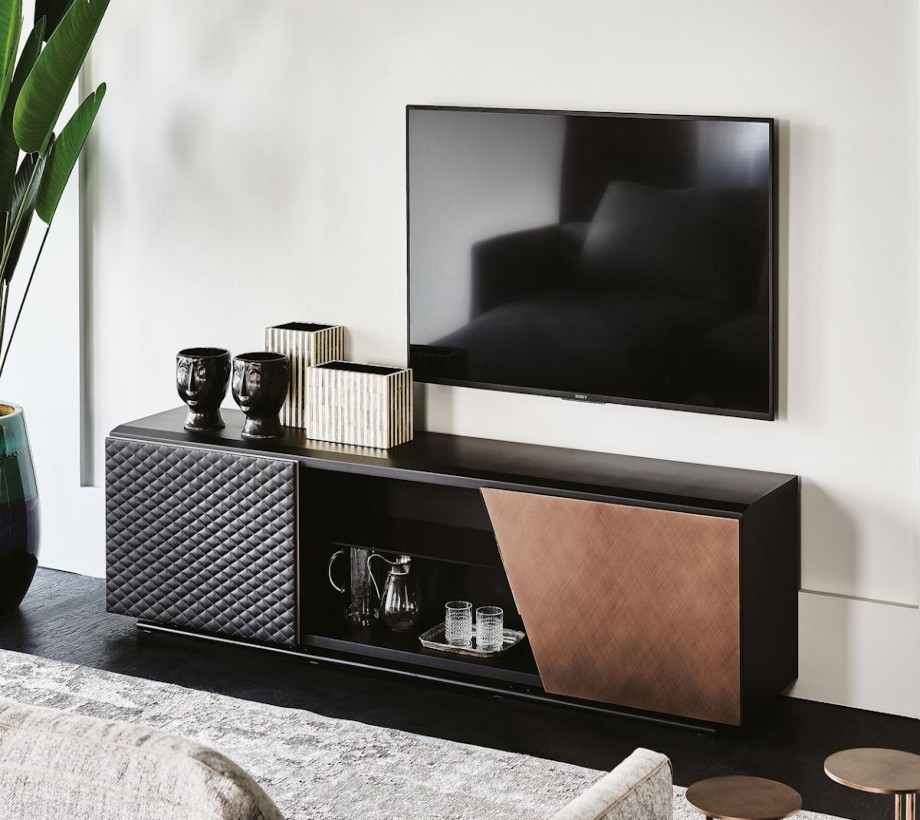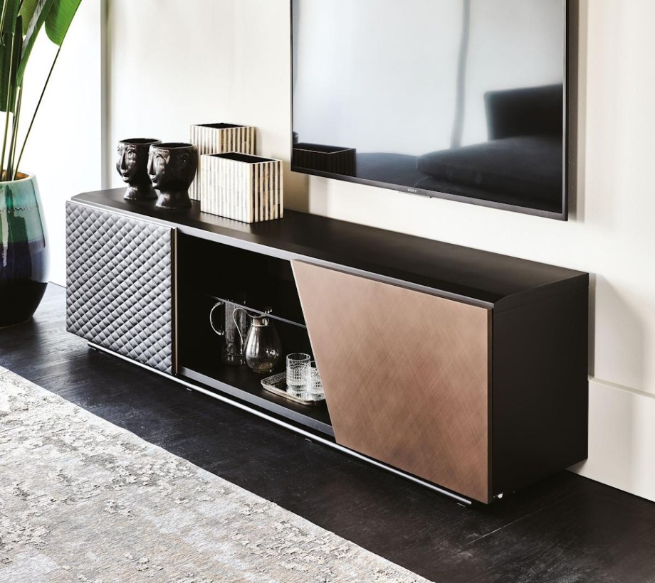ترابيزة تلفزيون خشبية عصرية تحتوي وحدة التلفزيون من باب واحد من الجلد المبطن أو الجلد الناعم وآخر إما من الخشب أو البرونز المصقول مع قسم مركزي مفتوح به مرآة. ، أنيقة وعملية، وتلبي احتياجاتك في ترتيب وتنظيم منزلك بشكل مثالي