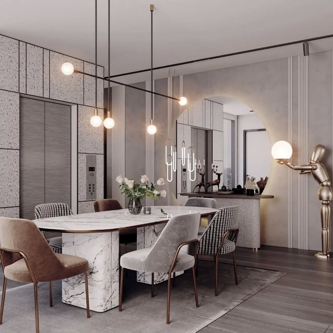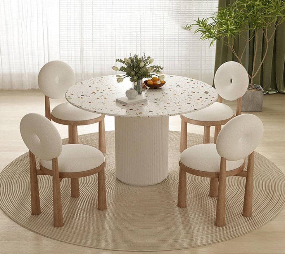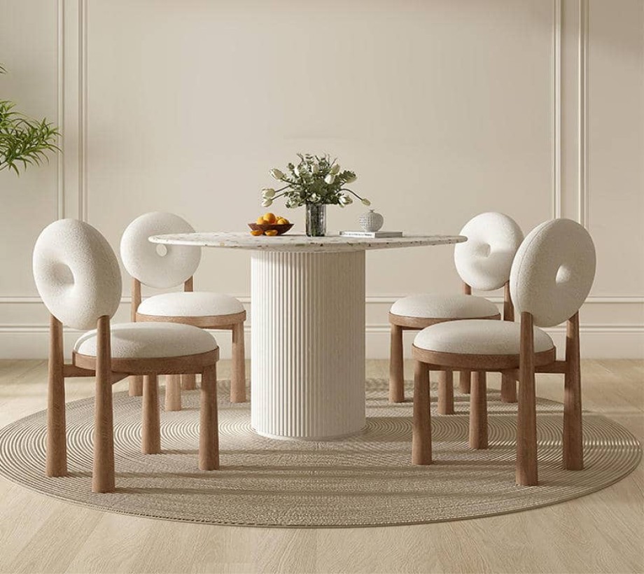طاولة طعام خشبية بتصميم عصري ، كرسي مريح بلوني خشبي غامق مع الاوف وايت. مصنوعة من خامات ذات جودة عالية مثل الخشب الطبيعي وخشب الزان ورخام عالي الجودة