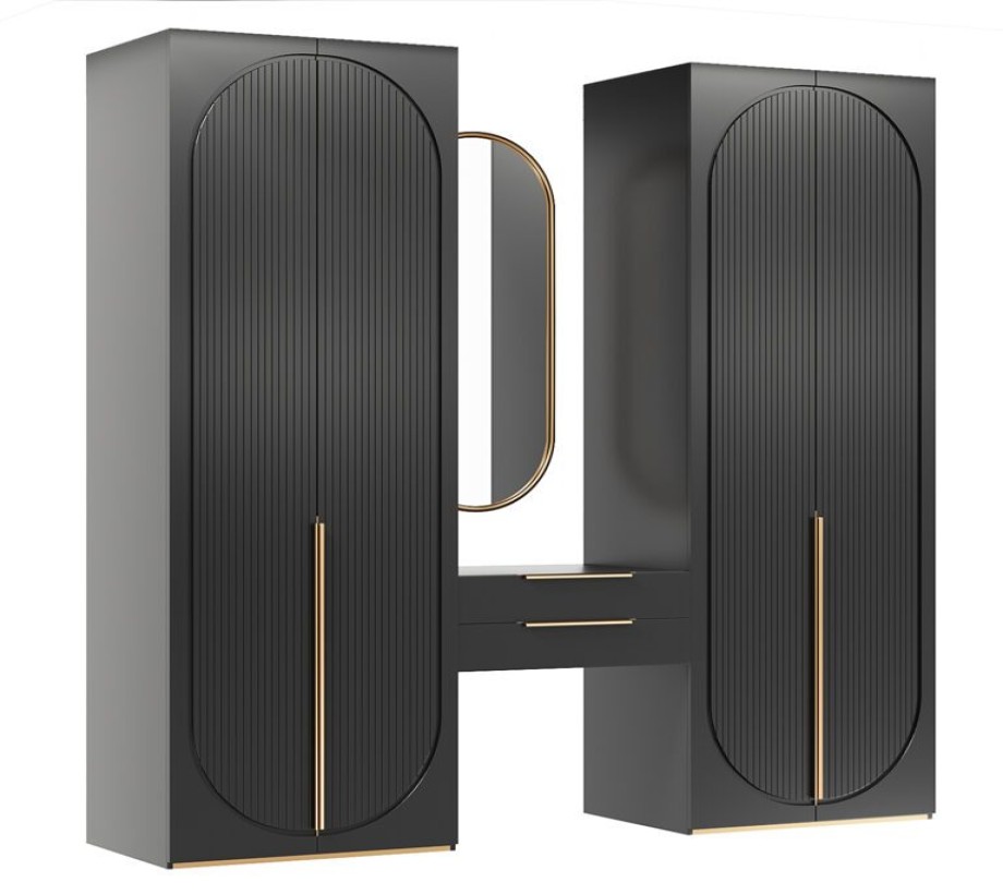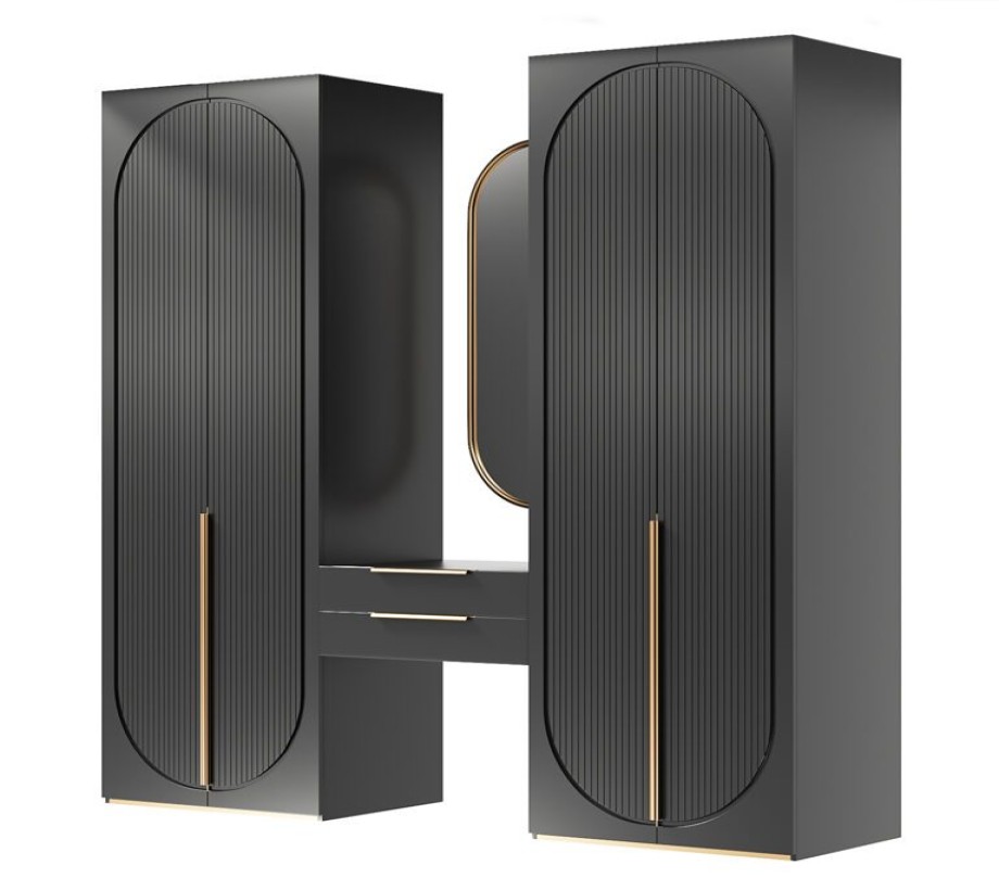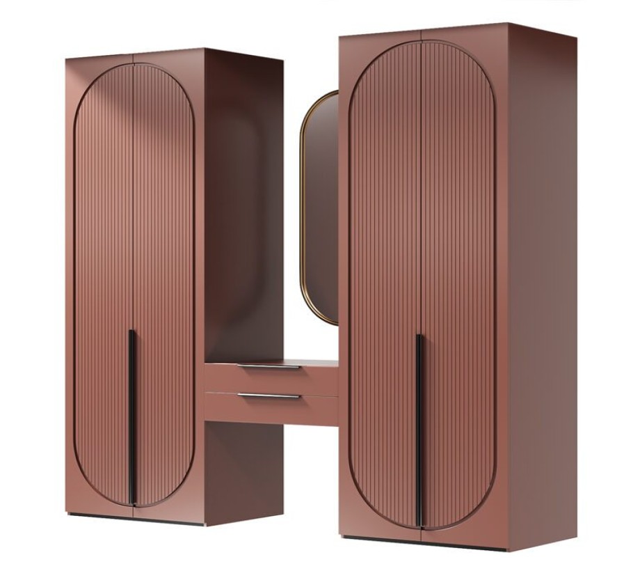 خزانة ملابس مزدوجة كبيرة، وطاولة تسريحة معلقة مع أرفف، وألواح حائط مع مرآة بيضاوية الشكل، وأرفف صندوقية ذات حجرات غير متماثلة.