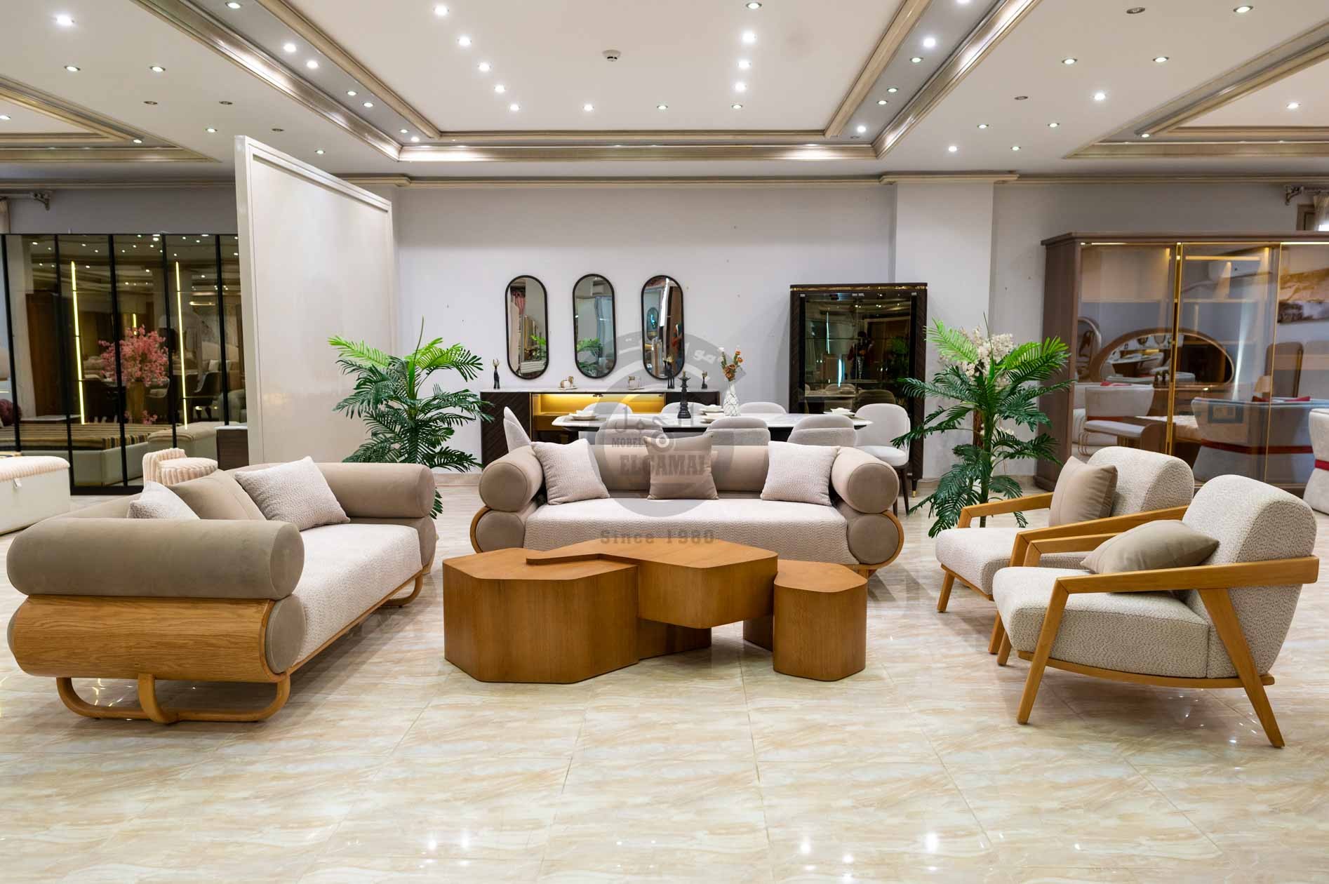 كنبه كبيرة 3 مقعد . فوتيه + بف . كنبه ثنائى 2 مقعد . 2 ترابيزة من الاخشاب الطبيعية مع ترابيزة جانبية