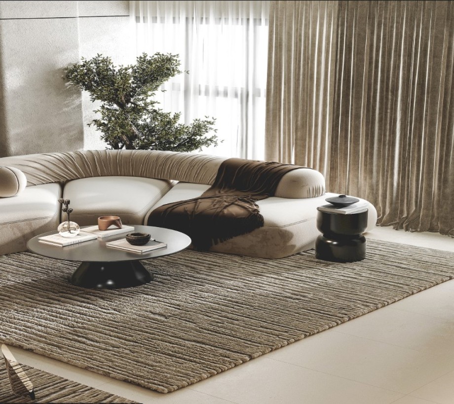 ركنة زاوية مقوسة متماثلة من اخشاب طبيعية مع بف + ترابيزة سنتر وترابيزة جانبية ، للاستخدام في مساحة غرفة المعيشة، مصنوعة من الكتان عالى الجودة