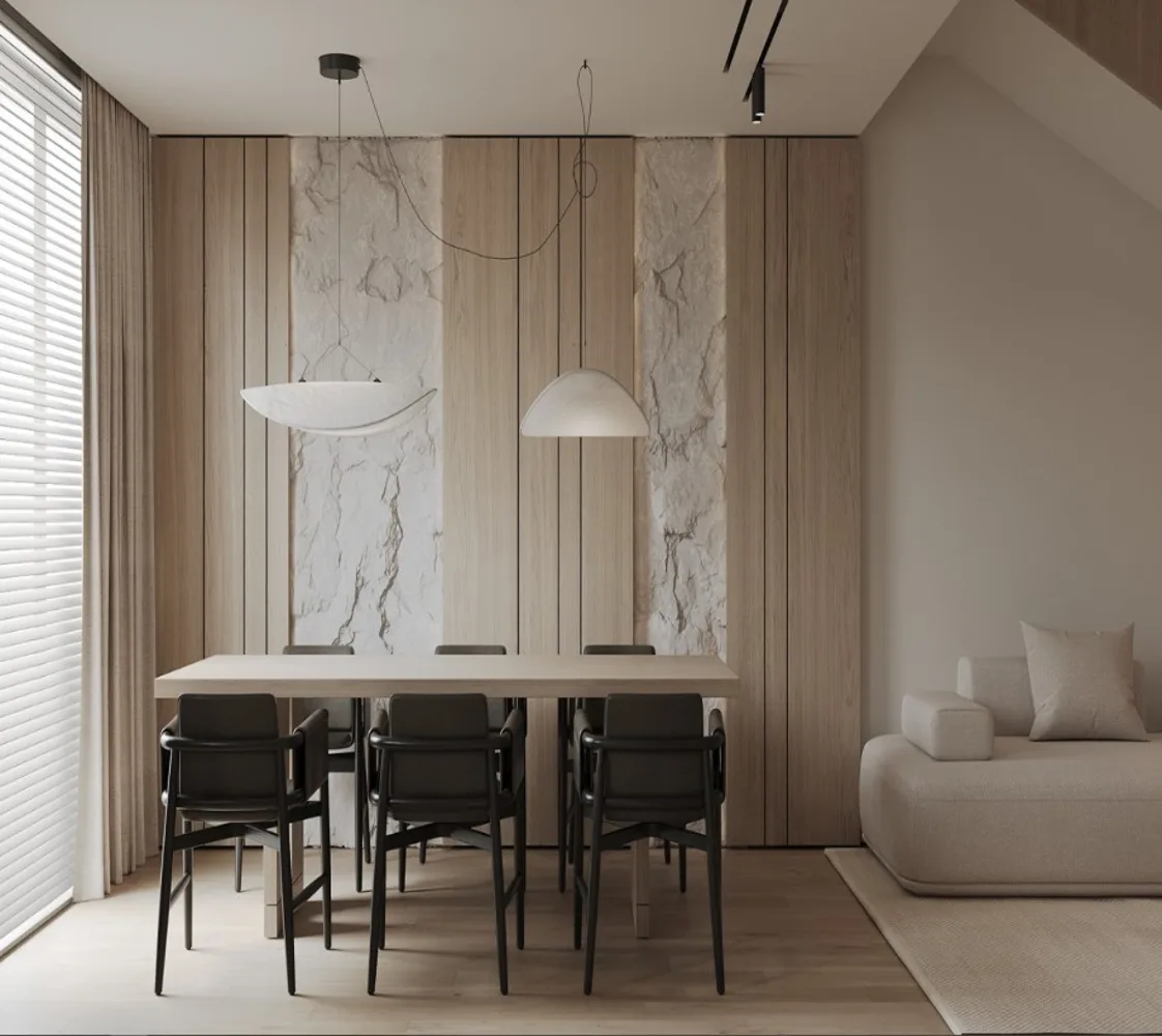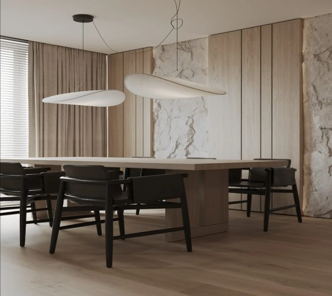 طاولة طعام خشبية بتصميم عصري ، كرسي مريح بلون أسود. مصنوعة من خامات ذات جودة عالية مثل الخشب الطبيعي وخشب الزان